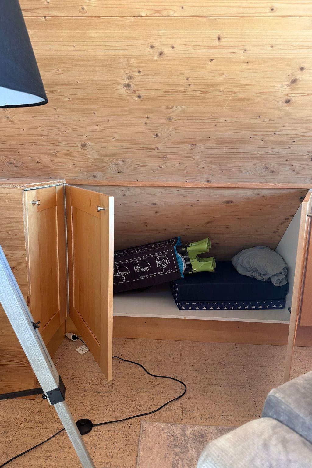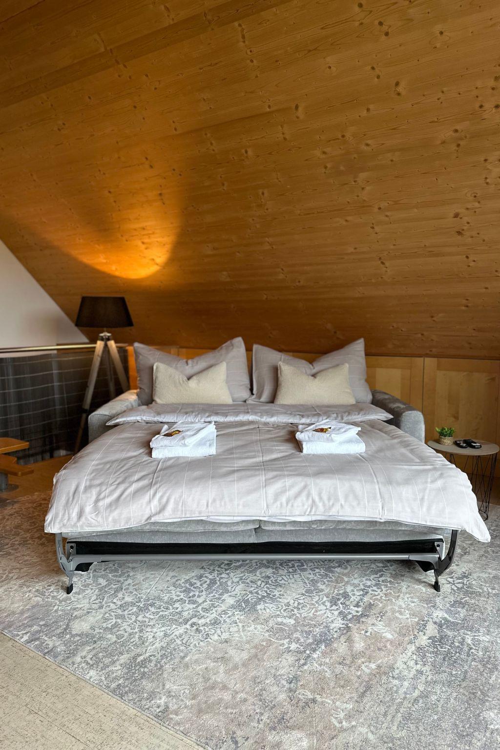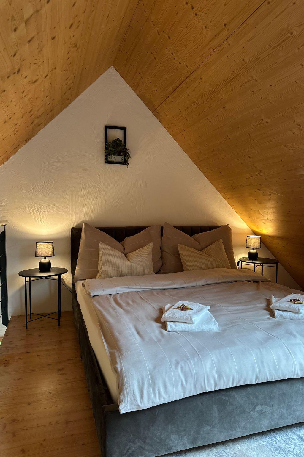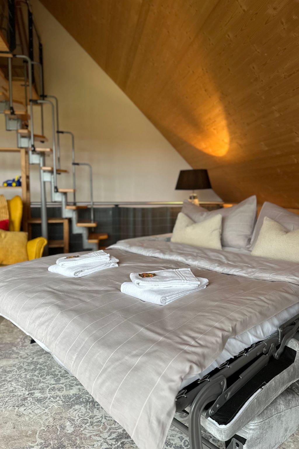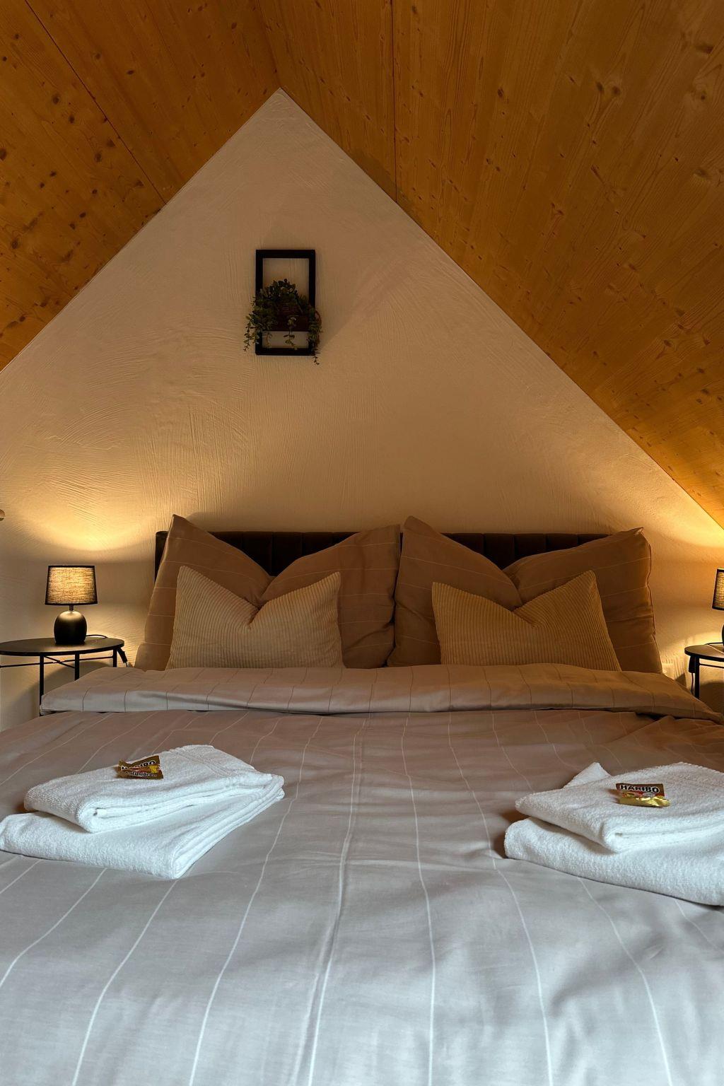 Inside, you will find cosy and inviting rooms spread over three floors. Start on the ground floor, where you will find a cosy room with a double bed. One floor up you reach the living and dining area, which offers a comfortable sofa bed for two more people as well as a dining table for six. The kitchen is fully equipped and leaves nothing to be desired for the preparation of delicious meals. The gallery is located above the living room and is also furnished with a comfortable double bed.