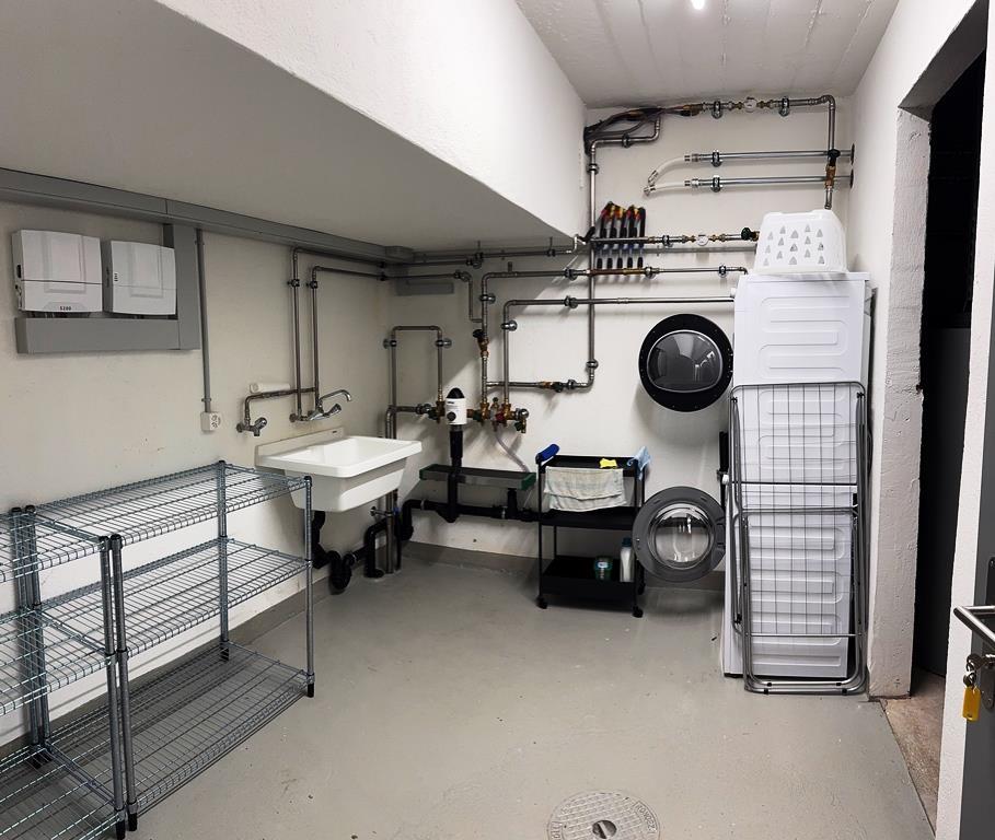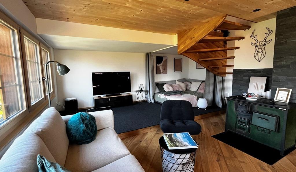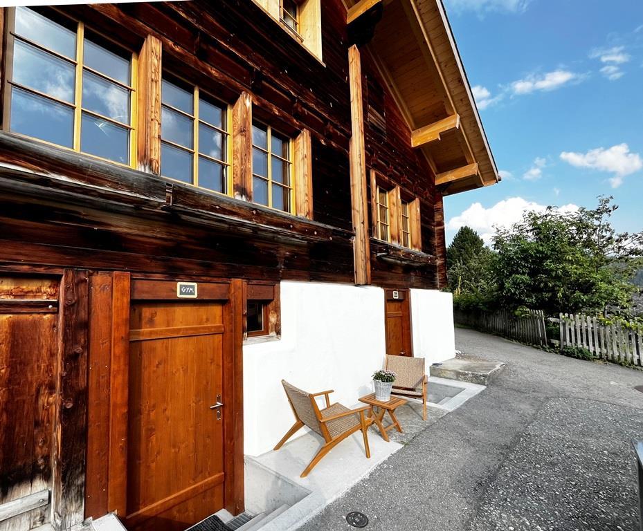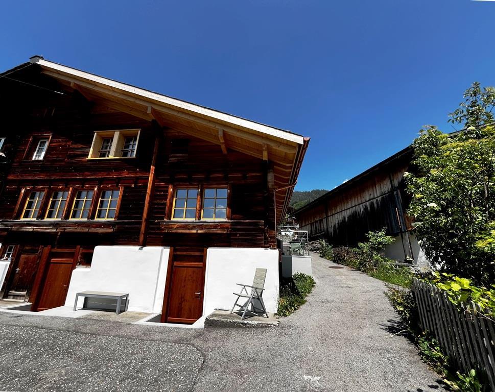 The outdoor area offers everything your holiday heart desires. A covered hatch balcony with hammock and garden seating invites you to sunbathe, read or simply take a break - with a view of the surrounding nature. A laundry room and a separate ski and storage room with direct access from the outside round off the offer. There are also two private rooms in the basement: a fitness room for sports activities and a gaming room for games and entertainment. There is a private parking lot with an electric charging station right next to the main entrance. The access road is very narrow and can only be used at your own risk. We recommend using the open parking lot Dorf 71 (HasliRent sign). It is located about 150 m before the property, directly opposite the “Dorf” bus stop. The house is quiet and sunny, ideal as a starting point for hikes, skiing days, or relaxing hours in the countryside.