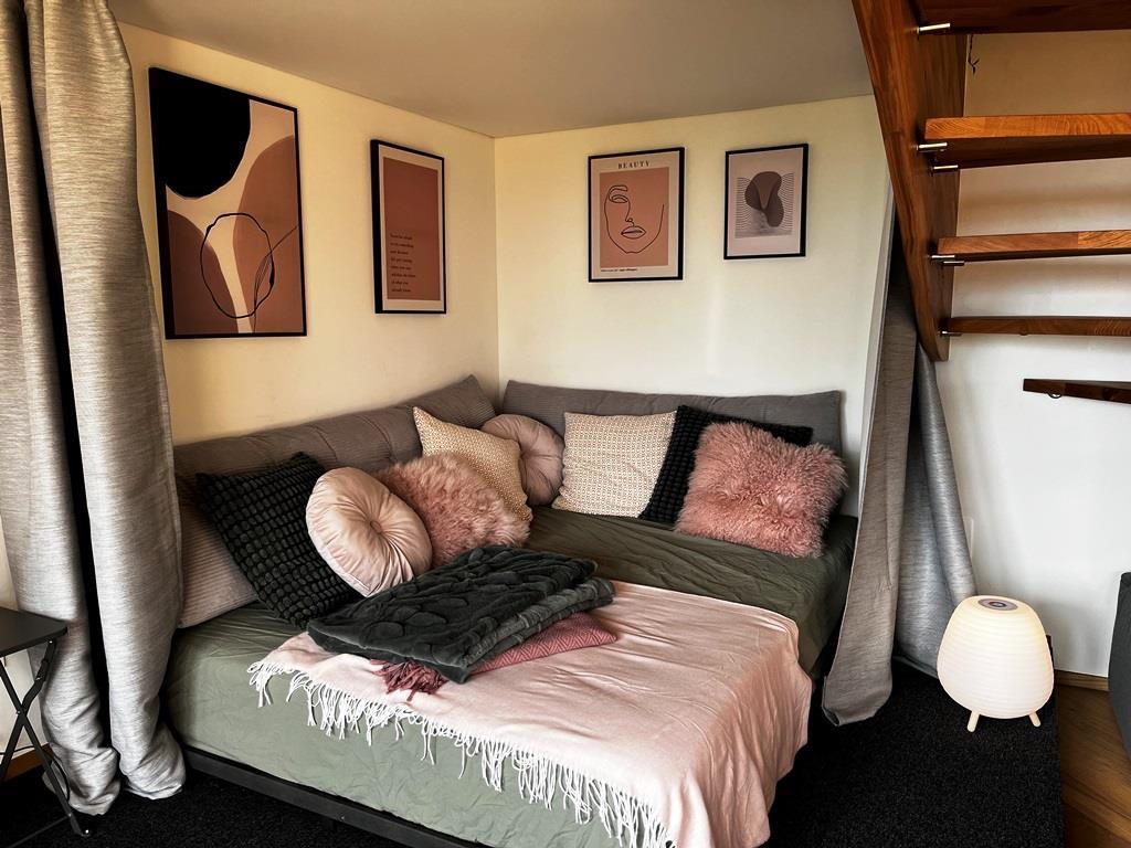 An open staircase leads up to the charming attic, where there is another sleeping area with lots of wood, light and a cozy atmosphere. A special extra is the hatch with balcony, equipped with a hammock and garden seating - here you can enjoy a good view and relaxing hours outdoors.