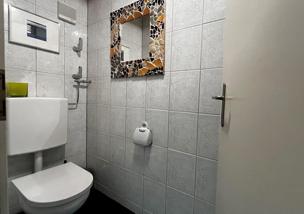 The spacious kitchen, separated by a door, offers plenty of space for cooking and socializing. It is equipped with a solid corner bench and a large wooden dining table that invites you to enjoy convivial meals. Another highlight of the apartment is the special shower with two shower fittings, which combines comfort and functionality.