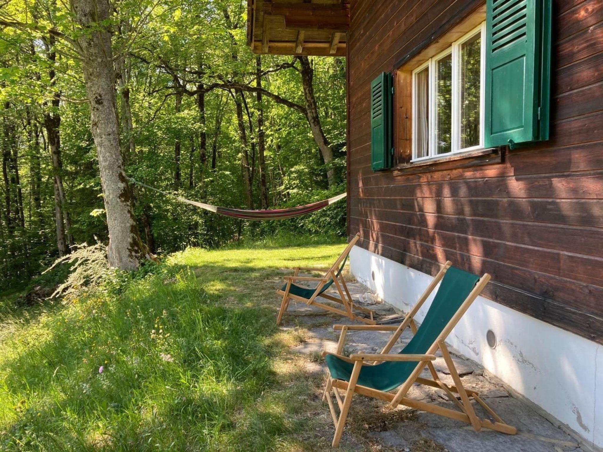 Chalet with a big conversion, especially suitable for families. 78 m2 the whole house. 3 double rooms and and cosy living room with tiled stove, large dining table and corner bench, sofa and CD player. The central wood stove is easy to use. (It is heated manually from the corridor.) New kitchen with glass ceramic stove, oven, refrigerator and dishwasher. It opens directly onto the covered furnished seating area. Renovated bathroom with shower and double sink. The WC is separately next to it. In the screed there is an additional living area/playing room with a separate additional bed. Toys and swings for children available. The chalet (built in 1950) was extensively renovated in 2011. It is situated on the edge of a protected maple forest with a beautiful view of the whole mountain panorama. With its surrounding meadows, the nearby stream, the playground in the forest, it offers children a lot of freedom of movement. For outdoor life, there is an adjoining shelter with garden furniture and games (badminton, etc.) available for use.