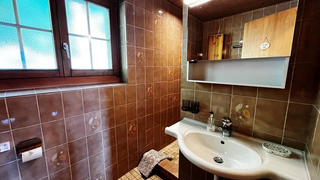 The upper 4½-room flat in the Cosy holiday home extends over two floors and offers plenty of space, light and a cosy atmosphere - ideal for families or friends. On the first floor is the entrance area with cloakroom, a master bedroom with double bed and a spacious, open-plan living room. From here you have direct access to the large balcony with a view of the Haslital mountains to the front and a side terrace that invites you to linger outdoors. The kitchen is spacious and fully equipped so that nothing is missing. The bathroom has a walk-in shower, WC and washbasin.
