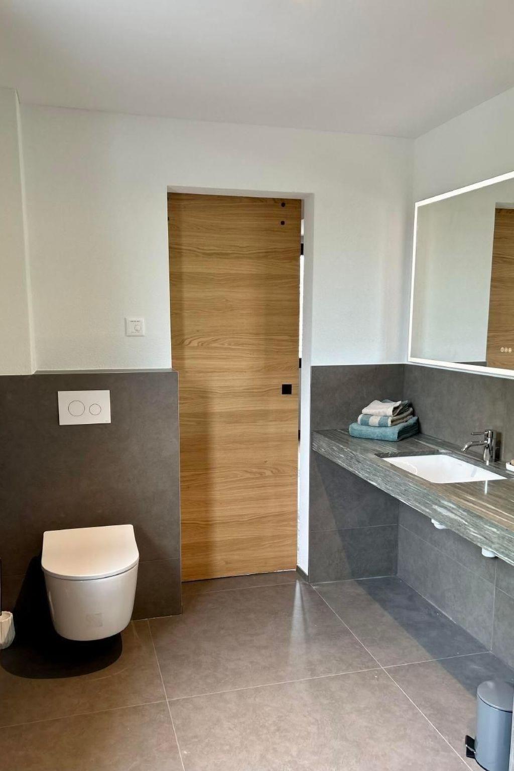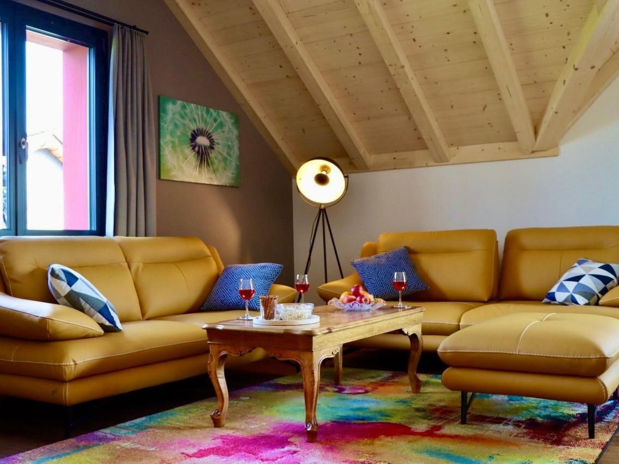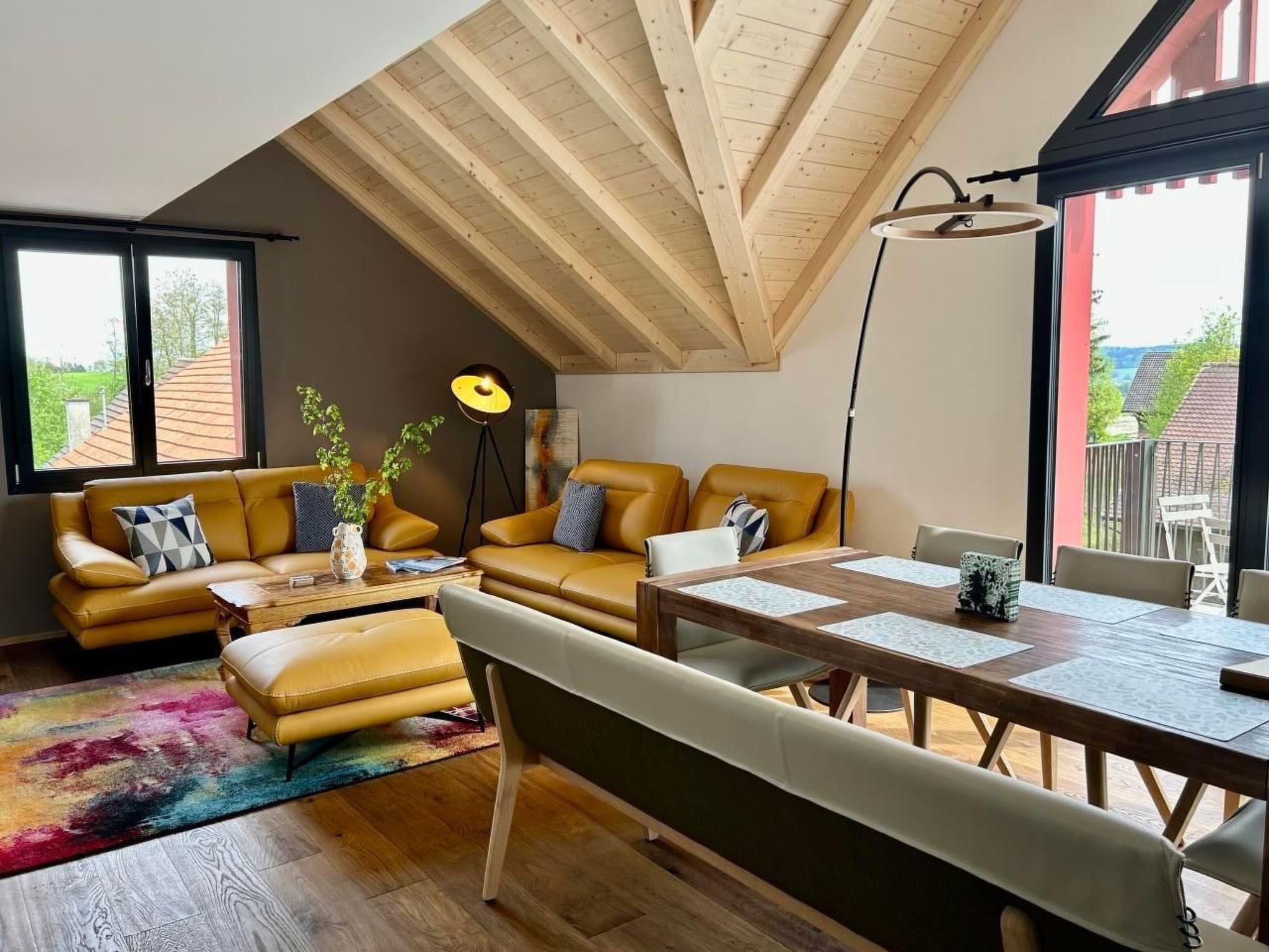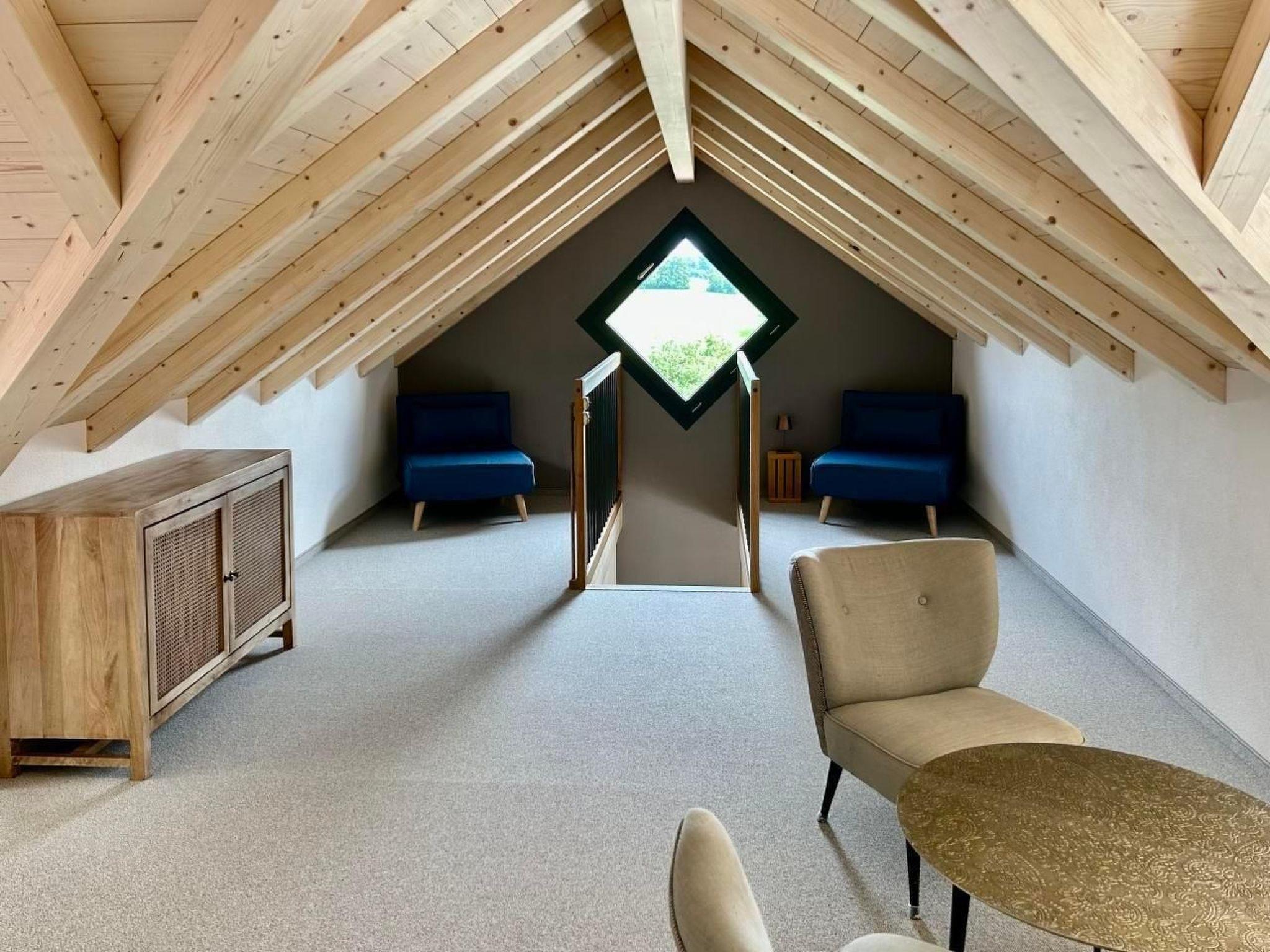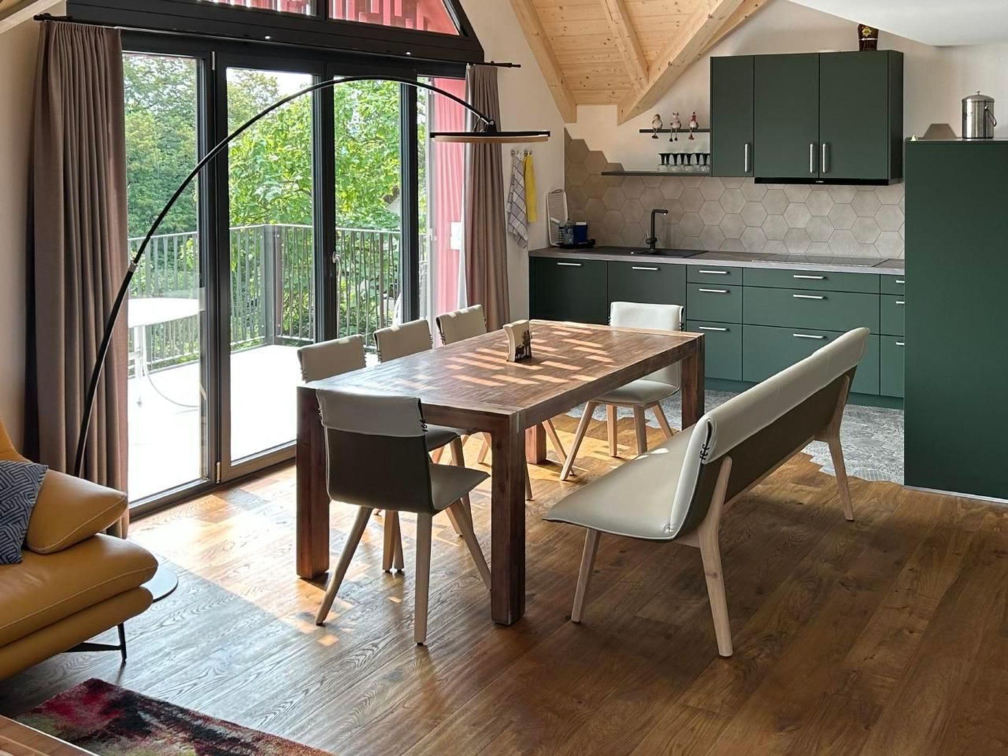 The vaulted ceilings and open-plan layout are ideal for spending time with your family or friends. The large balcony allows you to enjoy the beautiful view over the garden and the green landscape at breakfast or dinner. Weather permitting, you can see the mountains in the distance.