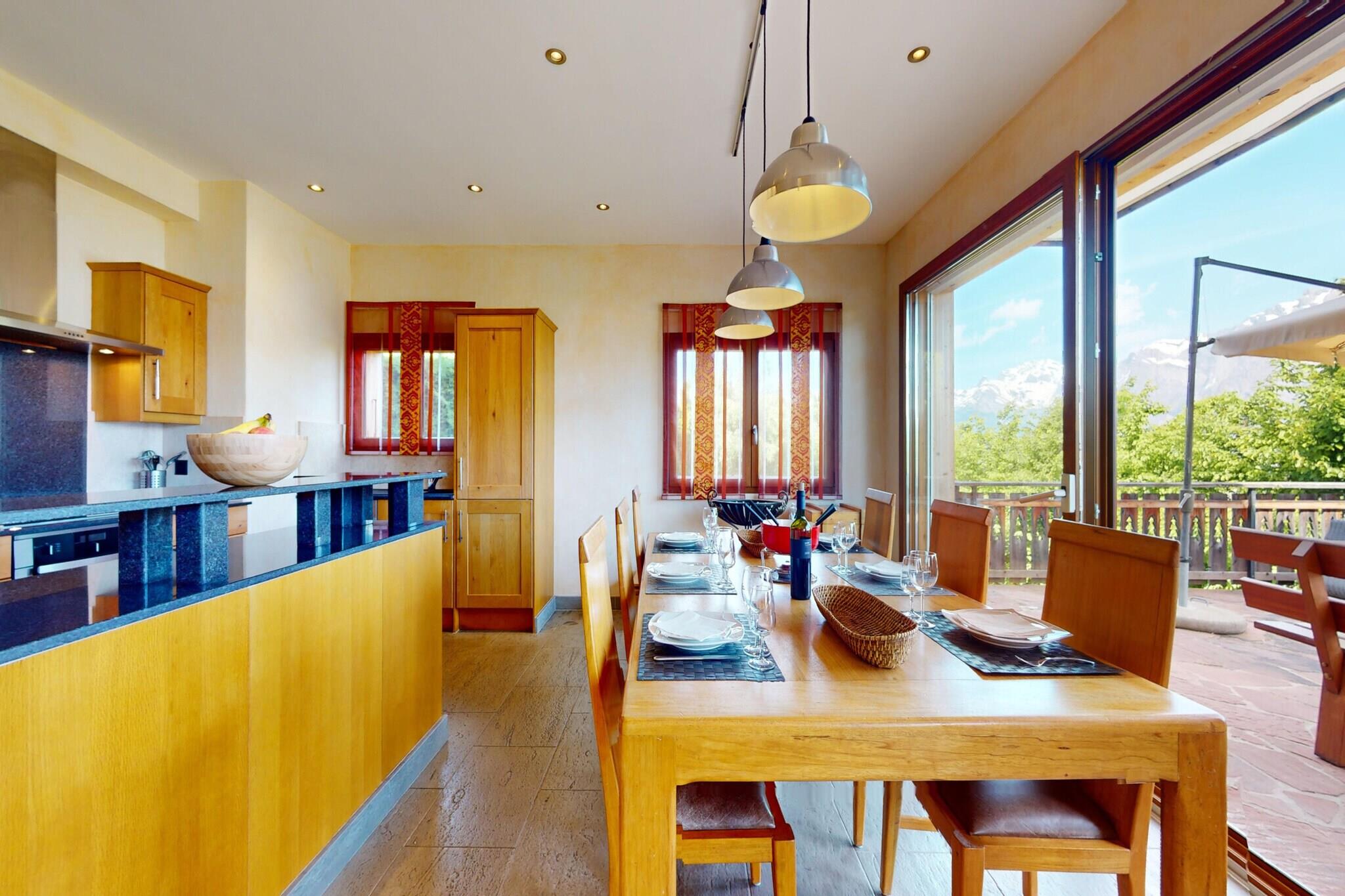 Discover the luxurious Chalet, nestled in the picturesque resort of Nendaz, Switzerland. Accommodating up to 10 guests, this stunning chalet boasts breathtaking mountain views, a large terrace, and an indoor pool, making it the perfect retreat in the heart of the 4 Vallées. Spanning 400 m², the chalet features a bright and spacious living room with a cozy fireplace, a home video system, and complimentary Wi-Fi throughout. The fully equipped open kitchen includes modern appliances such as a large fridge, induction hob, and Nespresso machine, ideal for preparing meals to enjoy with family and friends. Located in a quiet residential area, Chalet Axaari is just a 10-minute walk from shops and restaurants and 1.6 km from the cable car and ski slopes, with a free shuttle bus available in winter. Chalet includes five well-appointed bedrooms, each designed for comfort. Bedrooms 1 and 2 feature double beds and en-suite bathrooms, while Bedrooms 3 and 4 have two single beds each and share a bathroom. The fifth bedroom includes a bunk bed, two cots, and a high chair, perfect for families. Step outside to a 50 m² furnished terrace, ideal for relaxing or barbecuing while taking in the stunning views. The expansive garden offers ample space for outdoor play, featuring a swing and slide for children. The indoor pool, equipped with a star ceiling and sound system, provides a unique relaxation experience. Indulge in a memorable stay at Chalet Axaari, where luxury meets comfort. Welcome home!