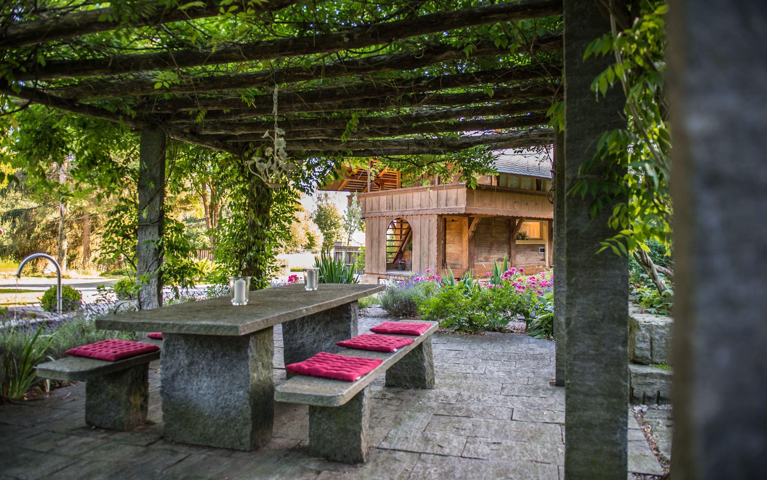 Outside the Spychers there is a spacious garden with a pergola for shared use, various small seating areas and a deckchair, ideal for relaxing and enjoying the peace and quiet. A car park right next to the house completes the offer. The interior was carefully modernised in 2020, while respecting and preserving the original character of the Spycher.