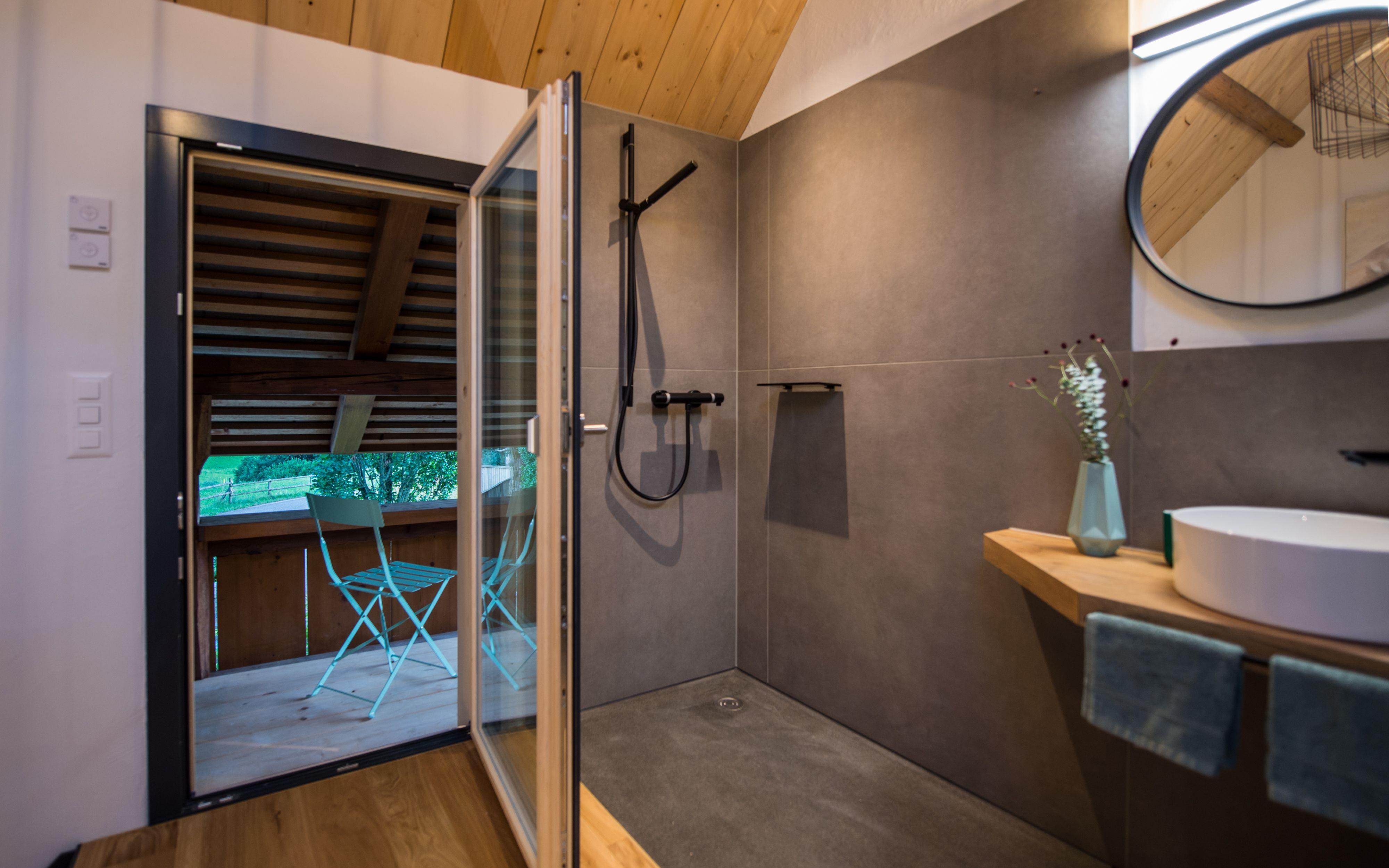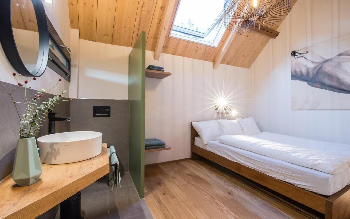 Inside, a modern kitchen-cum-living room on the ground floor is equipped with everything your heart desires: two hotplates, a small dining table for up to 4 people, a Nespresso coffee machine, fridge, separate freezer compartment, dishwasher and various kitchen utensils invite you to linger and enjoy. The upper floor accommodates a cosy double bed (1.60 x 2 m), a practical clothes rack with hanger and a sideboard with reading lamps. The bathroom, which is open to the bedroom, boasts modern fittings, including a toilet, a floor-level shower and a washbasin with mirror. Bed linen as well as hand and bath towels are of course provided.