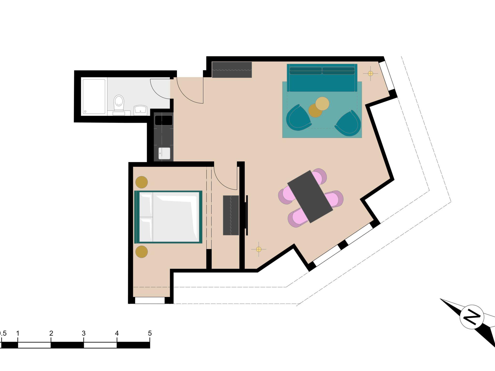 The modern, air-conditioned flat (43 m2) on the 4th floor offers space for up to 4 people. Thanks to the successful combination of stylish elements and a warm, inviting atmosphere, the flat creates a pleasant feel-good ambience.