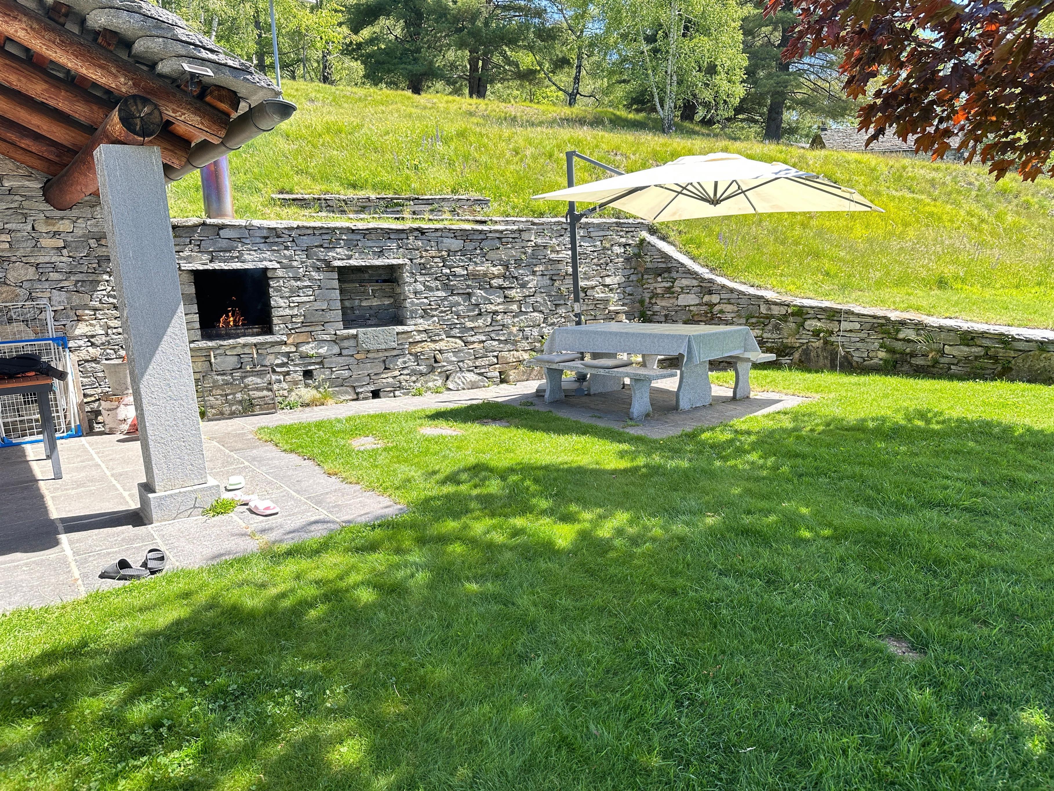 Entirely renovated rustico with an unobstructable view over the Centovalli to Monte Rosa. Large terraced lawn. 3 minutes from the Verdasio-Comino cable car. Restaurant and grotto 3 minutes away. The Comino mountains are 1200 m a.s.l. and can be reached in 6 minutes by cable car or on foot in 1 hour. The mountain is also the crossroads of many footpaths.Completely renovated rustic house (90m2). Ground floor: large eat-in kitchen with fridge and gas boiler, fireplace, satellite TV, radio; shower/WC. 1st floor: 2 bedrooms (2-3 beds each). Outside: large garden with granite table and grill. Solar-powered electricity.