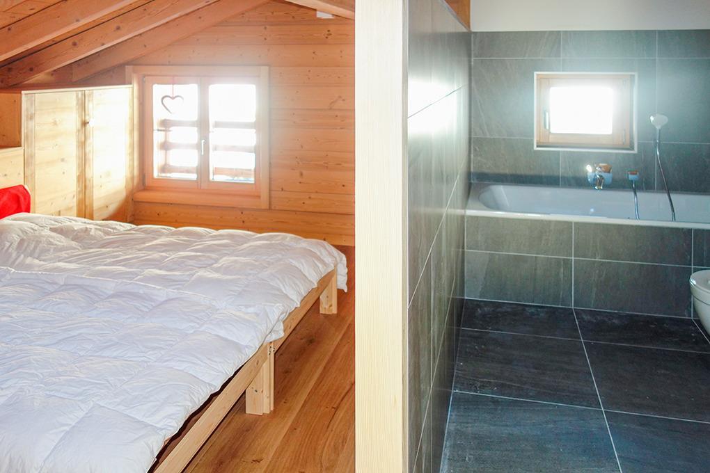 CH 383.70 Wohnung 4-6 Pers.: 3-Zimmerwohnung mit 73 qm Wohnfläche über 2 Etagen. 2. Etage: Zwei Doppelzimmer. Bad: Bw/Du, Wb, WC. Dachgeschoss mit Schrägen: Wohnraum mit Couchgarnitur (Schlafsofa 2 Pers.), TV, Esstisch, Einbauküche (Backofen, Mikrowelle, Spülmaschine). Bad: Du, Wb, WC.