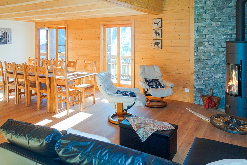 CH 383.71 Wohnung 8-10 Pers.: 5-Zimmerwohnung mit 160 qm Wohnfläche über 2 Etagen. 2. Etage: Großzügiger Wohnraum mit gemütlicher Sitzgruppe (Schlafsofa 2 Pers.), Kaminofen, TV, Esstisch, Einbauküche (Backofen, Mikrowelle, Spülmaschine), Balkon. Zwei Doppelzimmer mit Bad (Du bzw. Bw, Wb, WC). Dachgeschoss mit Schrägen: Zwei Doppelzimmer mit Bad (Du bzw. Bw, Wb, WC). Balkon mit schönem Blick ins Tal und zum gegenüberliegenden Ort La Tzoumaz.