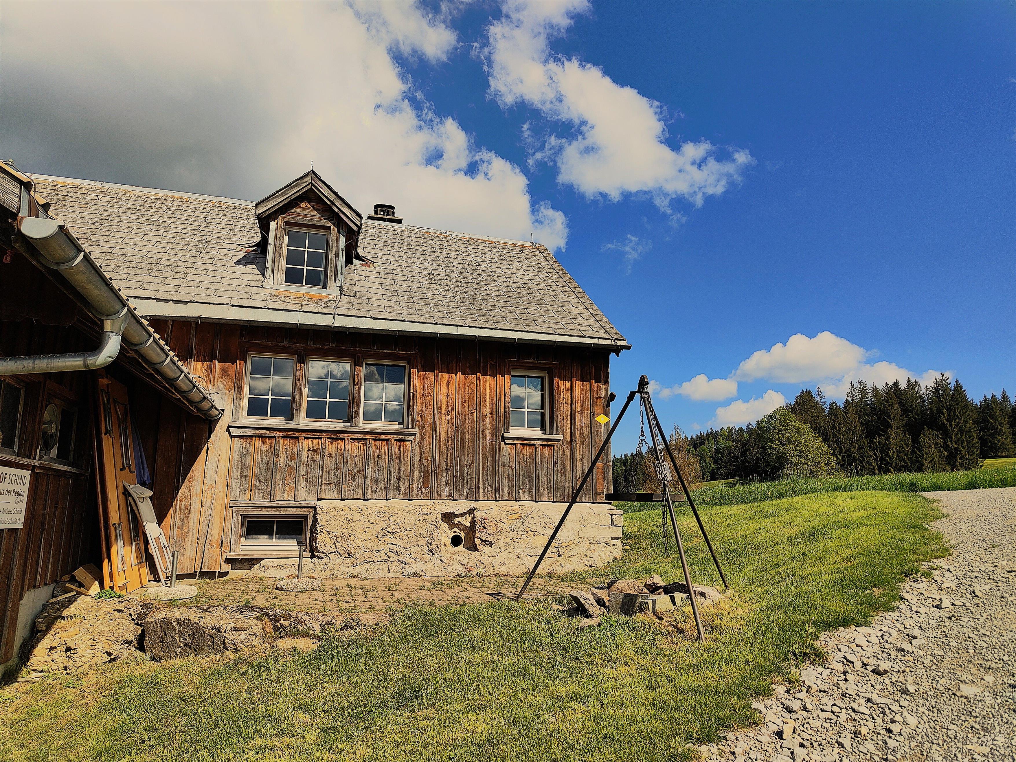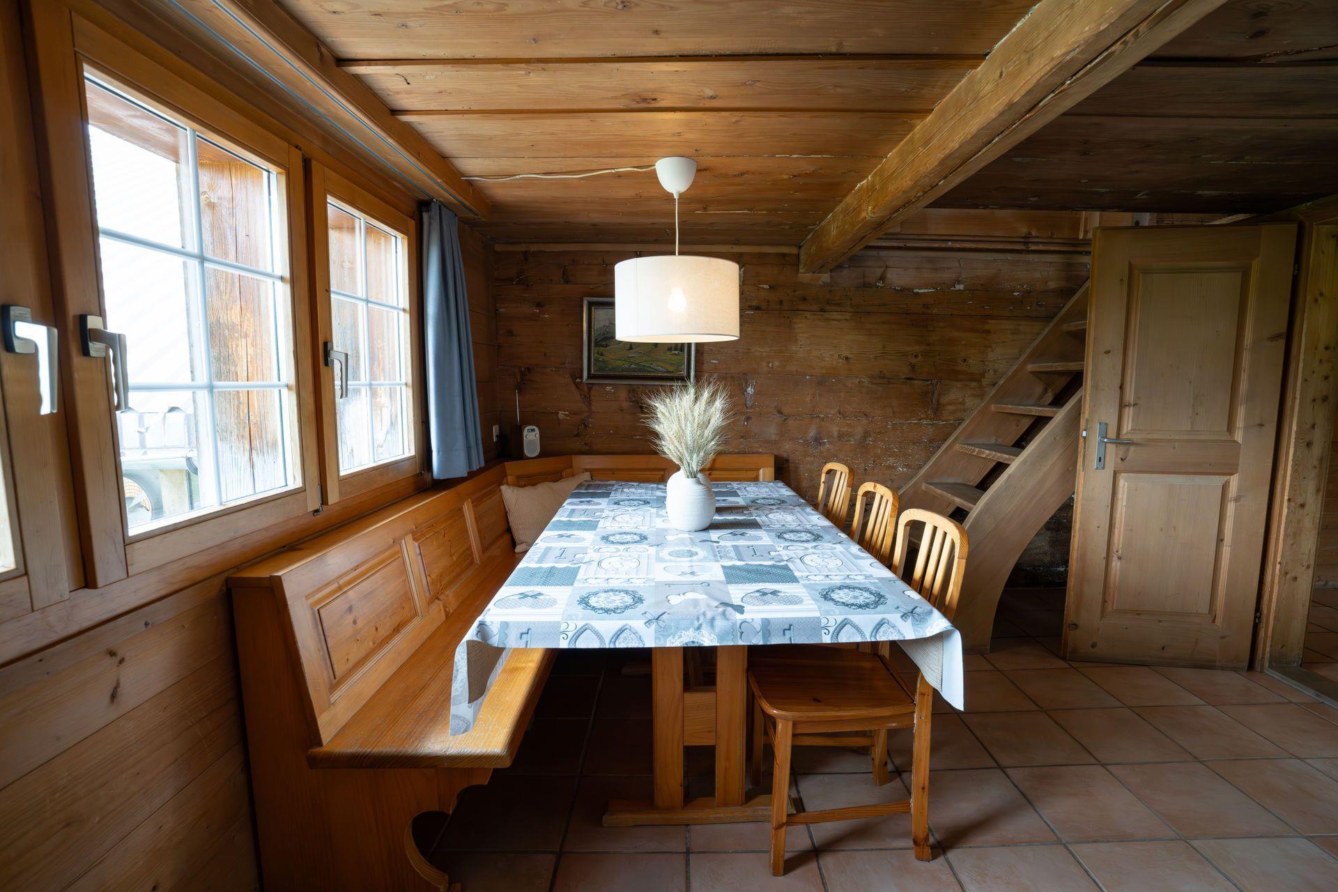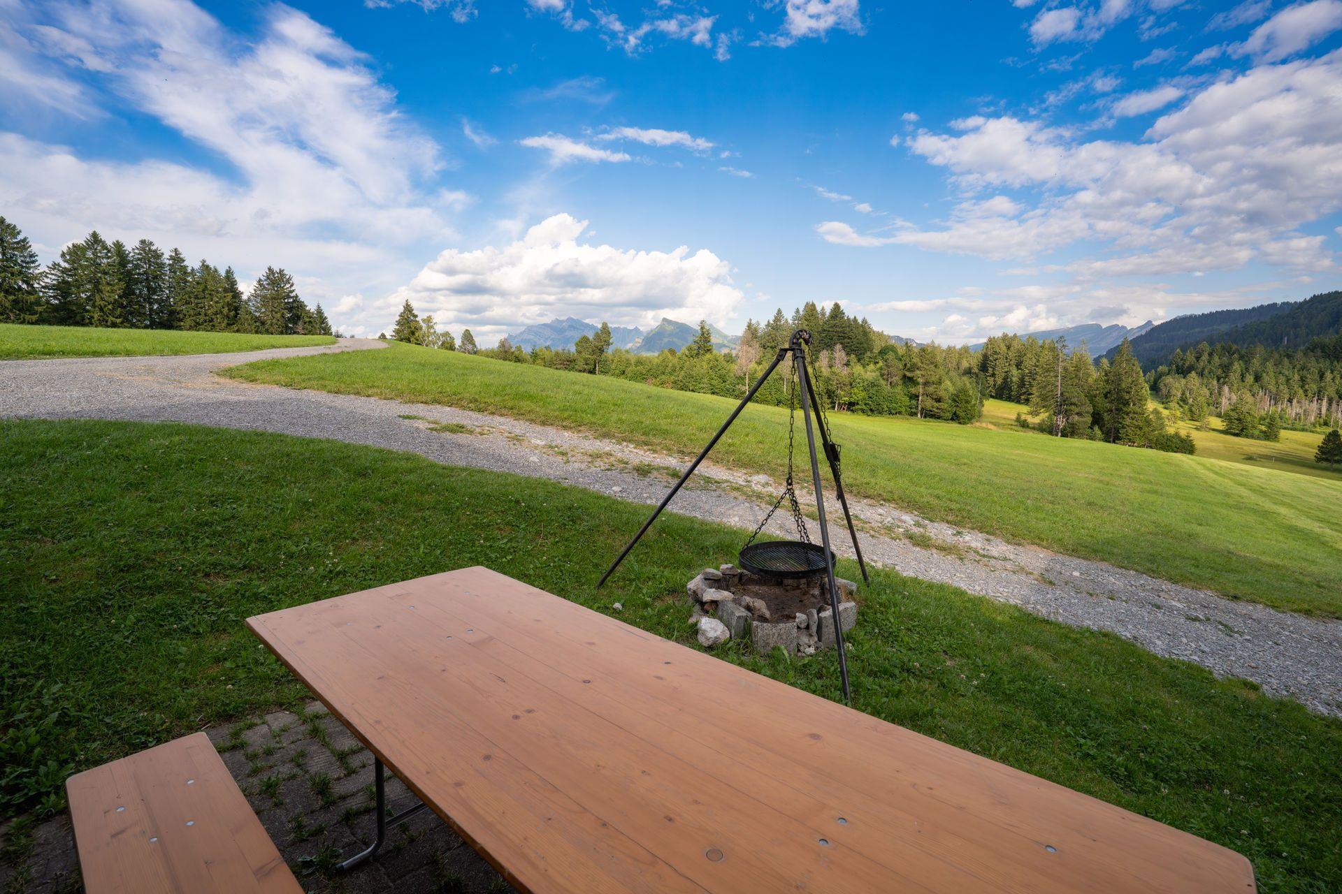 Outside the hut, you will find an inviting seating area with a bench set and barbecue area - the perfect place to enjoy the view and the fresh mountain air. The hut, situated at 1100 metres above sea level, is surrounded by meadows and forest and offers a magnificent view of the Säntis and Speer. The surrounding meadows are farmed organically by us, the Schmid family, with suckler cow husbandry. The cows and calves spend the summer on a high alp in the Glarnerland and on the Unter Bächen alp in Ebnat Kappel. Organic meat and flour can be purchased directly from the farm.
