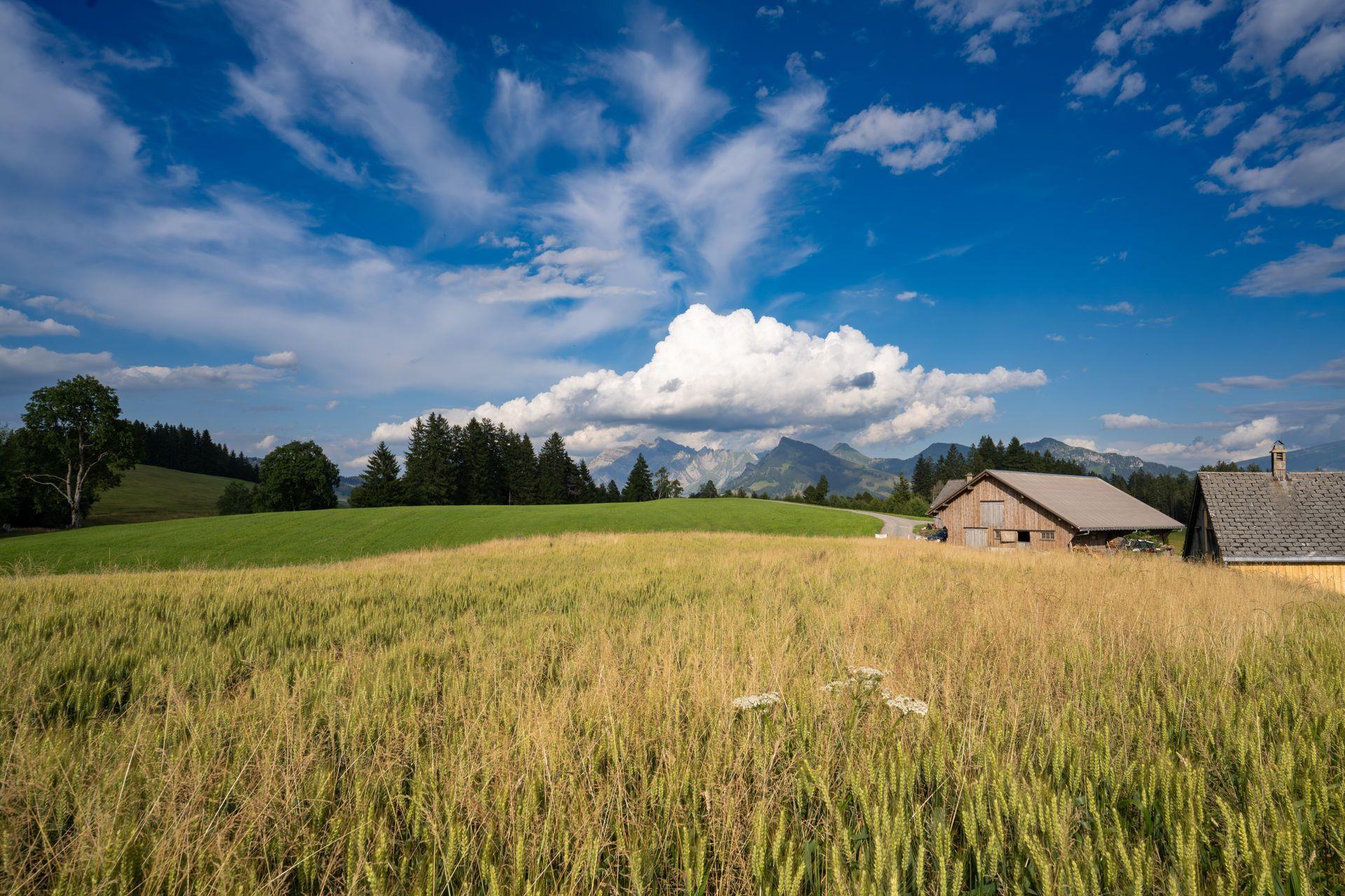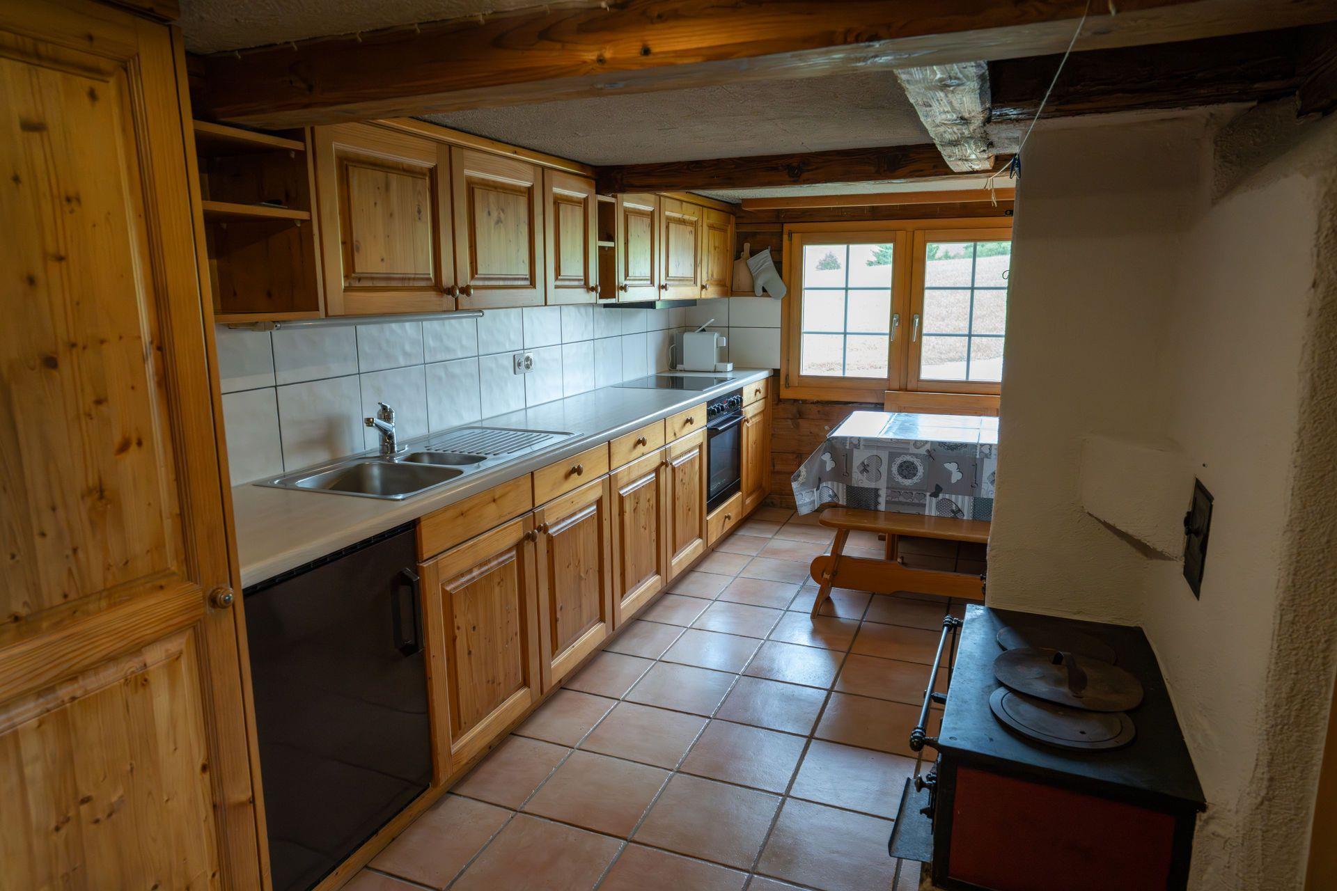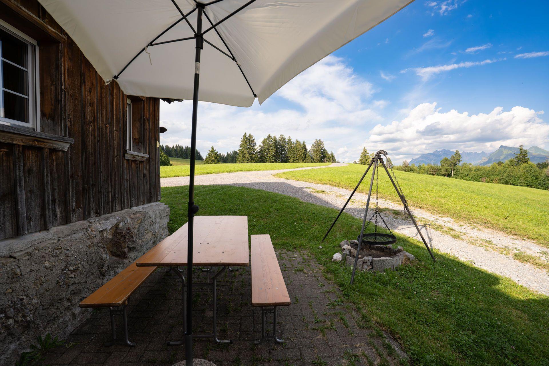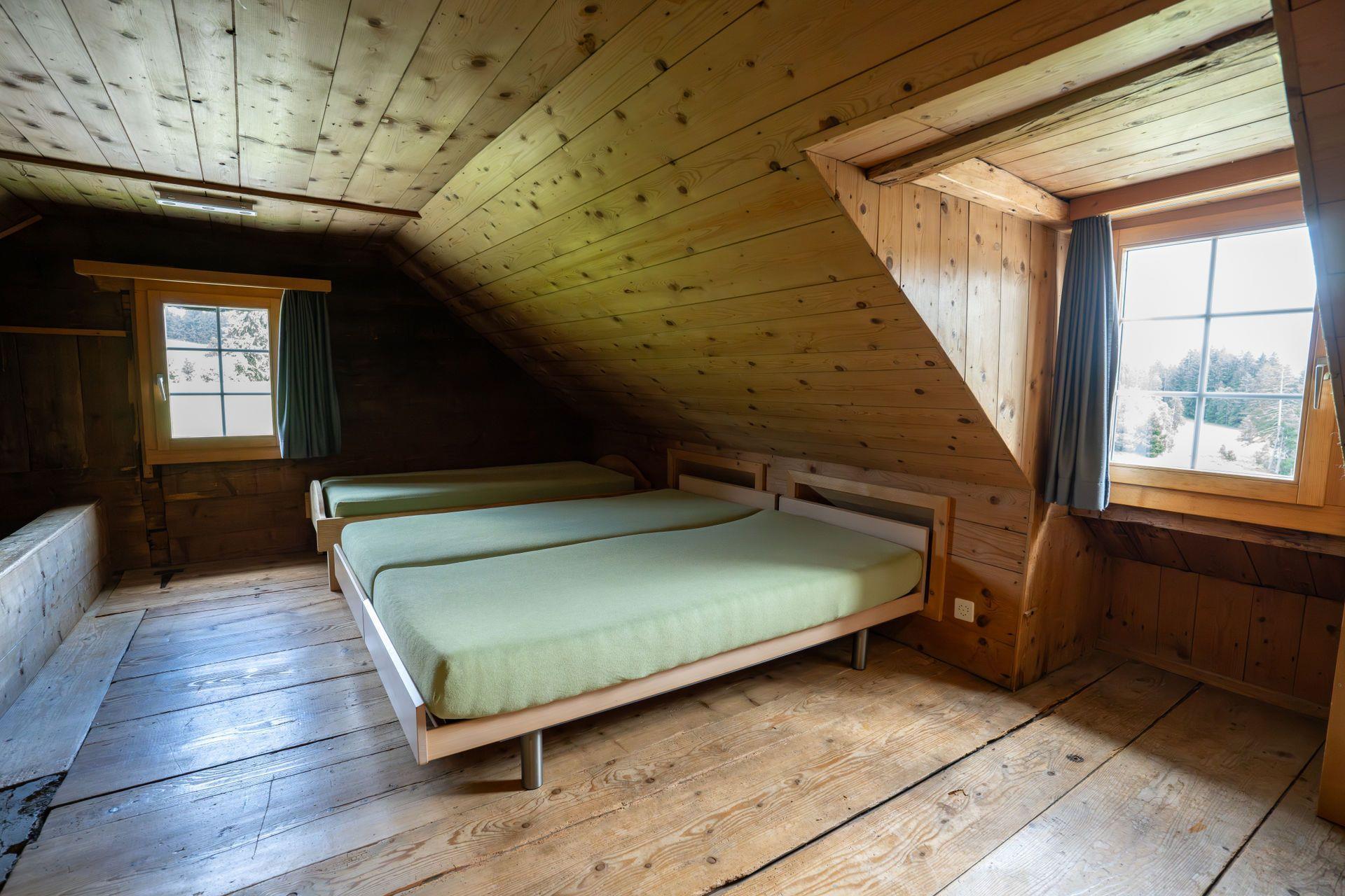 Outside the hut, you will find an inviting seating area with a bench set and barbecue area - the perfect place to enjoy the view and the fresh mountain air. The hut, situated at 1100 metres above sea level, is surrounded by meadows and forest and offers a magnificent view of the Säntis and Speer. The surrounding meadows are farmed organically by us, the Schmid family, with suckler cow husbandry. The cows and calves spend the summer on a high alp in the Glarnerland and on the Unter Bächen alp in Ebnat Kappel. Organic meat and flour can be purchased directly from the farm.