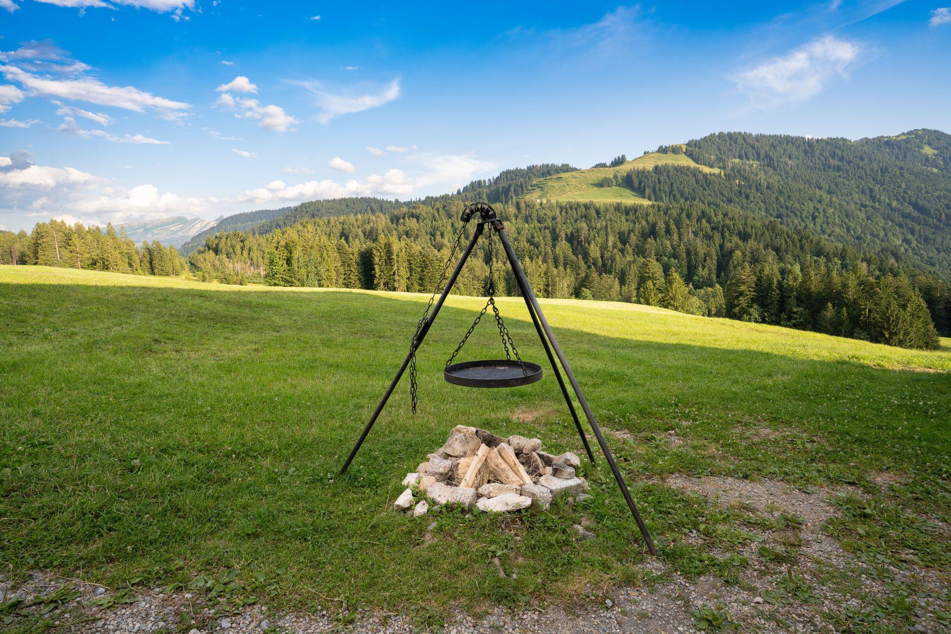 The outdoor area invites you to linger and enjoy yourself with a seating area, bench set and barbecue area. Situated at 1100 metres above sea level, the hut is surrounded by meadows and woodland and offers a magnificent view of the Säntis and Speer mountains. The surrounding meadows are farmed organically by us, the Schmid family, with suckler cow husbandry. The cows and calves spend the summer on a high alp in the Glarnerland and on the Unter Bächen alp in Ebnat Kappel. Organic meat and flour can be purchased directly from the farm.