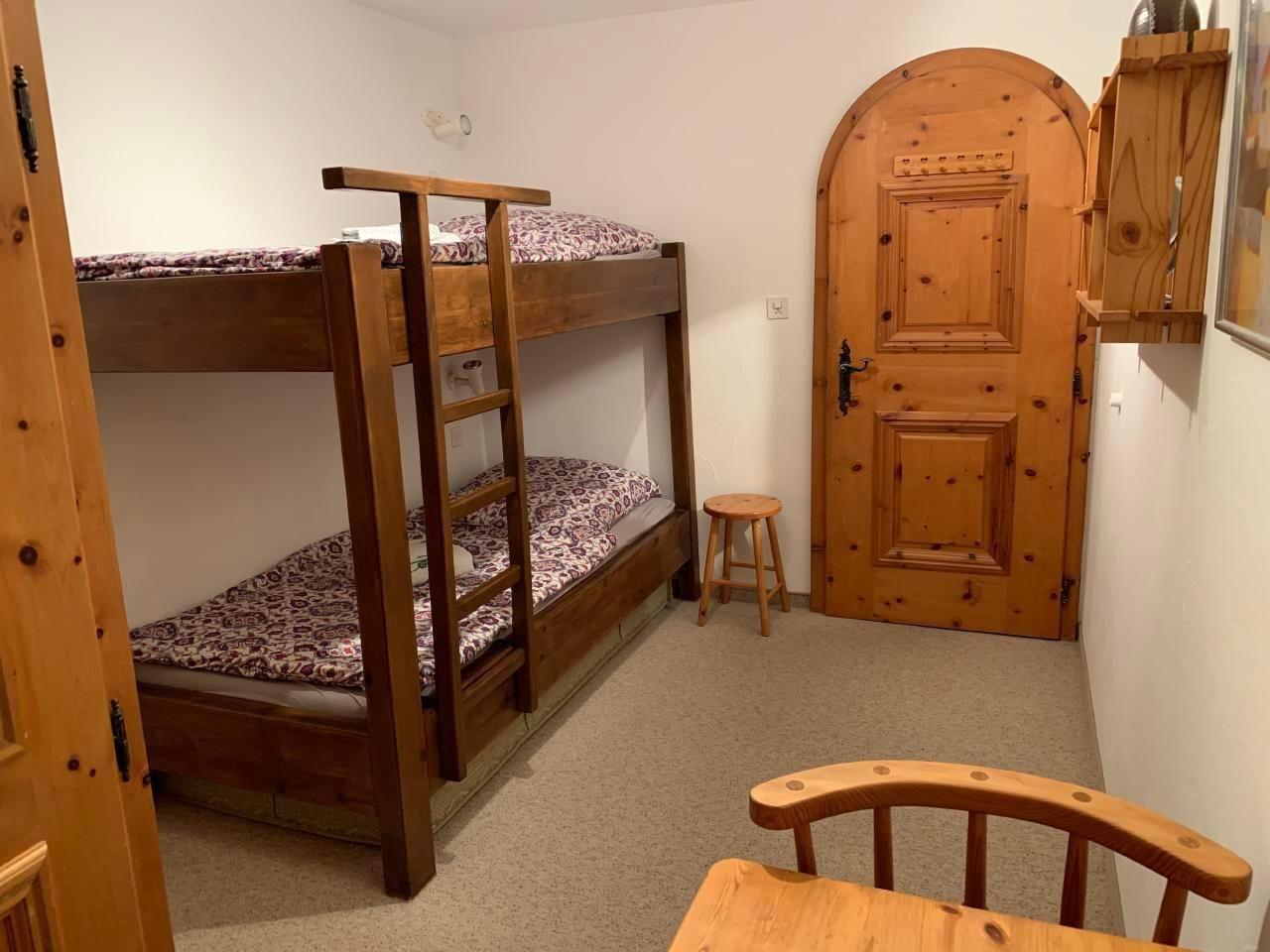 Inside, guests can expect a sun-drenched flat on the 1st floor, lovingly furnished with local Swiss stone pine furniture in typical Engadine style. The flat has a cosy living room with a south-facing balcony, a dining area for four people and a comfortable upholstered seating area for relaxing. A well-equipped kitchen, separated from the living room by a counter, offers everything a holidaymaker could possibly need for cooking, including a dishwasher, freezer and coffee machine. Two bedrooms, one with a double bed and one with bunk beds, offer enough space for the whole family, complemented by a bathroom with shower and WC and an inviting hallway with a large wardrobe.