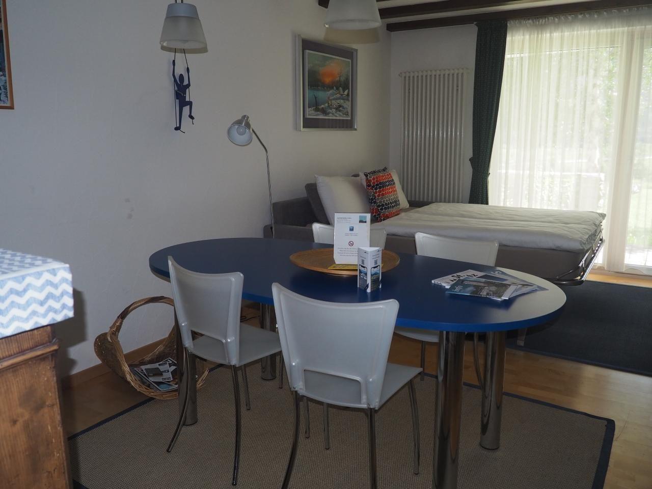 This is a tastefully furnished 1.5 room ground floor flat in an apartment complex in La Punt Chamues-ch in a quiet and very sunny location with unobstructed views. The flat on the ground floor has a cosy living/sleeping room with dining area, fireplace, well-equipped open kitchen, a small room with bunk bed, bathroom/WC, garden seating area, parking space. *4 ring hob, oven, fridge with freezer compartment, dishwasher. Dogs only on request.