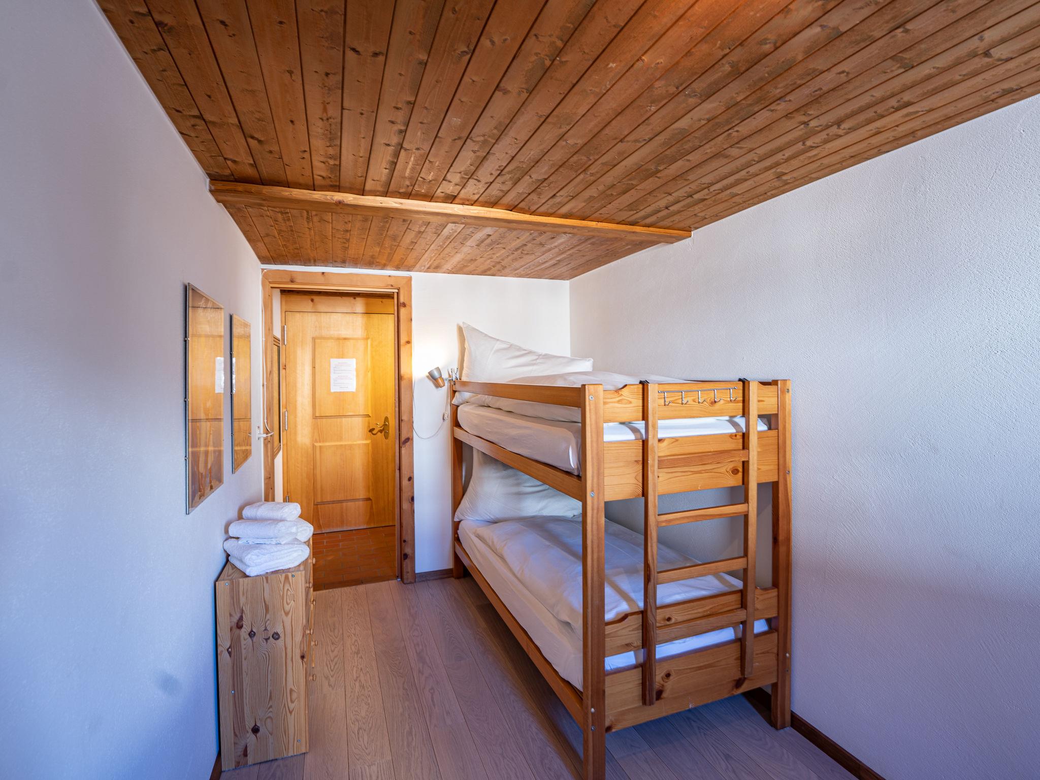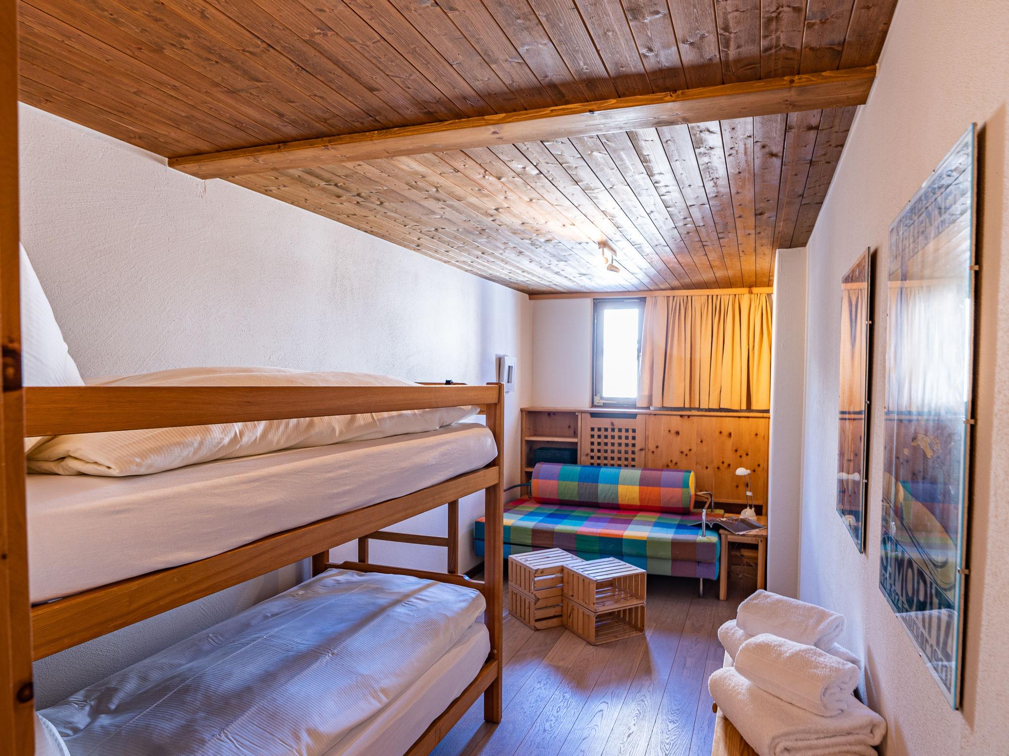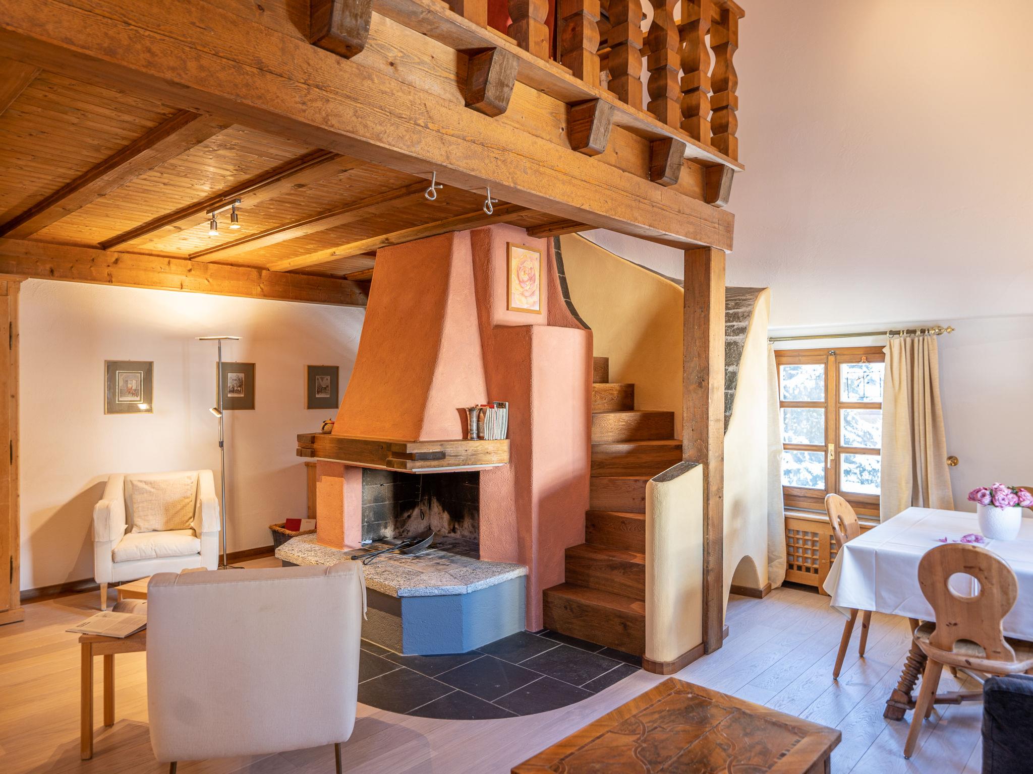 "Chesa Cantieni", 3-room apartment 85 m2 on 2 levels, north facing position. Comfortable and tasteful furnishings: living/dining room with open-hearth fireplace and TV. 1 room with 1 bed (90 cm, length 200 cm), 1 x 2 bunk beds (85 cm, length 185 cm). Open kitchen (oven, dishwasher, 4 induction hot plates, toaster, kettle, freezer, electric coffee machine, Capsules for coffee machine (Nespresso) extra, raclette grill). Shower/WC. Upper floor: 1 room with 1 double bed (2 x 80 cm, length 195 cm), bath/shower/WC. Exit to the balcony. Gallery with 1 sofabed (150 cm, length 200 cm). Small balcony. View of the resort. Facilities: hair dryer. Internet (WiFi, free). Garage space n 12 at 100 m, height 225 cm, width 260 cm. Please note: suitable for families. Non-smokers only. Instead of an enclosed bedroom, some sleeping areas are located in an open-plan area (gallery, alcove, etc.).