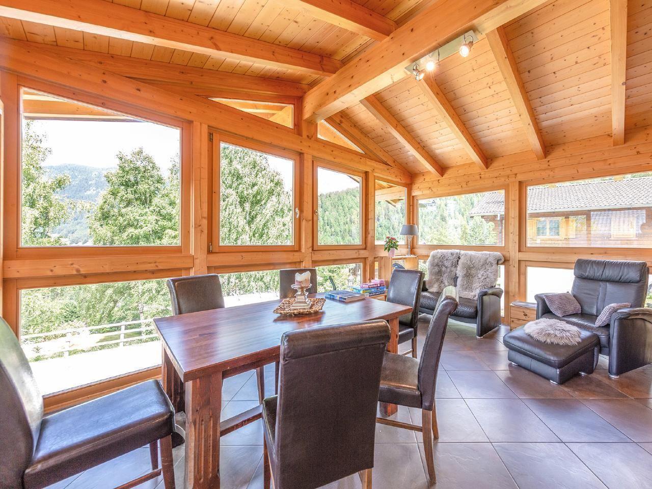 Spacious and cosy luxury chalet with open fireplace, sauna, outdoor whirlpool, cosy conservatory with wide panoramic glass front and free WLAN. The stylish chalet combines a modern alpine interior with high-quality furnishings, creating an exclusive and comfortable feel-good atmosphere.
