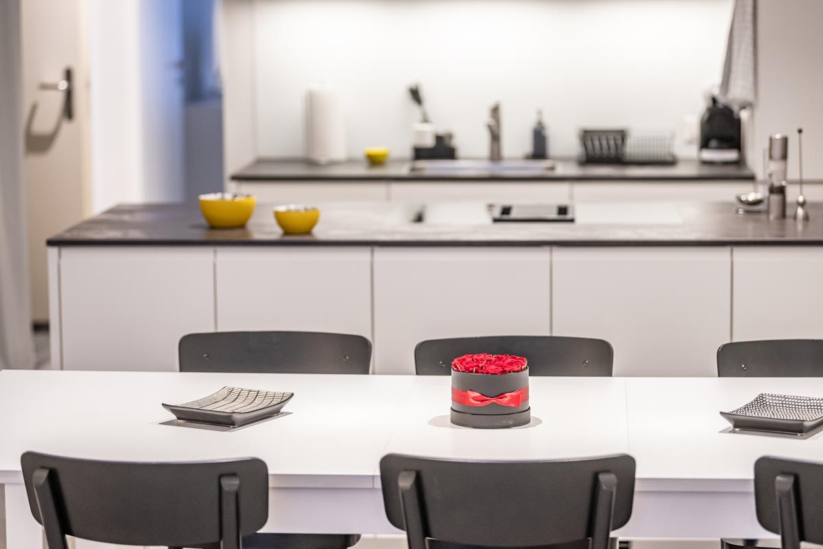 Open kitchen: induction hob, horizontal steam extractor. Oven. Large fridge, separate freezer. Dishwasher. Capsule coffee machine. Microwave.