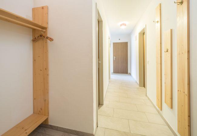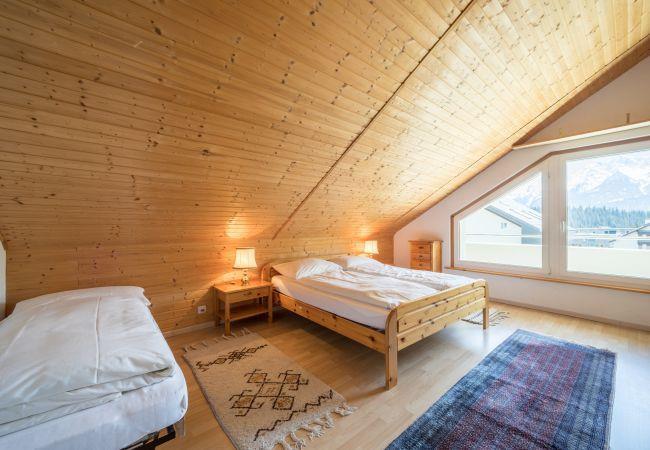 This charming apartment offers a spacious living area with a dining nook, three bedrooms (sleeping arrangements: 2, 3, and 2 beds), and a fully equipped kitchen featuring a dishwasher, glass-ceramic cooktop, oven, and refrigerator. There are two bathrooms: one with a bath/shower, sink, and toilet, and another with a sink and toilet. A large south-facing balcony provides stunning views of the forest and mountains. Two of the bedrooms are under a sloped roof, adding a unique and cozy charm. A washing machine and dryer are available in the basement.