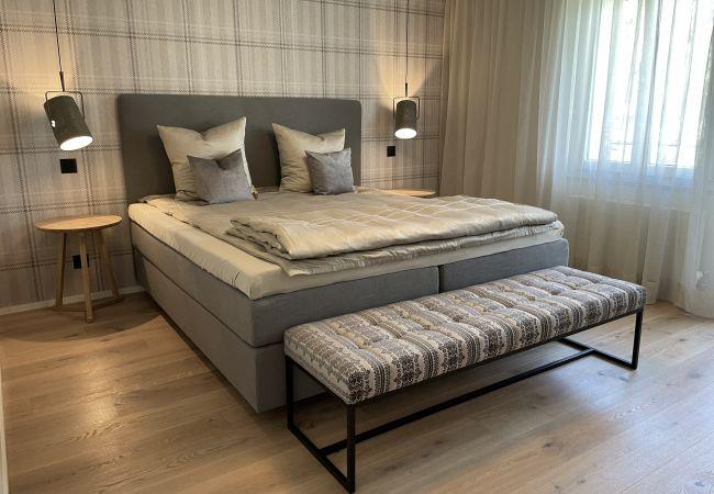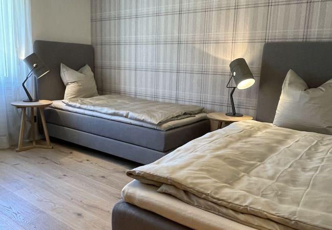 The smaller bedroom, located on the north side, features two single beds. The spacious double bedroom also has access to a small balcony with views of Crap Sogn Gion and the Flimserstein.