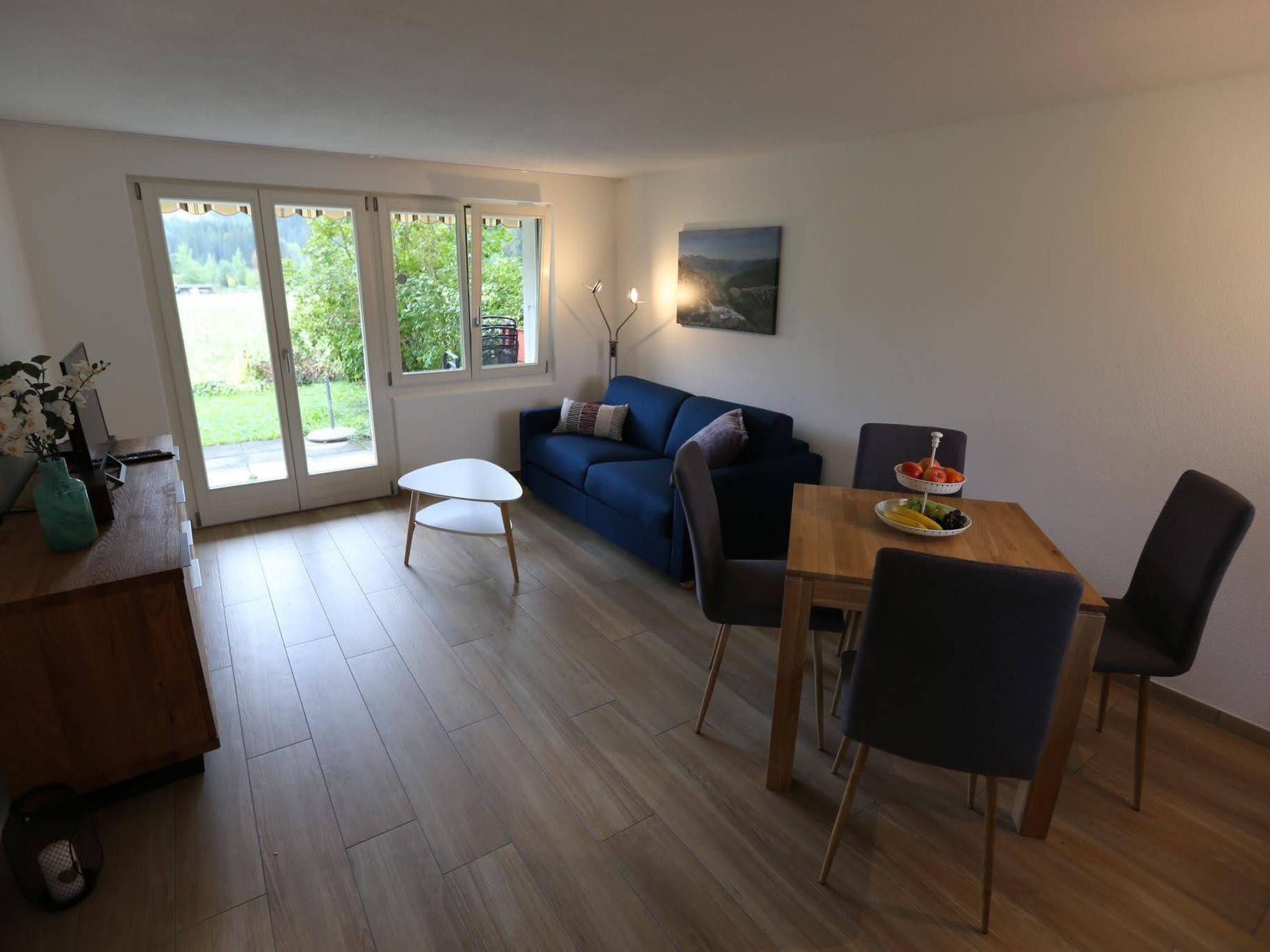 1 living room / dinette with direct way out to the terrace, 1 double bedroom, new kitchen with electric cooking stove and fridge, shower/WC, TV/radio, unatteded WLAN is available, car parking. Public transport included in the Simmental and Saanenland with the SIMMENTAL CARD: Overnight guests in the Lenk-Simmental holiday region travel free of charge on public transport for excursions with a valid guest card.