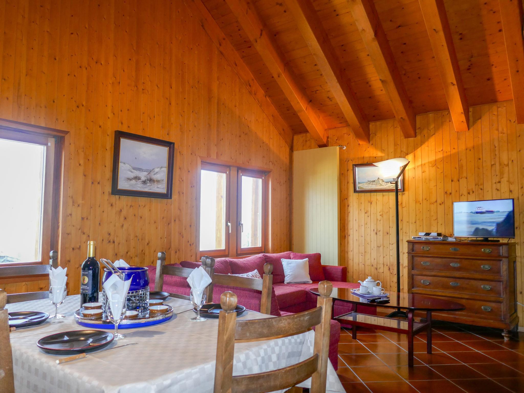 "Mona", 4-room house 100 m2 on 3 levels. Spacious, partly with sloping ceilings, very comfortable and cosy furnishings: open large living room with open-hearth fireplace, dining table, satellite TV, flat screen and radio. Large, open kitchen (oven, dishwasher, 3 ceramic glass hob hotplates, microwave, electric coffee machine, Capsules for coffee machine (delizia) extra, raclette grill, fondue Set (chinoise, cheese)) with dining table, electric heating and gas heating. Exit pergola. Shower/WC. On the lower ground floor: 1 room with 1 double bed. 2 rooms, each room with 1 x 2 bunk beds. Shower/WC. Large terrace 66 m2, south facing position. Terrace furniture, balcony furniture, barbecue, deck chairs (4), box-room. Beautiful view of the mountains and the countryside. Facilities: children's high chair, baby cot for up to 3 year olds (extra), hair dryer, logs (extra). Internet (WiFi, extra). Please note: suitable for families. Non-smoking house. Maximum 2 pets/ dogs allowed. NL-00003941