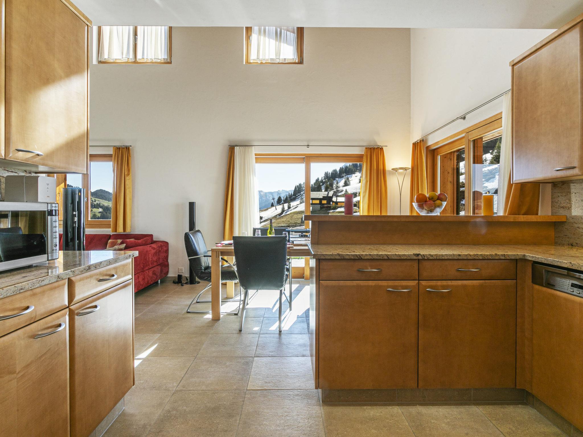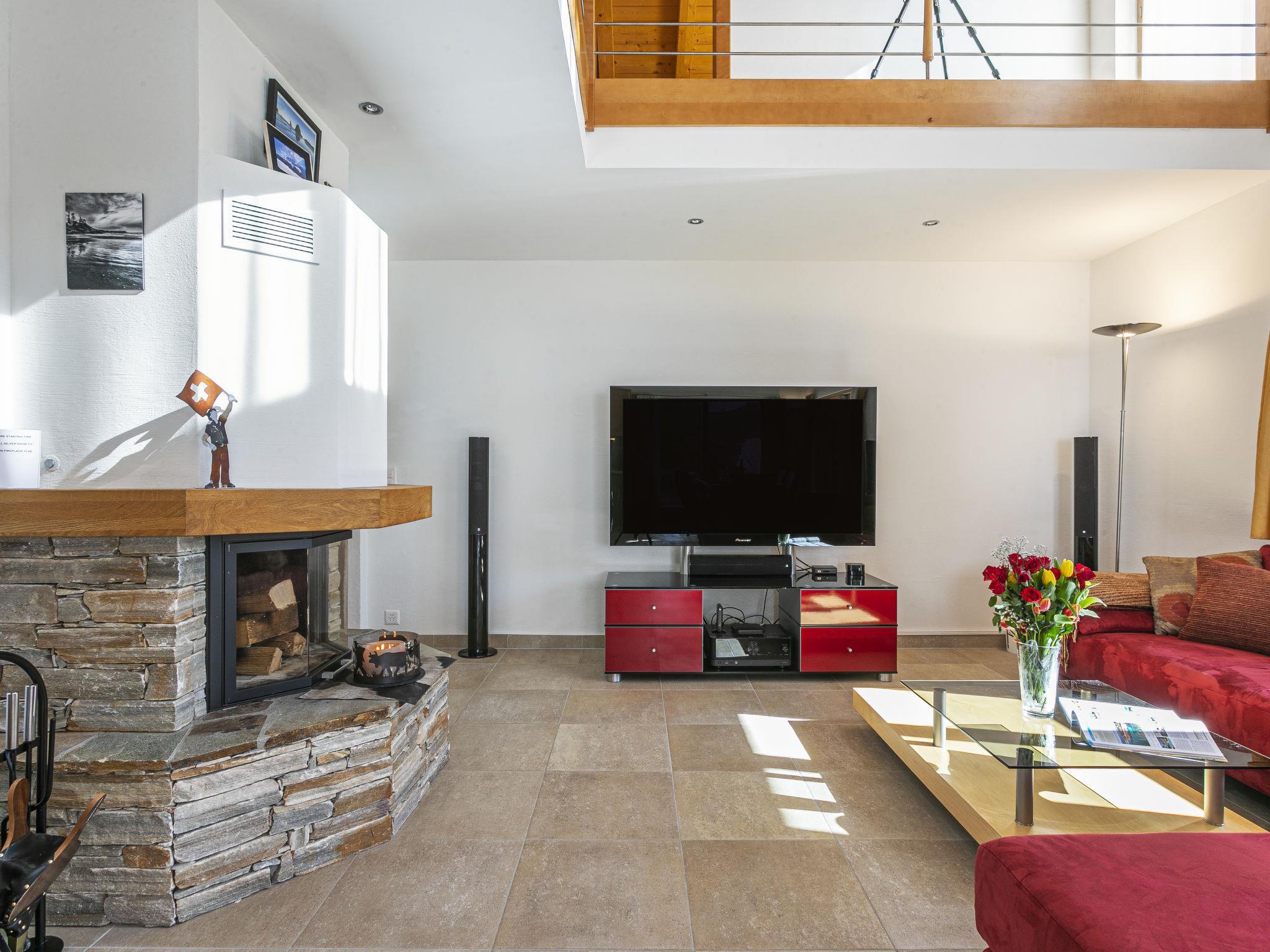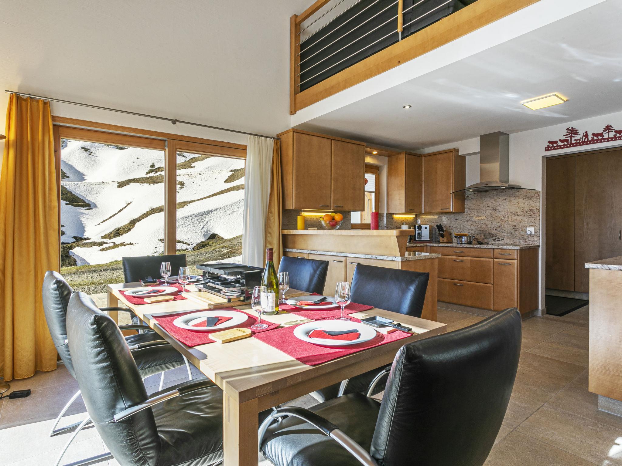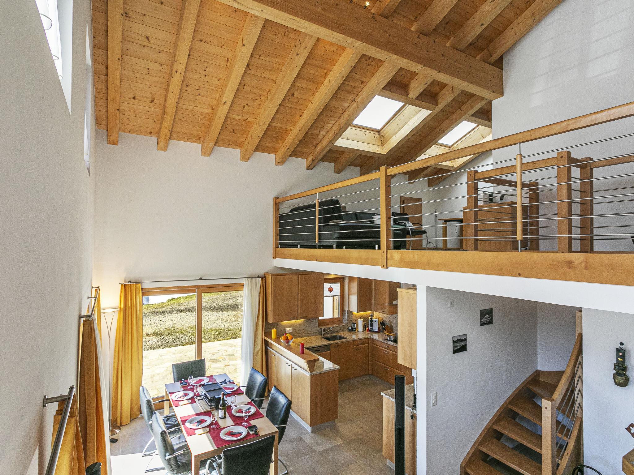 "Martens", 4-room chalet 150 m2 on 2 levels, south-west facing position. Luxurious and tasteful furnishings: living/dining room with panoramic window with open-hearth fireplace and TV. Exit to the terrace. 1 room with 1 double bed (160 cm, length 200 cm), bath/WC. Exit to the terrace. Open kitchen (oven, dishwasher, 4 ceramic glass hob hotplates, toaster, kettle, microwave, electric coffee machine, Capsules for coffee machine (Nespresso) extra, raclette grill, fondue Set (chinoise, cheese)). Sep. WC. Upper floor: 1 room with 1 double bed (160 cm, length 200 cm). 1 room with 1 double bed (160 cm, length 200 cm). Gallery. Shower/WC. Very beautiful view of the mountains, the ski run, the countryside and the resort. Facilities: Internet (WiFi). Please note: non-smokers only. In winter the access road to the chalt is closed due to snow. Multipass is included.