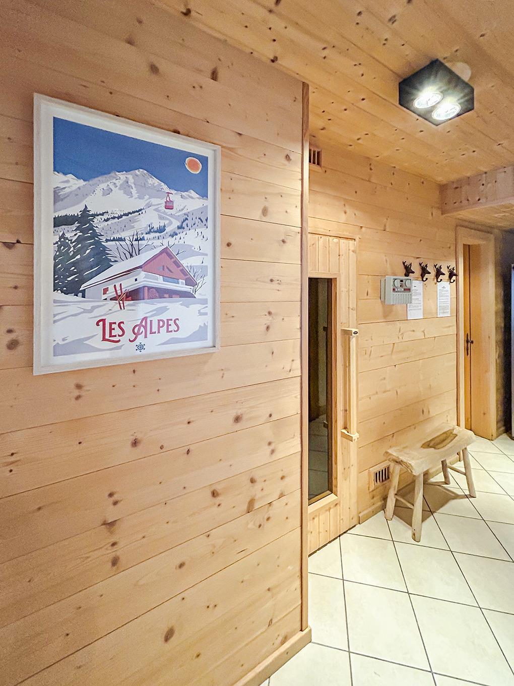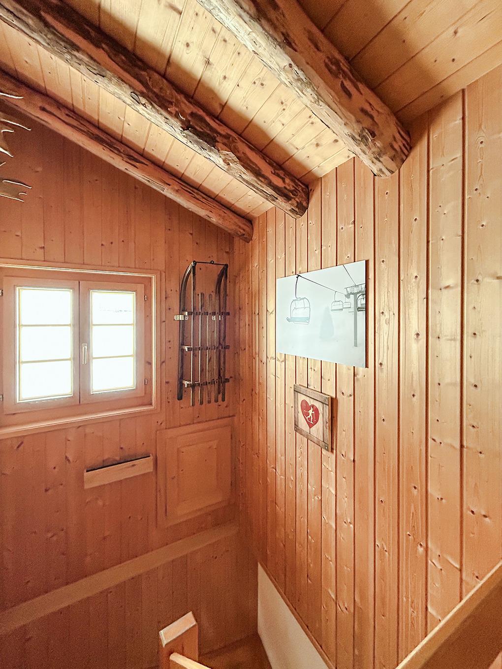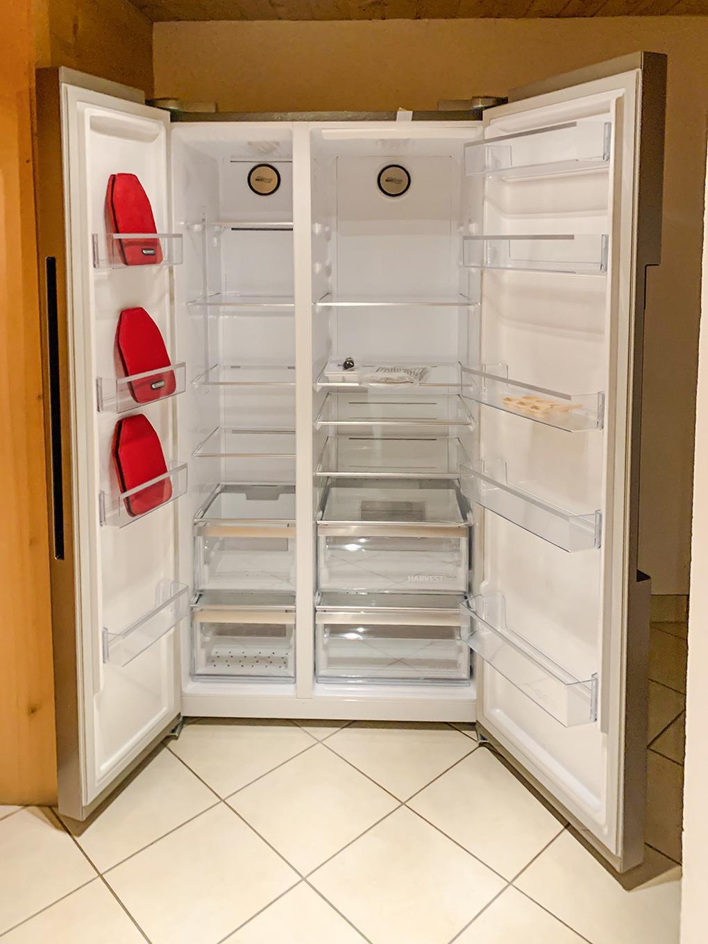 Parterre: Flur mit Skischuhregal, großem amerikanischem Kühl-/Gefrierschrank. Sauna. Zwei Doppelzimmer. Bad: Du, Wb, WC.