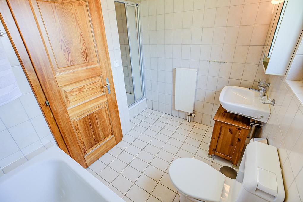 CH 388.82 Wohnung 4-8 Pers.: 4-Zimmerwohnung mit 90 qm Wohnfläche über 2 Etagen. 2. Etage: Schöner, großer Wohnraum mit Kaminofen, TV, Sitzgruppe, Esstisch, Küchenzeile (Backofen, Mikrowelle, Spülmaschine). Balkon. Doppelzimmer. Zwei 2-Bettzimmer mit Etagenbett. Bad: Bw, Du, Wb, WC. Vom Wohnraum aus Treppe ins Dachgeschoss mit Schrägen: große Galerie mit 2 Einzelbetten.