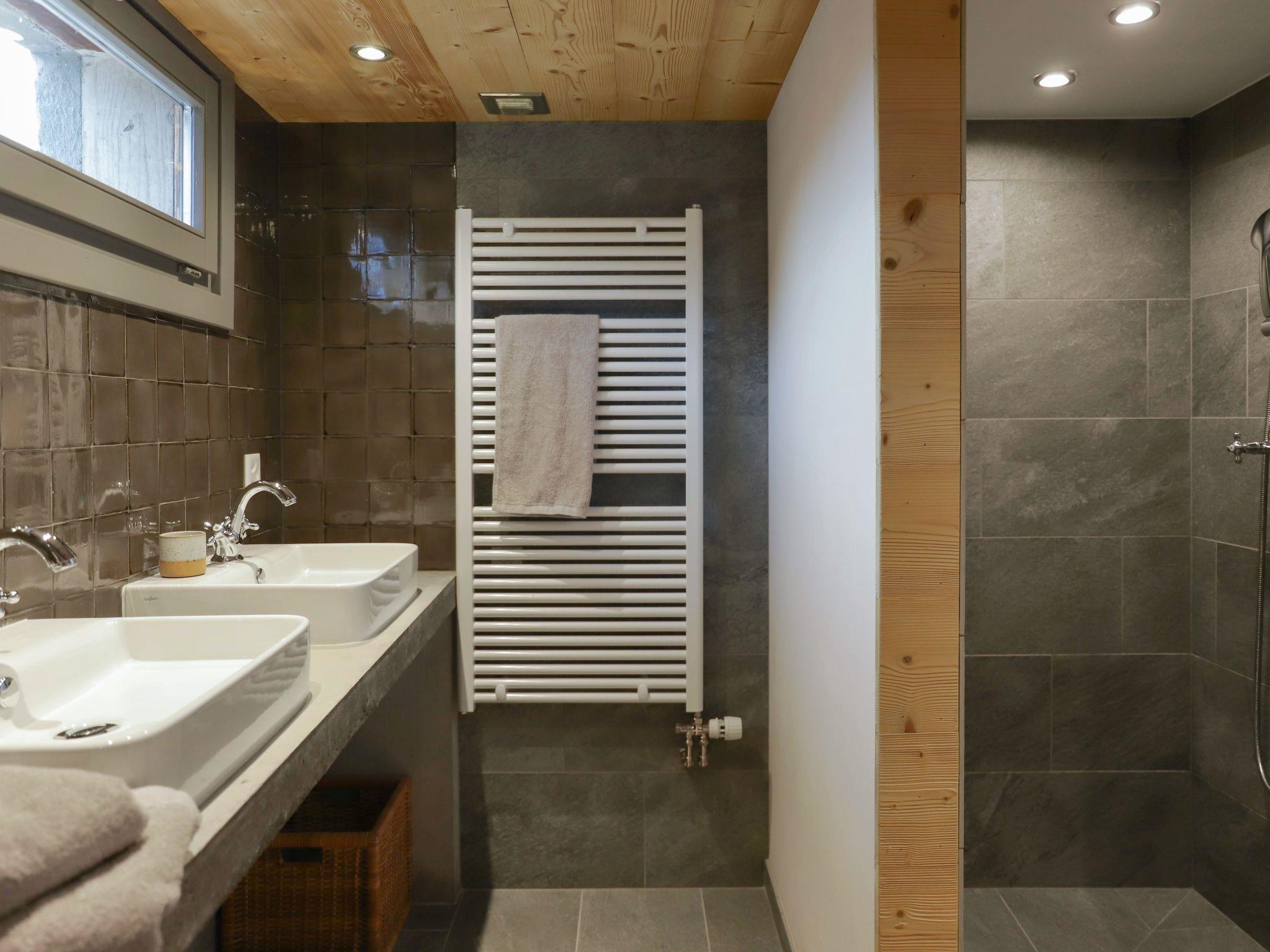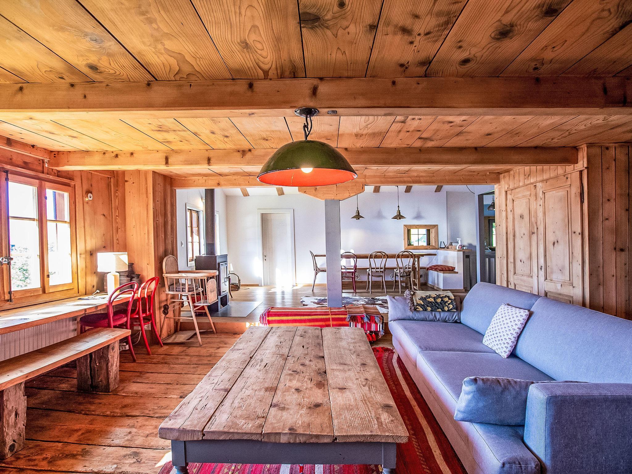 "Chalet Pierre Fleur", 6-room chalet 160 m2 on 3 levels. Object suitable for 7 adults + 4 children. Partly with sloping ceilings, renovated in 2021, comfortable and beautiful furnishings: entrance hall. Large living/dining room with open-hearth fireplace, Scandinavian wood stove and dining table. 1 room with 1 double bed (160 cm). Open kitchen (oven, dishwasher, 4 induction hot plates, microwave, electric coffee machine, Capsules for coffee machine (Nespresso) extra, raclette grill) with hatch. Exit to the garden, to the terrace, west facing position. Shower, sep. WC. On the lower ground floor: 1 room with 1 double bed (180 cm), shower/WC and double hand-basin. Exit to the garden, to the terrace, south facing position. Upper floor: 1 room with sloping ceilings, Low door height 120 cm with 1 double bed (160 cm). Exit to the balcony. 1 children's room with sloping ceilings, Low door height 120 cm with 2 x 2 bunk beds (90 cm, length 180 cm). 1 room with sloping ceilings, Low door height 120 cm, without wardrobe with 1 bed (140 cm). Bath/WC. Small balcony 8 m2, large terrace 20 m2, large terrace 16 m2. Terrace furniture, barbecue. Very beautiful view of the mountains. Facilities: washing machine. Internet (WiFi, free). Please note: non-smoking house. Maximum 1 pet/ dog allowed.