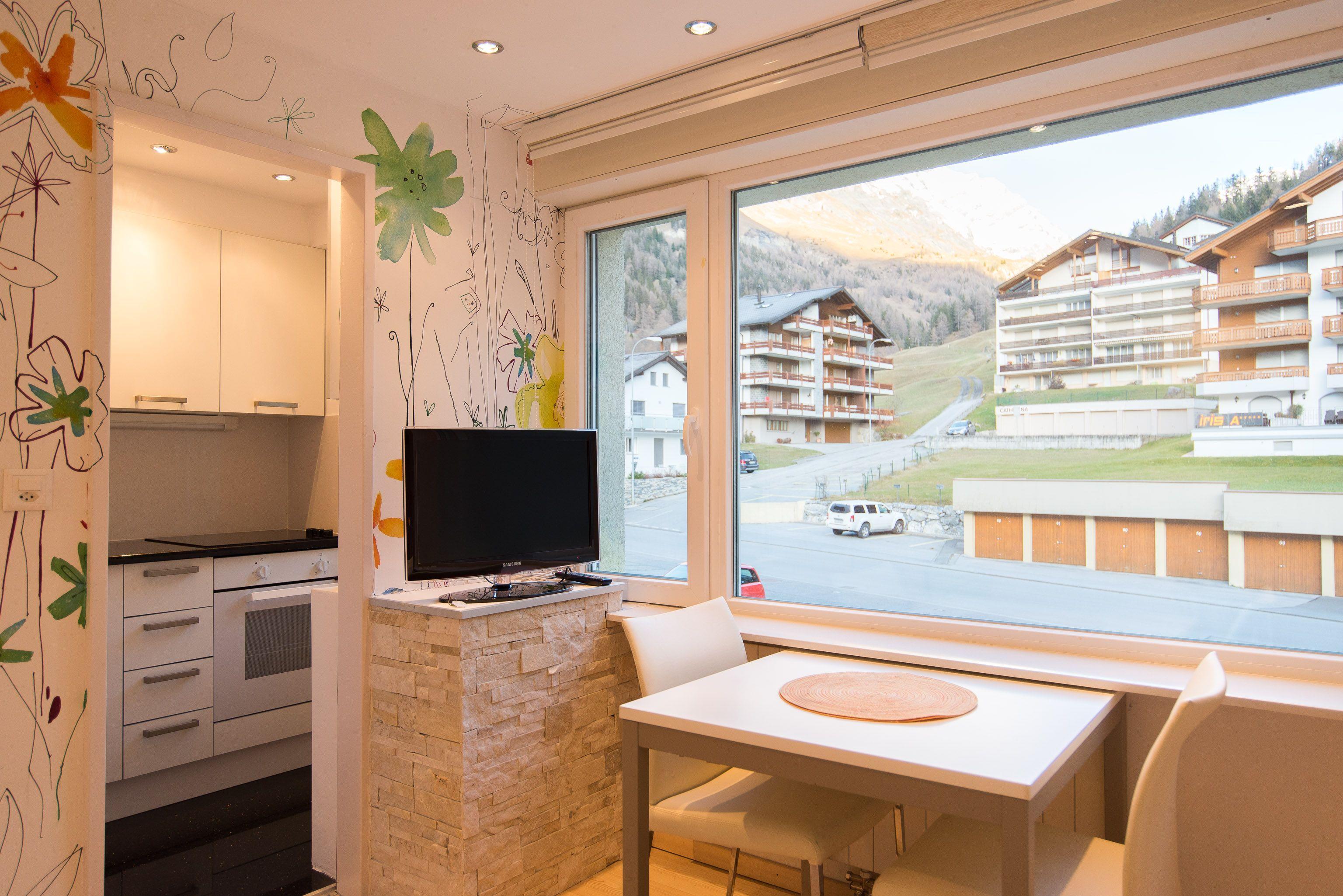 Panoramic view of Leukerbad and the surrounding mountains. All flats (except: small studio) with large and sunny balcony.