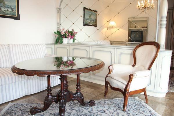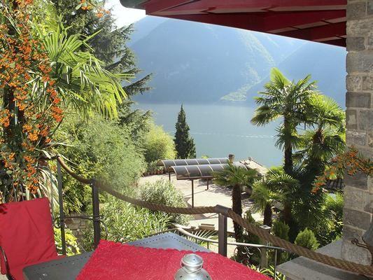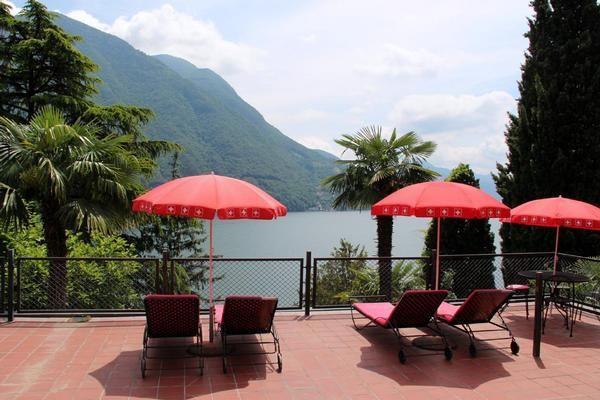 2 1/2 room flat IV A 1st floor with private entrance from outside for 2 persons.1 extra bed on request. Cable TV, mobile telephone possible, WiFi. 2 terraces with dining area + deckchairs, 1 terrace with direct access to the garden (with own fenced garden section/garden path for the dog amidst palm, olive, laurel and camellia trees) and garden gate to the ancient olive footpath to Gandria. Lake view. Car park or garage for a fee. Small living room with air conditioning, sofa bed 0.9x2 m. 1 double bedroom with fan. Cot on request for a fee. Country-style kitchen with dining area for 3 people and with 4 ring hob, dishwasher, microwave with grill, oven, extractor fan, window. Bathroom: bathtub with shower curtain, WC, bidet, infrared radiator, small mirror cabinet, window. Non-smoking flat. The 5-star BARONY LE PERGOLE with 3 villas with 10 luxurious maisonette flats for 1 - 9 persons is located in the exclusive district of Lugano-Castagnola at the foot of "Monte Bre" (the sunniest mountain in Switzerland) at the beginning of the romantic lakeside path to the fishing village of "Gandria" 1.3 km. The residence is situated in a terraced Mediterranean tree garden (close to nature) with palm trees and a wonderful view of Lake Lugano and the nearby mountains; quiet and sunny between a private cul-de-sac and the ancient olive footpath of Castagnola. Covered swimming pool free of charge (4 m x 8 m) from 30 June-Sept. + 140 sqm sun terraces. All flats are tastefully + comfortably furnished. Cots available.