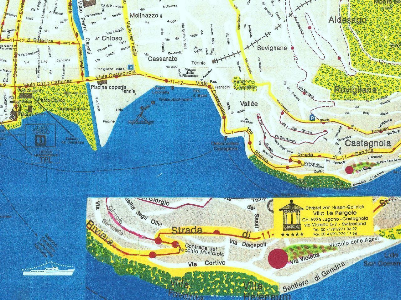 To: lake with bathing jetty (for adults) and landing stage 130 m + steps, scheduled boat at the "Villa Heleneum" museum 250 m, Lido San Domenico 400 m, bus 70-400 m, restaurants 300 m, grocers, Lido Lugano, tennis court, fitness centre, mountain railway to Monte Brè 1.2 to 1.5 km. Centre of Lugano 2.5 km. Residence managed by the owner, who lives on site.