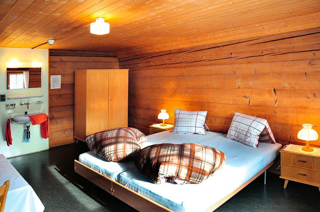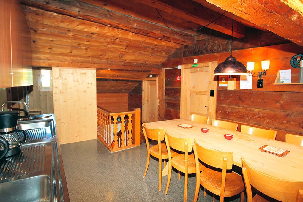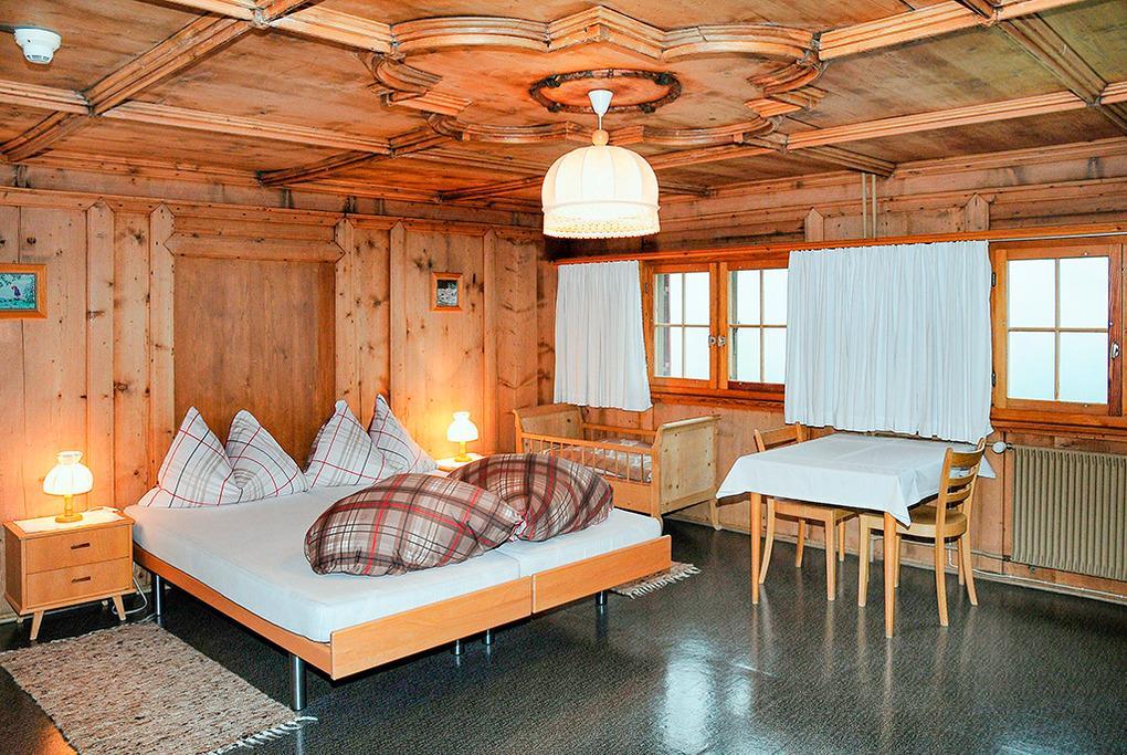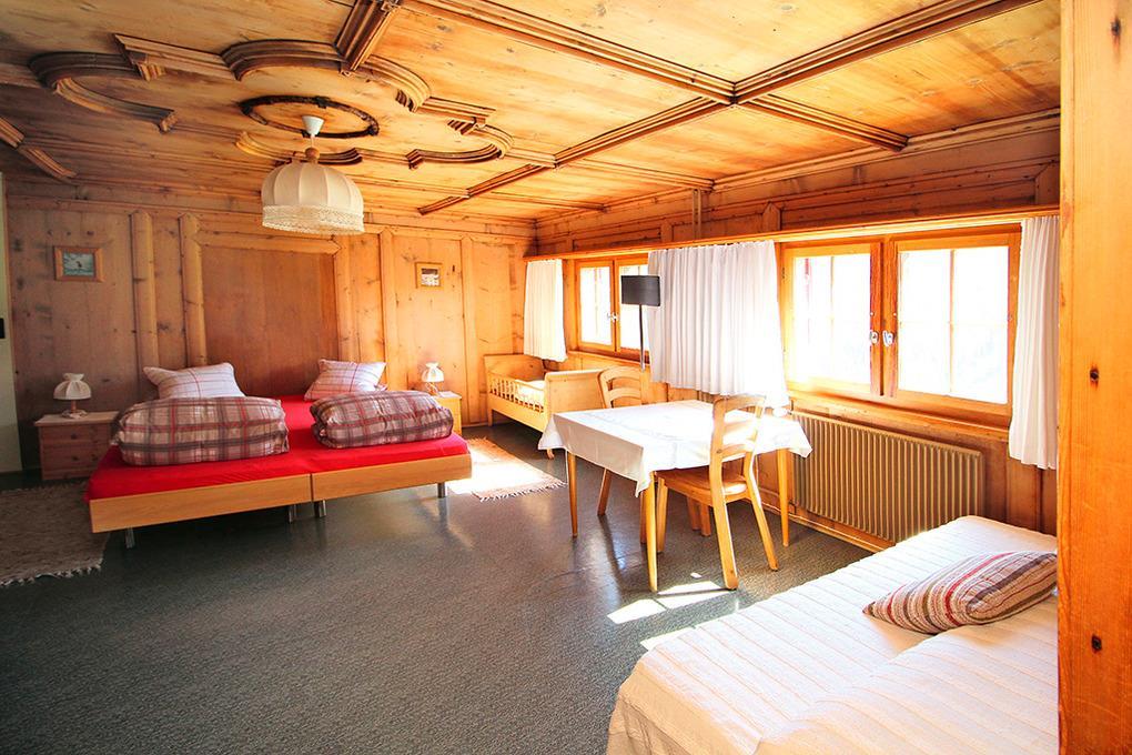 Parterre: Eingangsbereich mit rundem Tisch, Garderobe. Essraum für 14-16 Personen. Wintergarten (traditionelle Laube) mit weiteren Esstischen, großer Fensterfront, schönem Berg- und Talblick. Küche mit mehreren Kochnischen (E-Platten, Backofen). Doppelzimmer. 3-Bettzimmer, dahinter: 2-Bettzimmer. Bad: Bw/Du, Wb, WC. Separates WC.