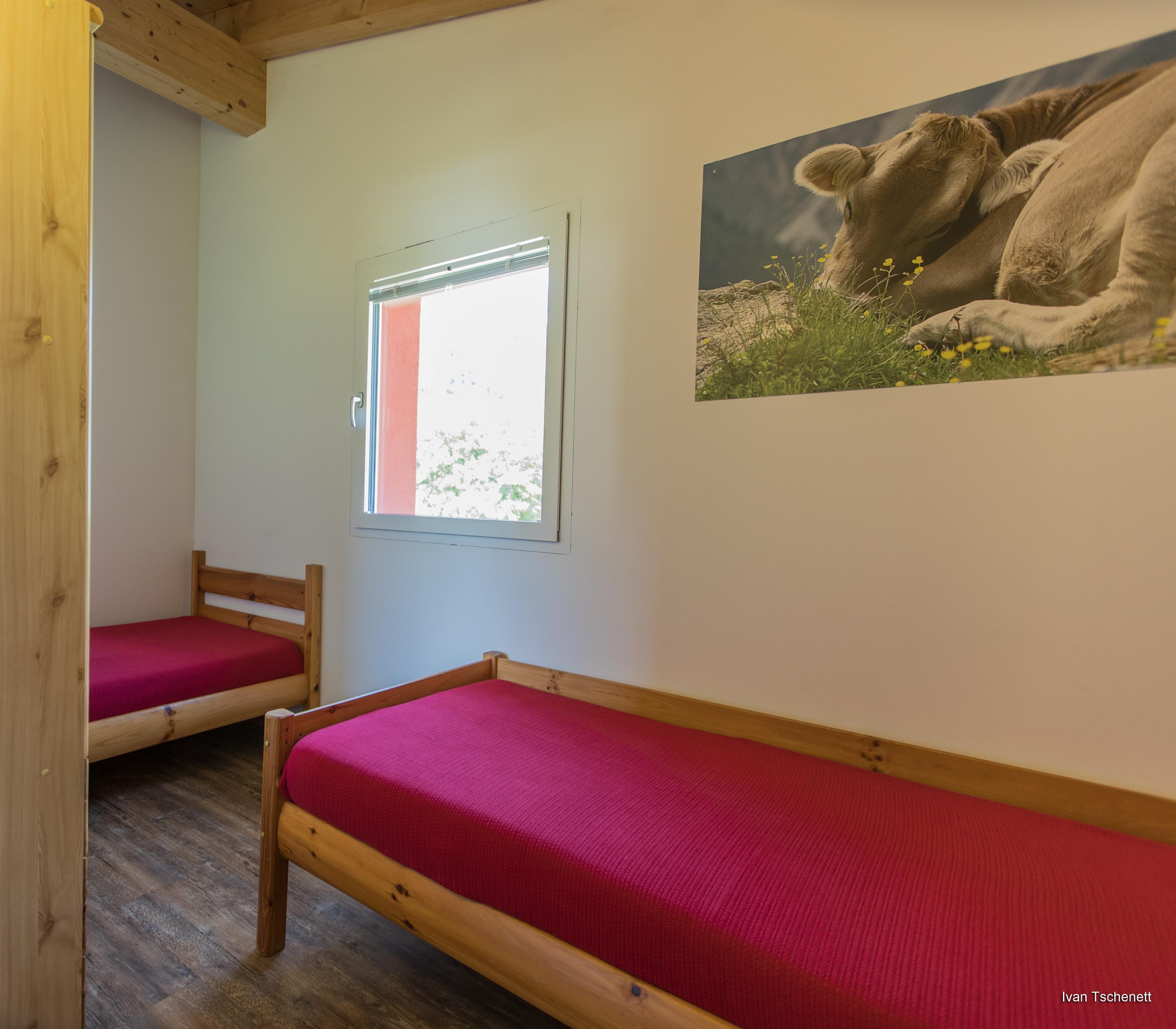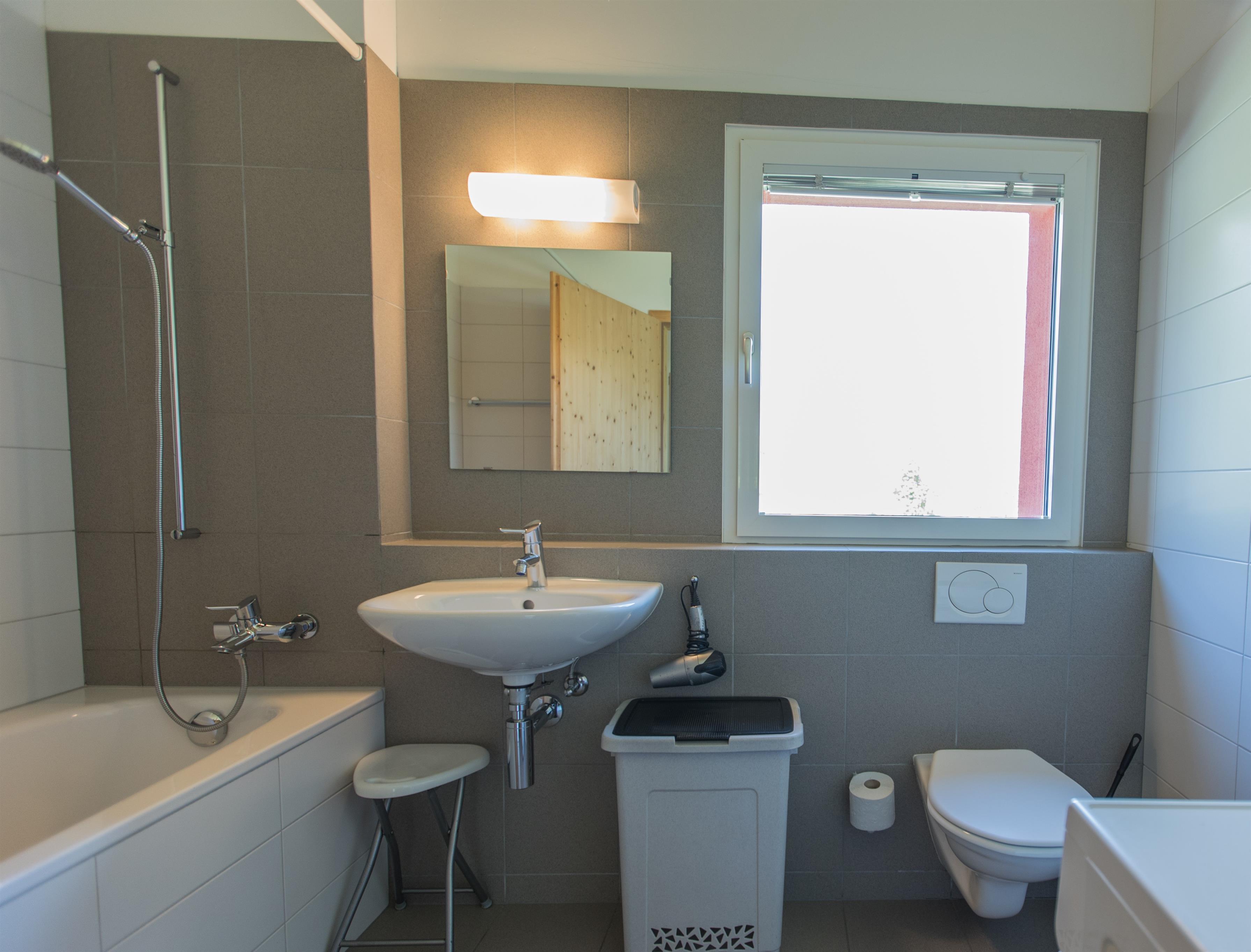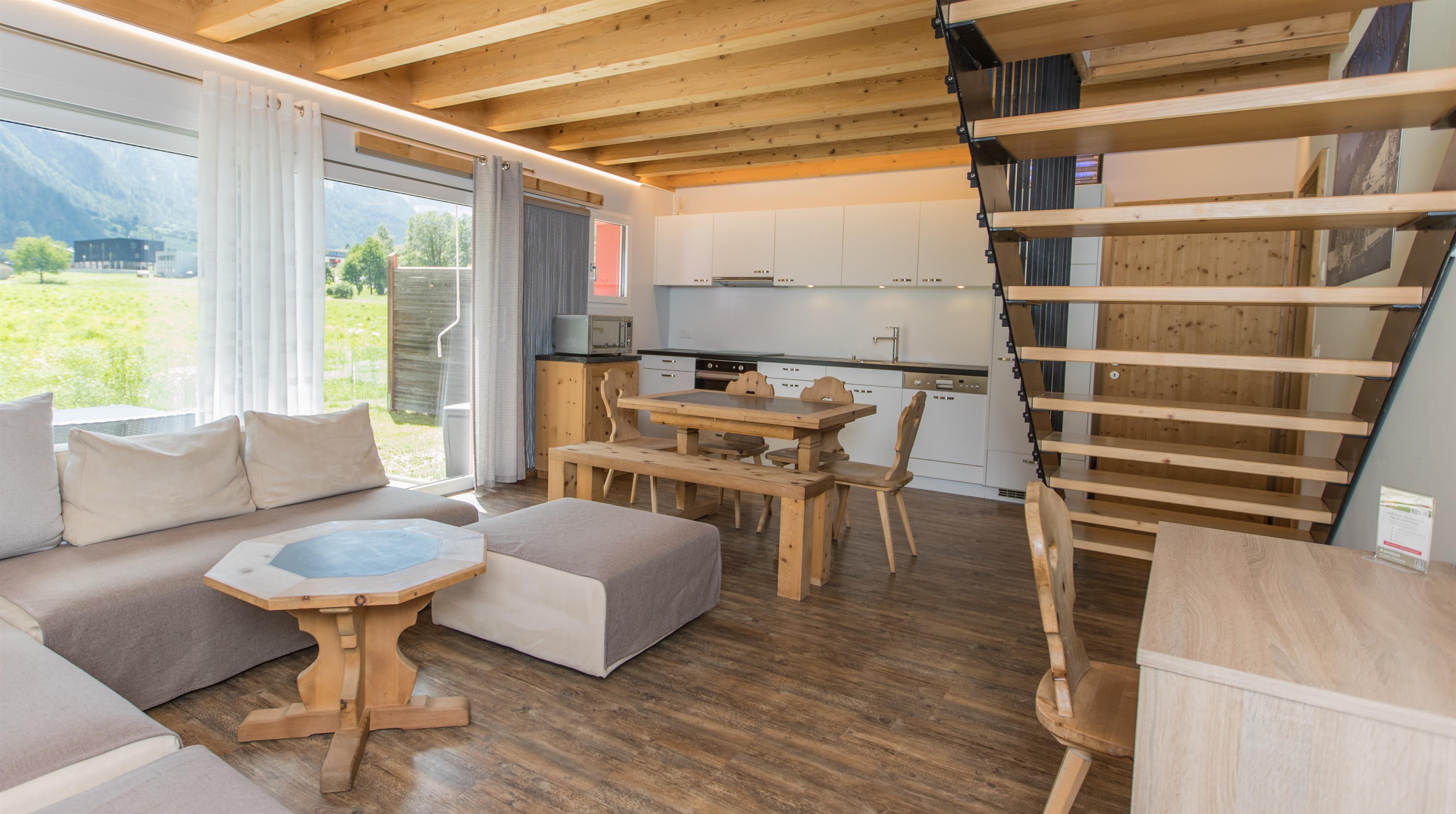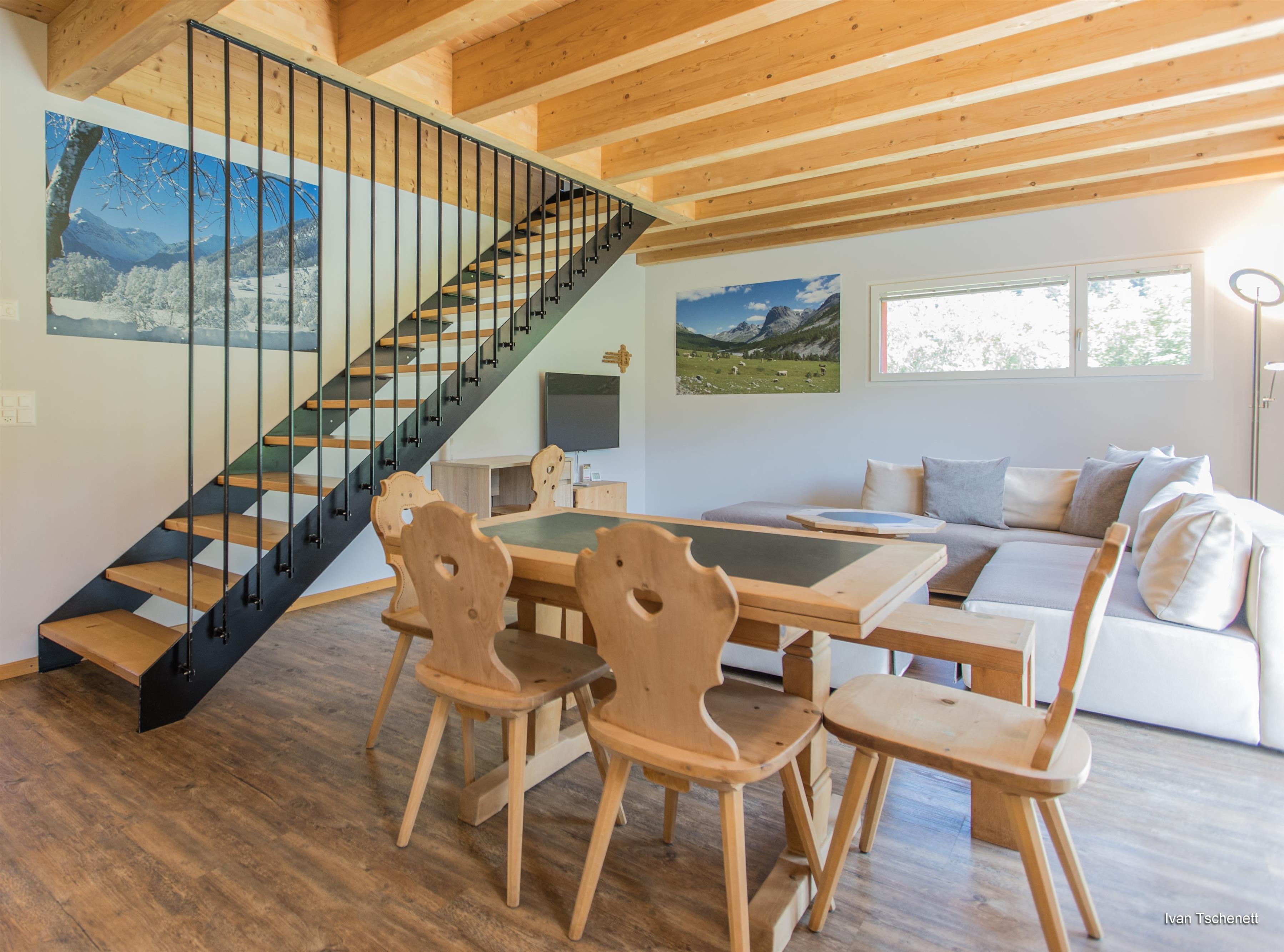 We´ve been leasing our new holiday flat since 2011. It´s designed to make you feel like you´re renting a private holiday home. The ground floor has a modern kitchen-living room with dishwasher; rustically furnished with Swiss stone pine table and chairs; wooden ceiling and view balcony; TV and Internet connection. Through the glass façade, you´ll enjoy a view of green landscape with Piz Lad and splendid mountain scenery in the background. You can access the sitting area directly through the sliding door. All you´ll hear is the quiet murmur of the Rom River. The 1st floor has 1 room with a double bed, 1 room with 2 single beds, 1 children´s room with 2 single beds, WC with bath and washing machine. Option to lease 1 additional room with 2 beds on the ground floor, with separate WC/shower. In the shoulder season, the kitchen-living room and additional room can also be leased as a studio flat.