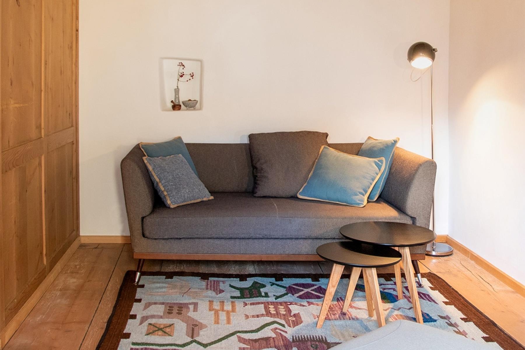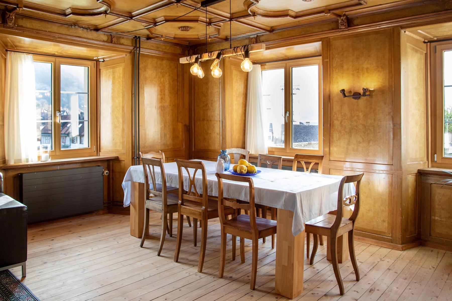 Die alte Wohnstube mit modernen Details lädt zum gemütlichen Verweilen ein. Im grosszügigen Raum steht der Esstisch für acht Personen - zudem ein wunderschöner Kachelofen und eine Sofaecke.Küche