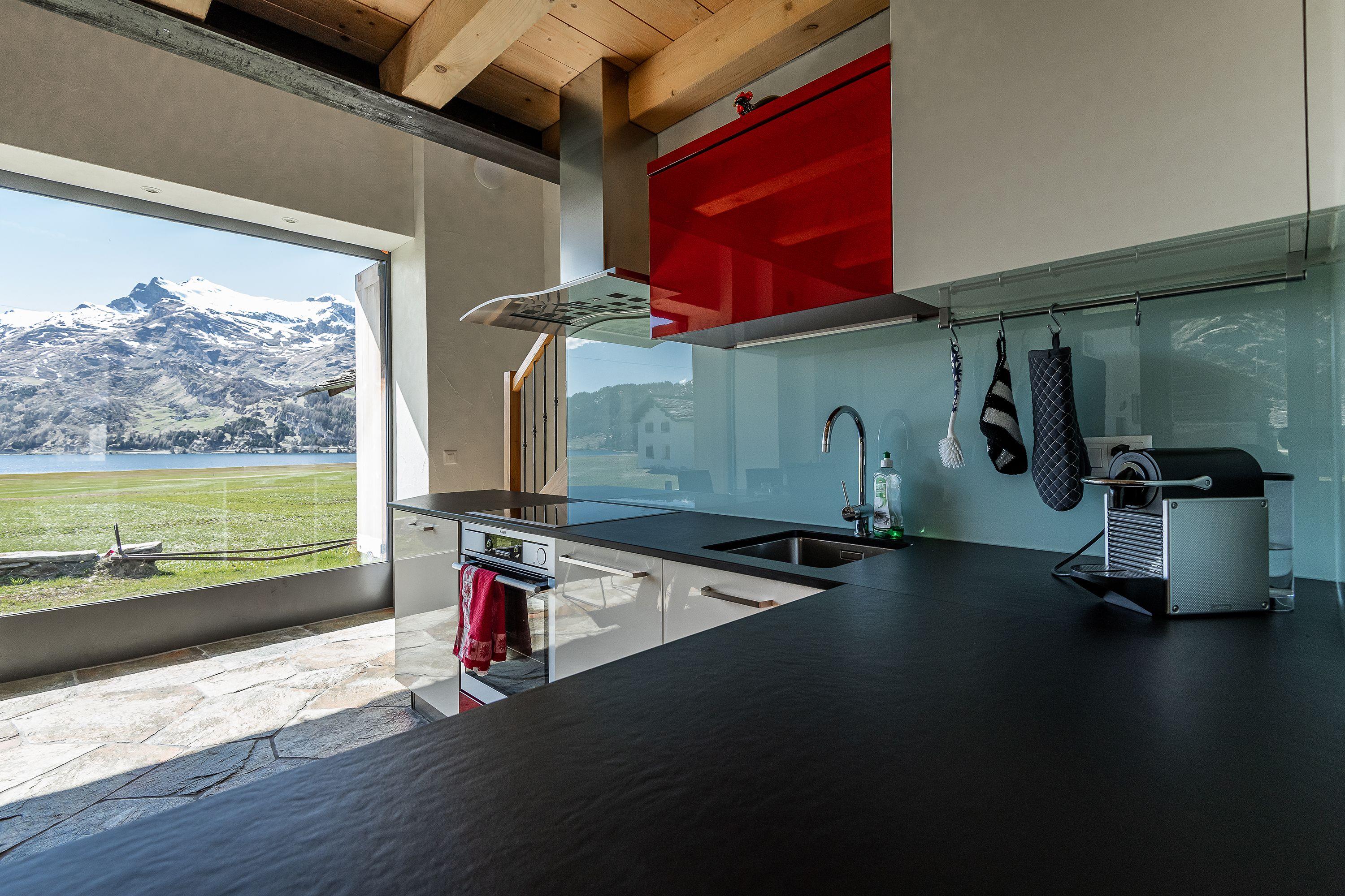 Whether you stay in the double bed on the gallery or in the entrance area, the comfortable beds and cosy atmosphere as well as the peace and quiet in the middle of Isola guarantee restful nights. Outside, the small veranda or inside, the large window invites you to enjoy morning coffees or evening sunsets while marvelling at the view of Lake Sils and Maloja.
