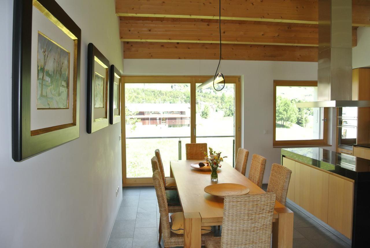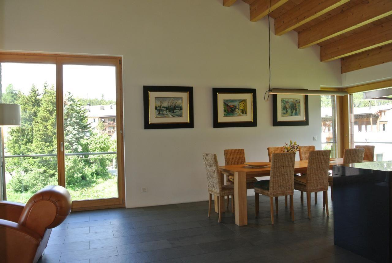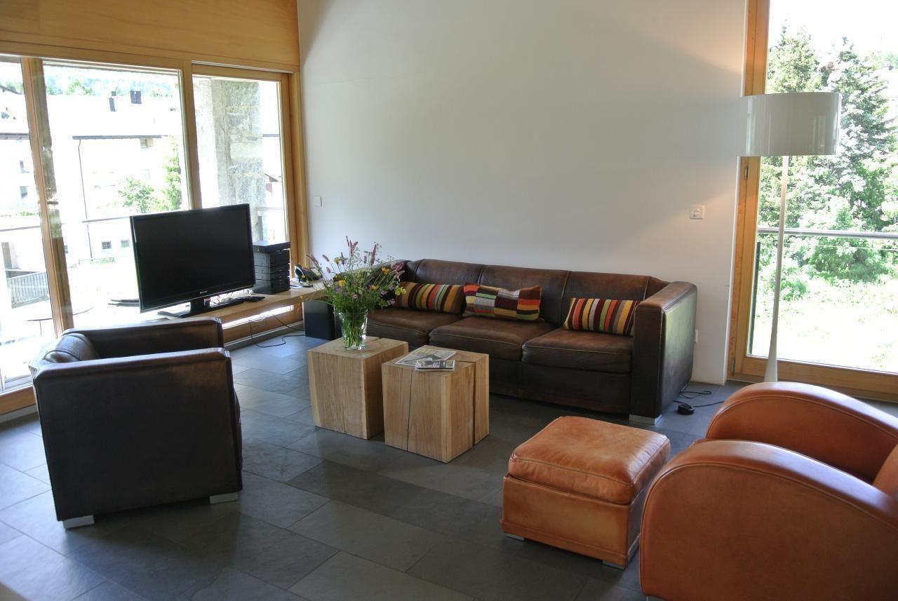 Inside, the holiday flat impresses with its spaciousness and high-quality furnishings. The large master bedroom with separate dressing room and en-suite bathroom, equipped with shower, WC and bathtub, offers a picturesque view of the Piz da la Margna. You can also enjoy the surrounding forests and mountains from the bathtub. The integrated, state-of-the-art kitchen equipment with free-standing cooking island and brand-name appliances provides a first-class cooking experience. Another highlight is the bright and modern living room, which invites you to linger with its open-plan kitchen, an open fireplace and a maximum ceiling height of approx. 5 metres.