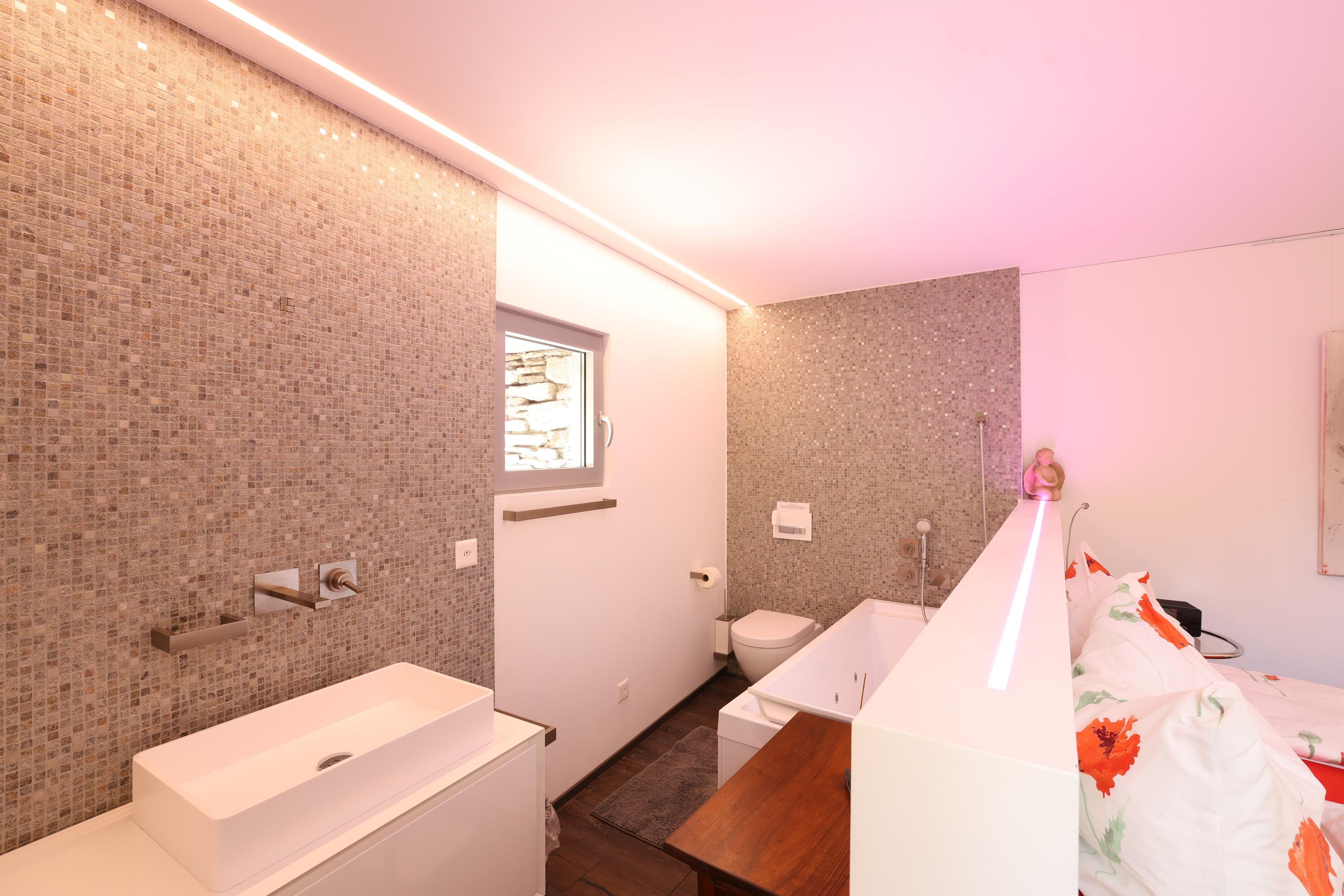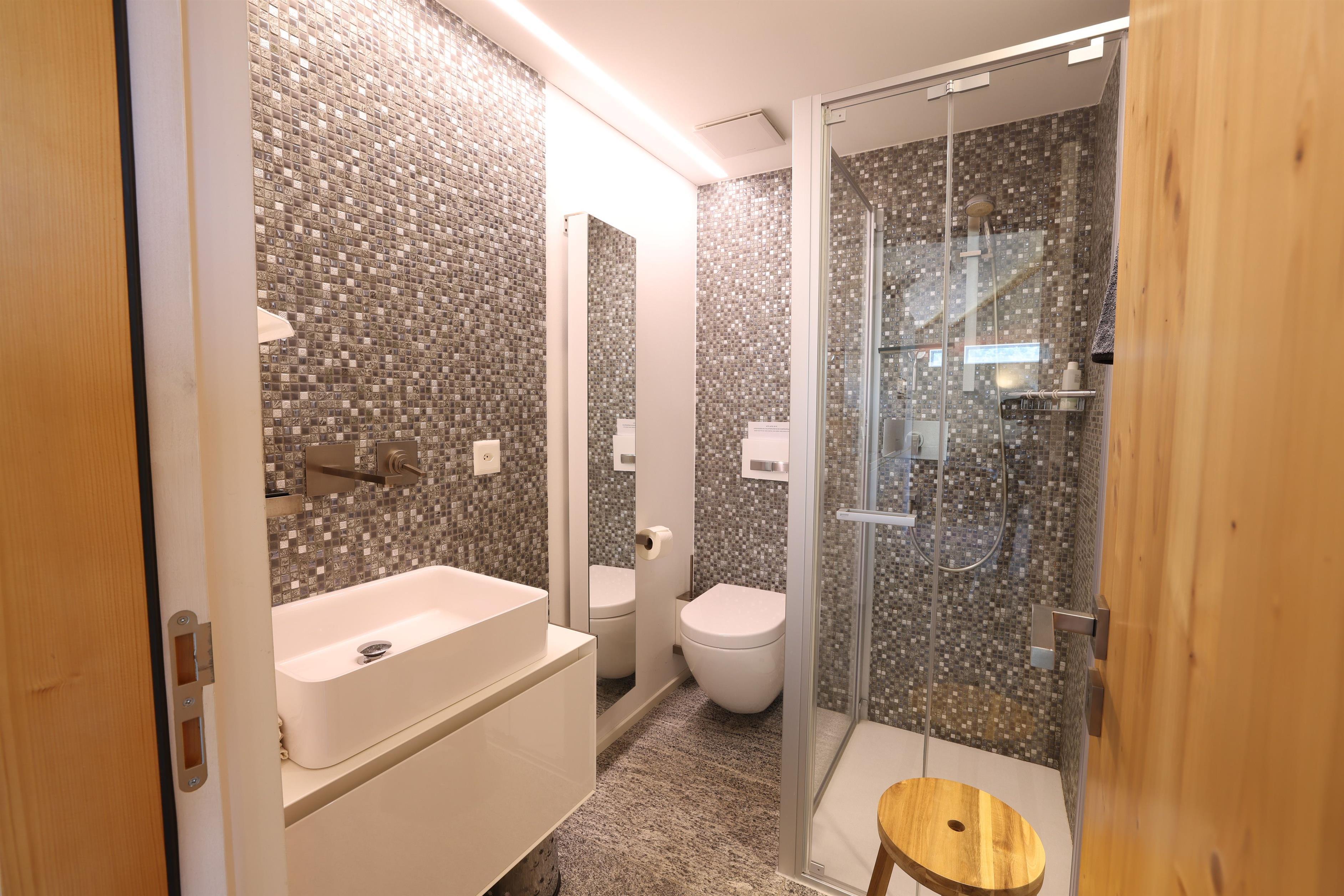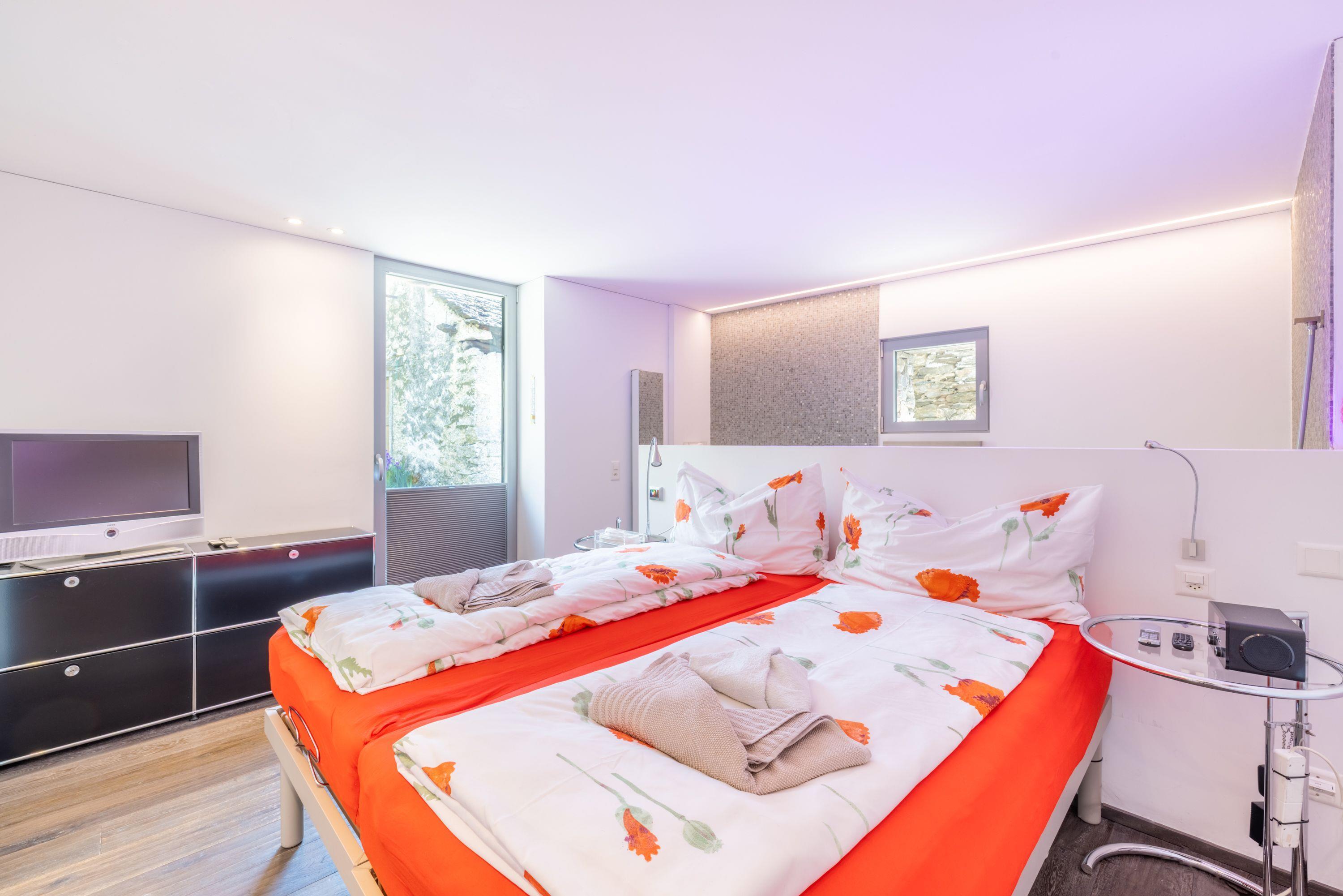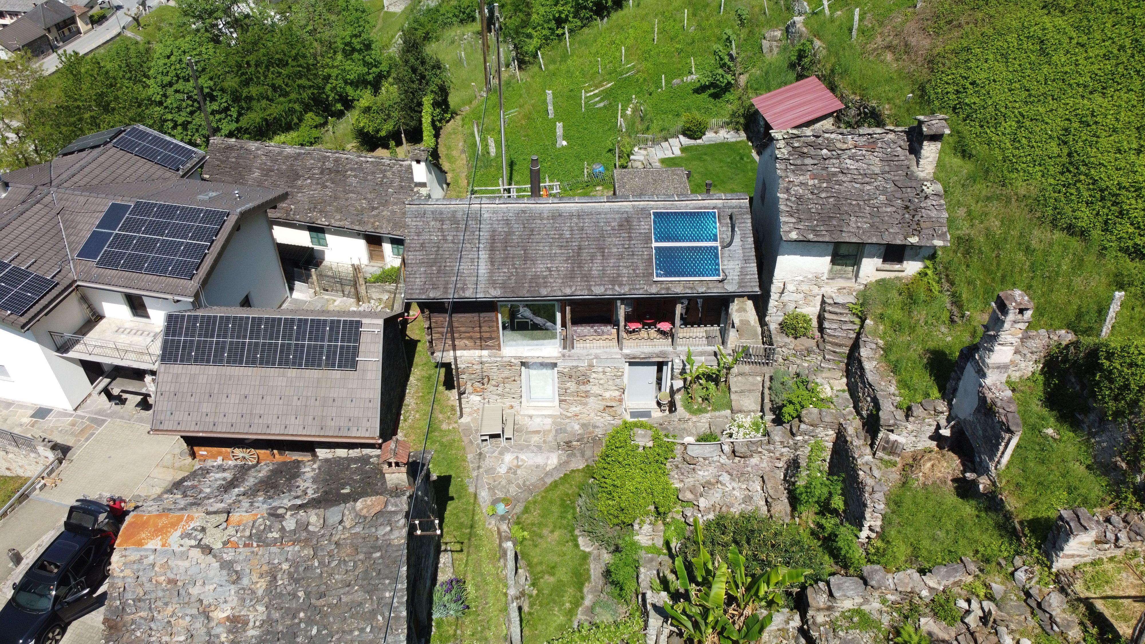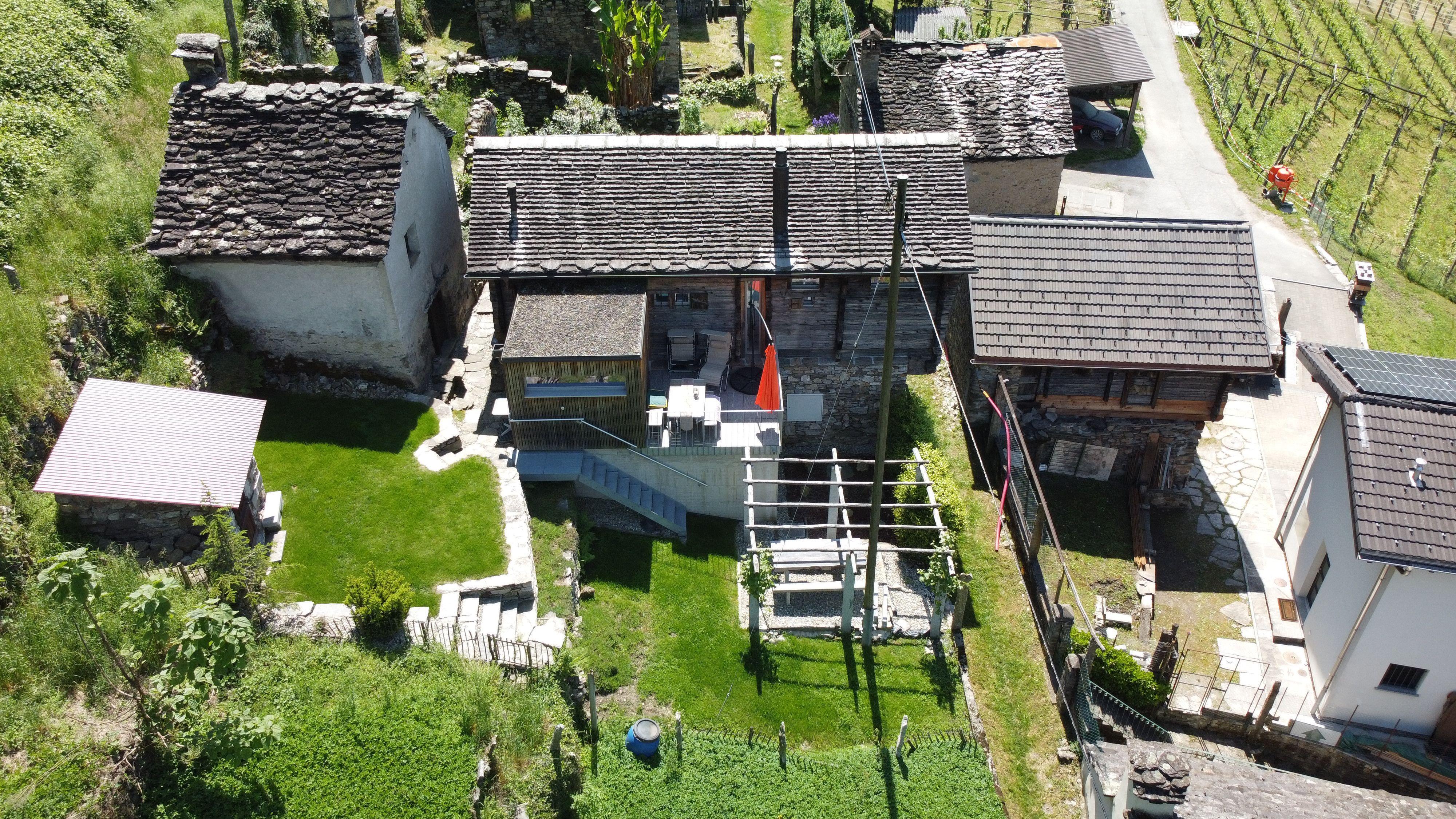 The interior design of the house reflects a harmonious combination of antique charm and modern elegance. Spread over two floors, guests will find a cosy bedroom on the ground floor with an integrated bathroom featuring a luxurious bathtub, a WC and an elegantly designed washbasin. The upper floor opens onto a spacious living and dining area with a fully equipped open-plan kitchen, an office and a wet room, complemented by a wooden veranda and a sun terrace offering picturesque views of the surrounding area. Superior comfort is guaranteed by the use of a heat pump with solar panels, underfloor heating and high-quality WLAN including Swisscom TV.