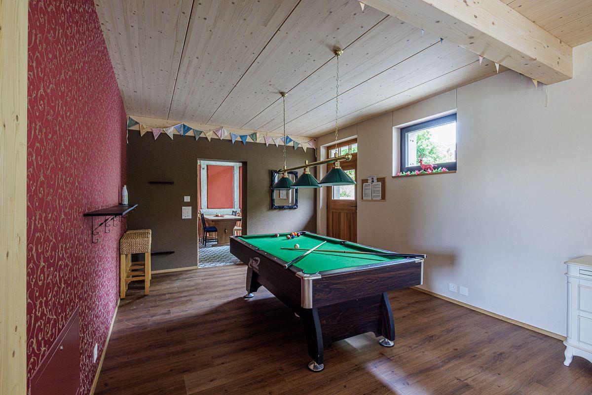 Inside, you will find a fully equipped kitchen with everything your heart desires. From the induction hob and dishwasher to the capsule coffee machine in the kitchen - you can conjure up culinary delights to your heart's content. The bathrooms are equipped with a shower and bathtub; a rain shower promises additional comfort. A smart TV is available for evenings together, while a pool table and lots of toys will keep the children entertained. Underfloor heating provides cosy warmth in all rooms, and a washing machine and tumble dryer are available for communal use.