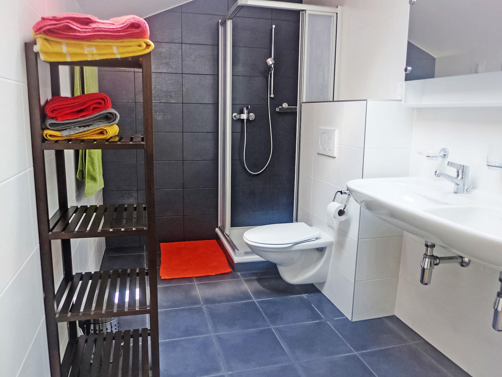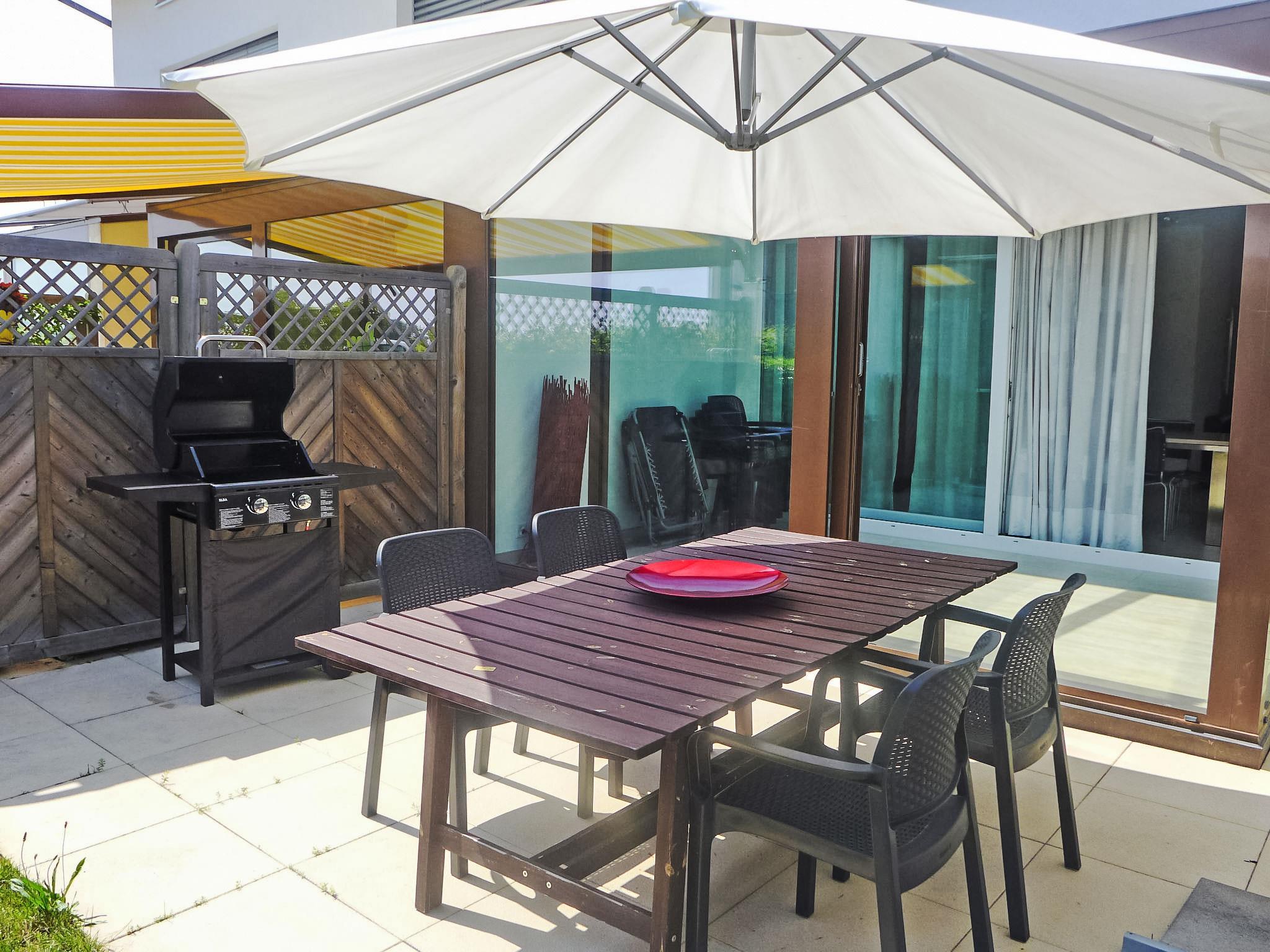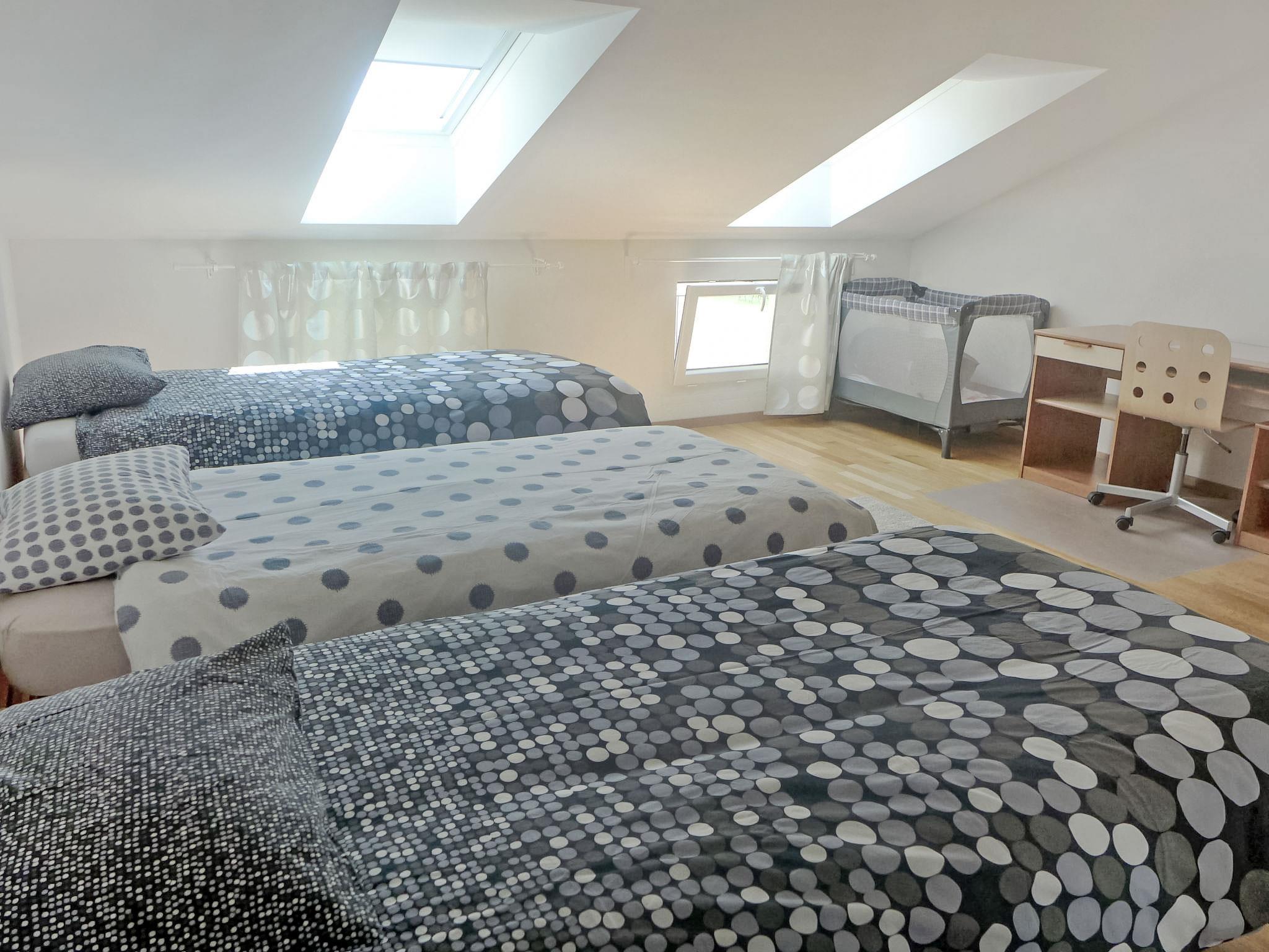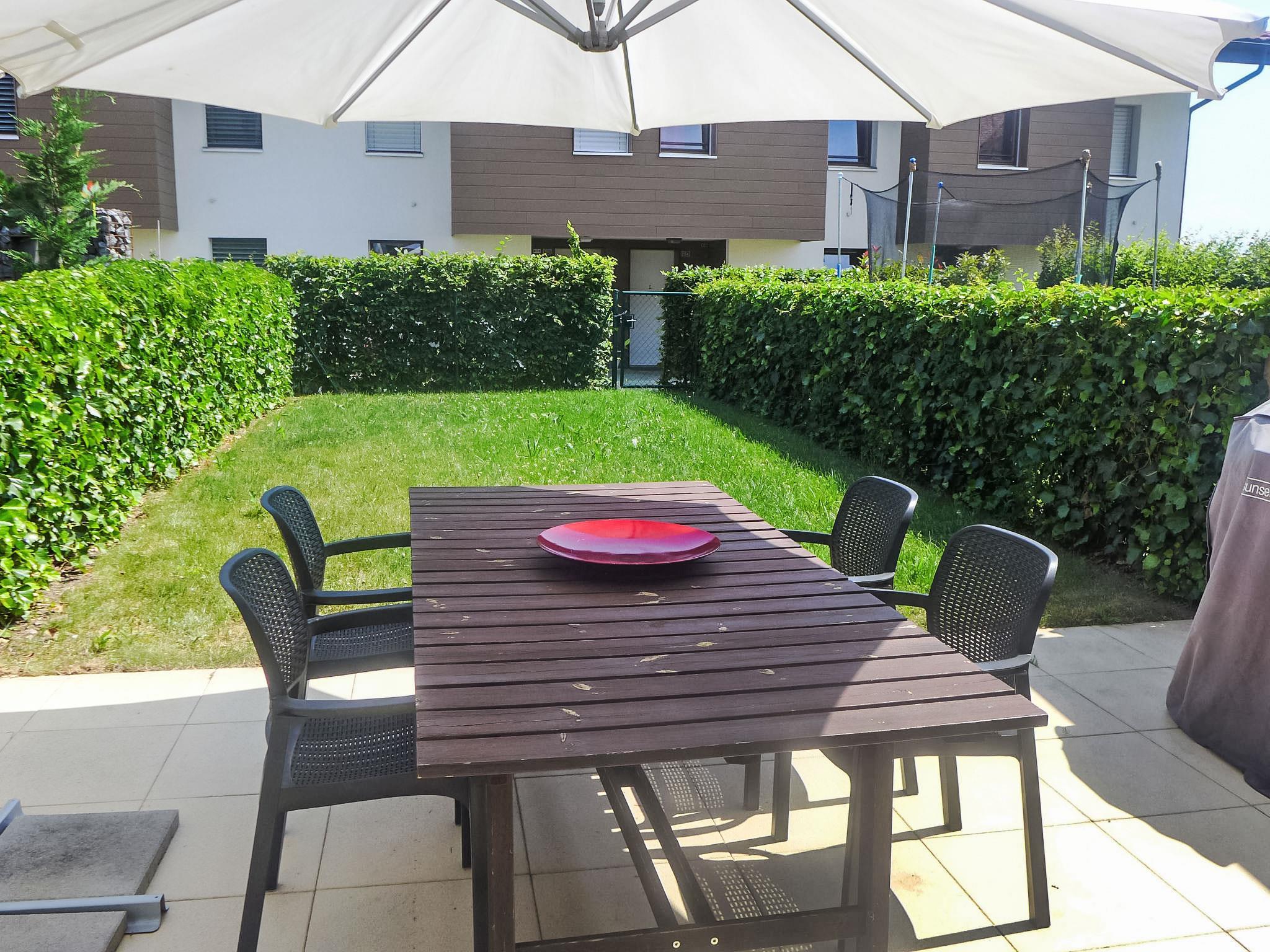5-room terraced house 190 m2 on 3 levels. Comfortable and tasteful furnishings: living/dining room, on 2 levels with winter garden with digital TV, flat screen and hi-fi system. Exit to the garden. Open kitchen in the entrance (oven, dishwasher, 4 ceramic glass hob hotplates, toaster, kettle, microwave, freezer, electric coffee machine, raclette grill, fondue Set (cheese)) with dining table. On the lower ground floor: sep. WC. Upper floor: 1 room with 1 french bed (1 x 160 cm, length 200 cm). Bath/WC, double hand-basin. 2nd upper floor: 2 rooms, each room with 1 french bed (1 x 140 cm, length 200 cm). Top floor: 1 double bedroom with sloping ceilings with panoramic window with 3 beds and shower/WC. Garden 160 m2. Barbecue, deck chairs, box-room. Partial view of the lake and the countryside. Facilities: washing machine, dryer, iron, children's high chair. Internet (WiFi, free). Parking, garage. Please note: non-smokers only.