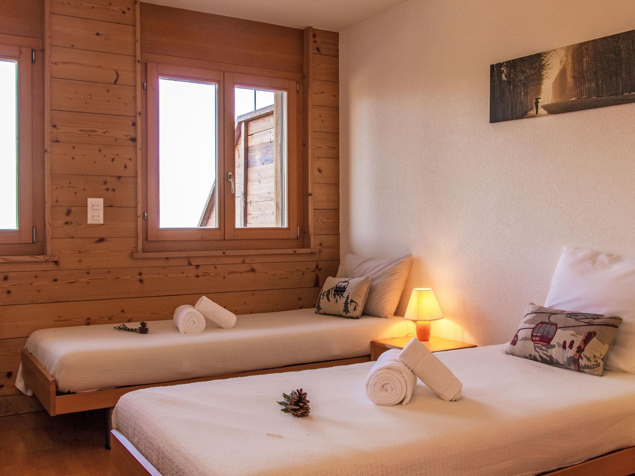 "Grands Ducs 101G", 4-room apartment 95 m2 on 1st floor. Comfortable furnishings: living/dining room with panoramic window with open-hearth fireplace, cable TV, video and hi-fi system. Exit to the terrace. 1 room with 1 french bed (180 cm, length 200 cm). Exit to the garden. 2 rooms, each room with 2 beds (90 cm, length 200 cm). Open kitchen (oven, dishwasher, 4 ceramic glass hob hotplates, microwave, freezer, raclette grill, fondue Set (cheese)). Bath/WC, shower/WC. Large terrace 105 m2, north facing position and west facing position, garden 70 m2. Terrace furniture. Panoramic view of the mountains and the valley. Facilities: children's high chair, baby cot, hair dryer. Internet (WiFi, free). Parking space n 101, garage, height 210 cm, width 230 cm. Please note: non-smokers only.