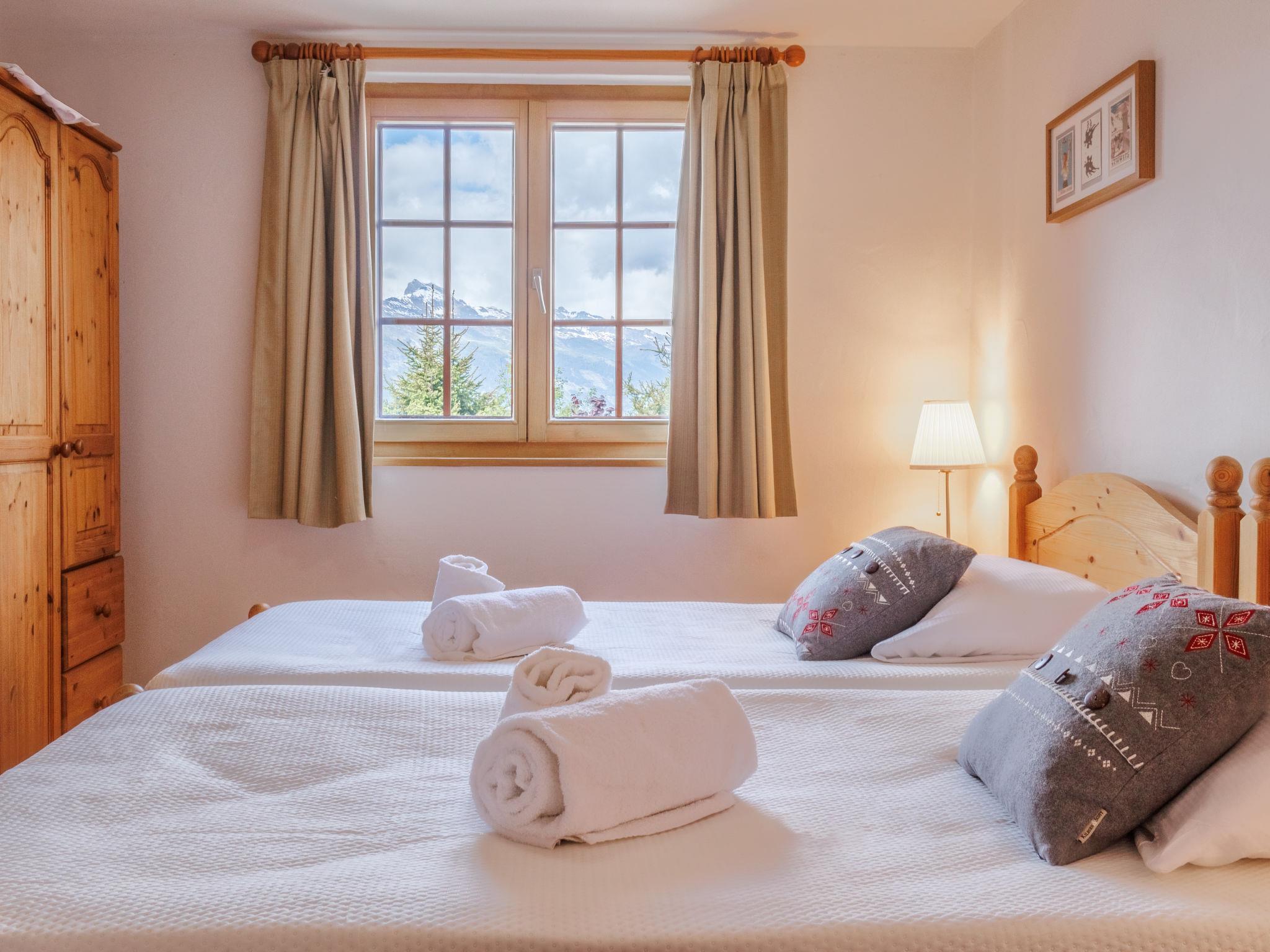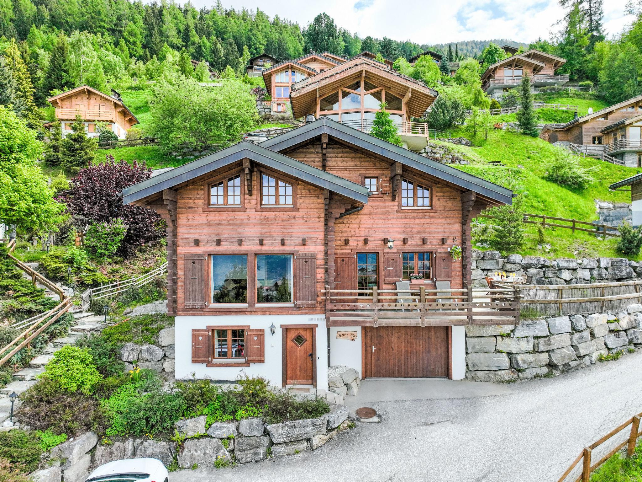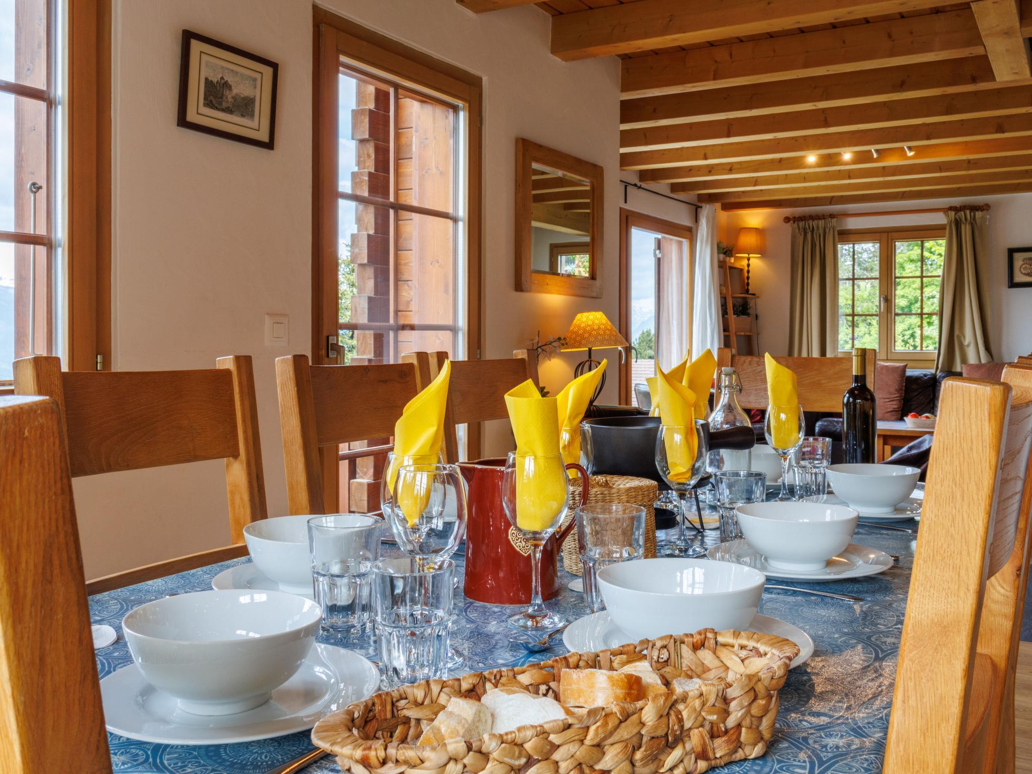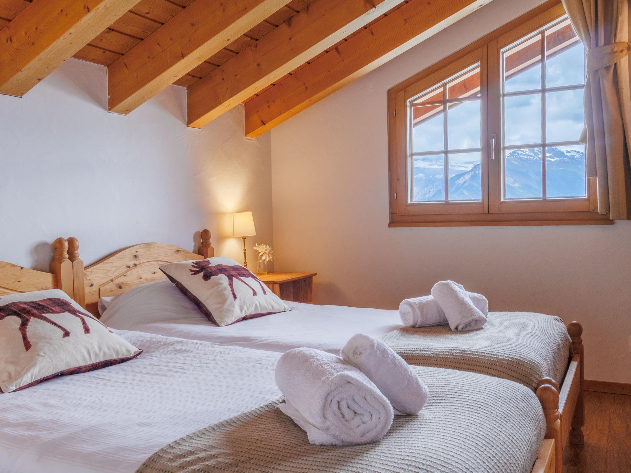 "Petit Nid", 5-room chalet 167 m2 on 3 levels. Spacious, comfortable and beautiful furnishings: living/dining room with Scandinavian wood stove, cable TV and DVD. Exit to the balcony, to the terrace, north facing position and west facing position. 1 room with 2 beds (90 cm, length 200 cm), shower/WC. Open kitchen (oven, dishwasher, 4 ceramic glass hob hotplates, toaster, kettle, microwave, electric coffee machine, Capsules for coffee machine (Nespresso) extra, raclette grill, fondue Set (cheese)). Underfloor heating. On the lower ground floor: 1 room with 2 beds (90 cm, length 200 cm), shower/WC. Entrance hall. Upper floor: 1 large room with 1 french bed (160 cm, length 200 cm), bath/shower/WC. 1 room with 2 beds (90 cm, length 200 cm), shower/WC. Balcony 10 m2, north facing position, large terrace 33 m2, west facing position. Terrace furniture, barbecue, deck chairs (2). Marvellous panoramic view of the mountains, the valley and the resort. Facilities: washing machine, dryer, children's high chair, baby cot, hair dryer. Internet (WiFi, free). Parking (1 car), garage (1 car). Please note: non-smoking house.