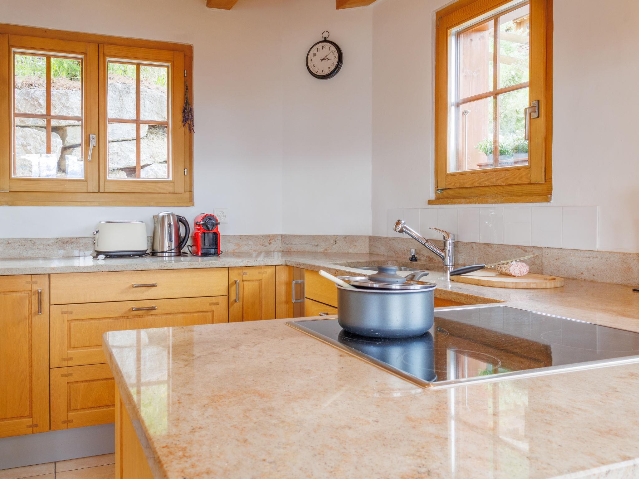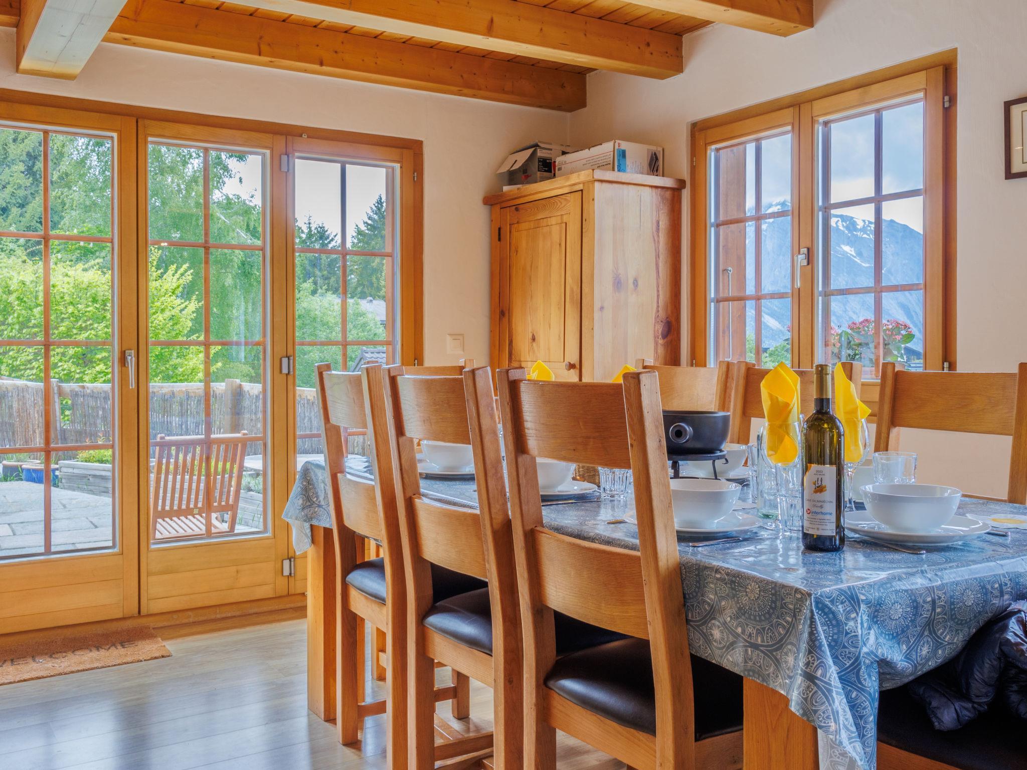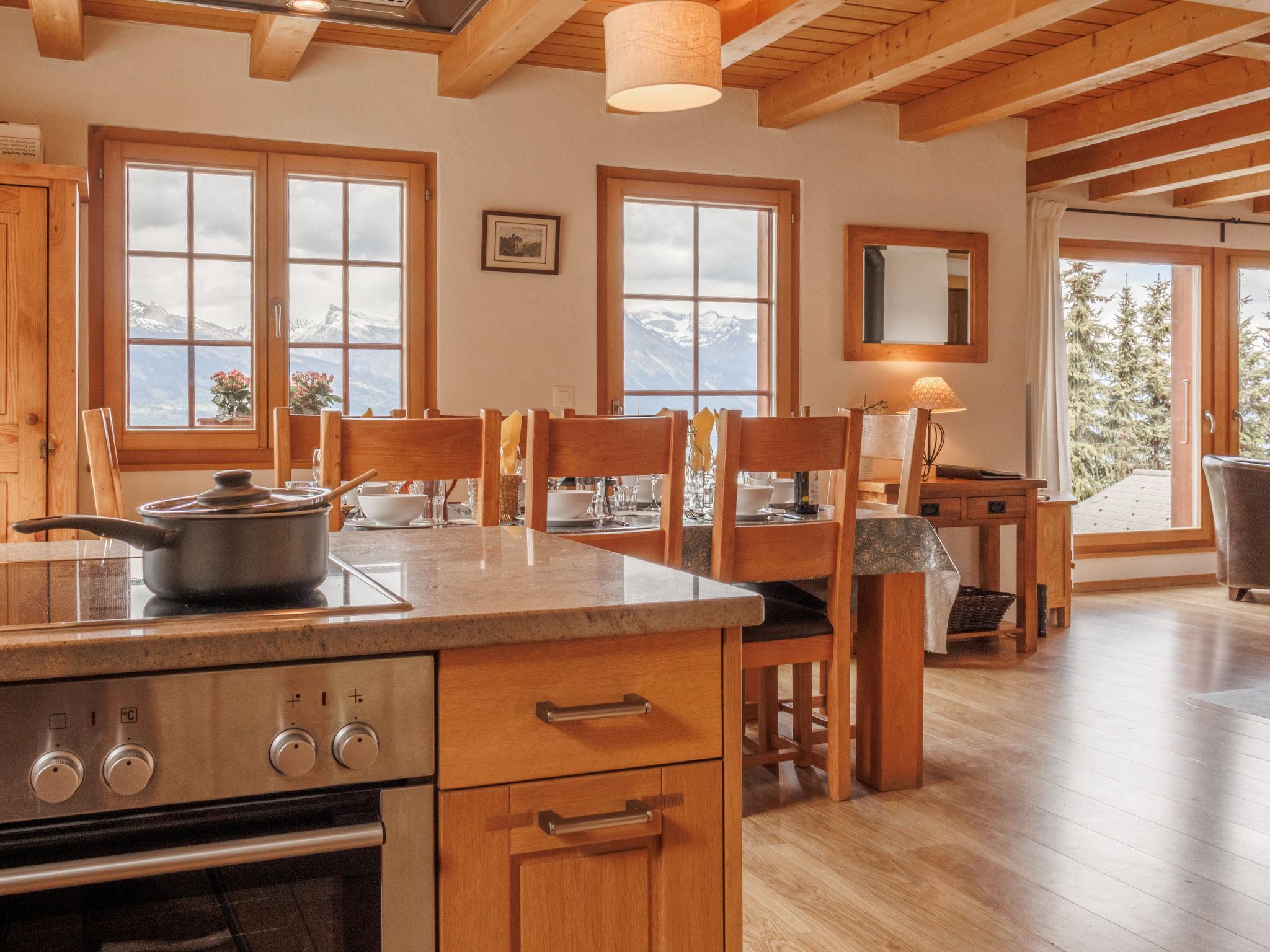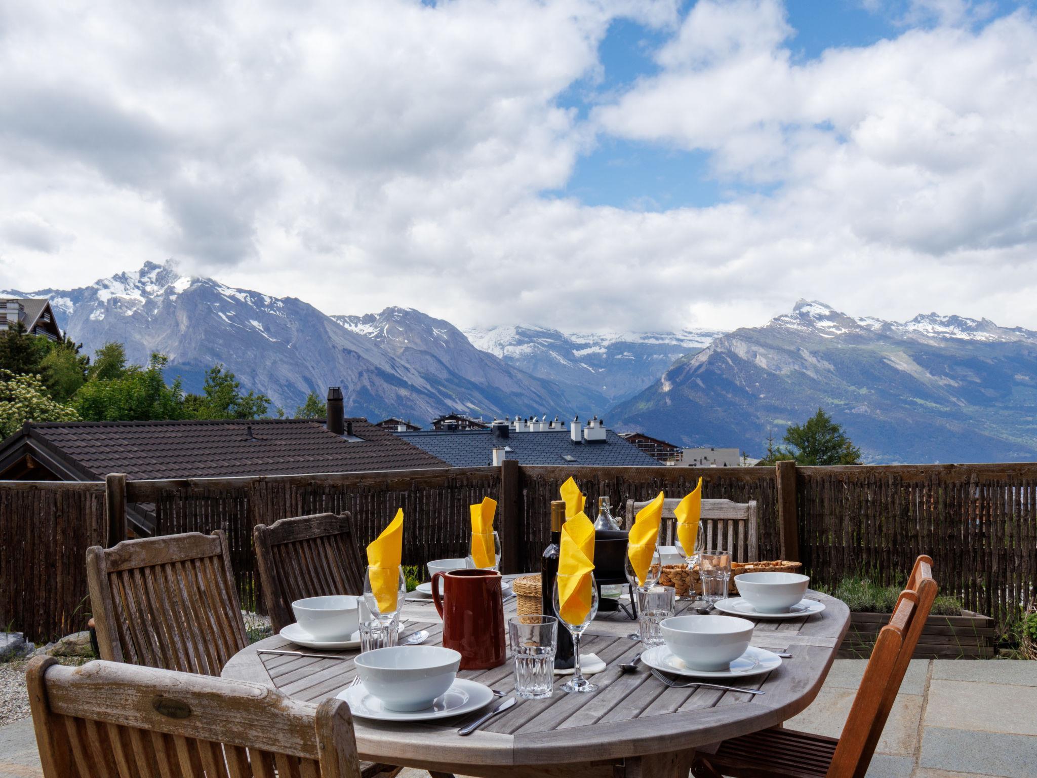 "Petit Nid", 5-room chalet 167 m2 on 3 levels. Spacious, comfortable and beautiful furnishings: living/dining room with Scandinavian wood stove, cable TV and DVD. Exit to the balcony, to the terrace, north facing position and west facing position. 1 room with 2 beds (90 cm, length 200 cm), shower/WC. Open kitchen (oven, dishwasher, 4 ceramic glass hob hotplates, toaster, kettle, microwave, electric coffee machine, Capsules for coffee machine (Nespresso) extra, raclette grill, fondue Set (cheese)). Underfloor heating. On the lower ground floor: 1 room with 2 beds (90 cm, length 200 cm), shower/WC. Entrance hall. Upper floor: 1 large room with 1 french bed (160 cm, length 200 cm), bath/shower/WC. 1 room with 2 beds (90 cm, length 200 cm), shower/WC. Balcony 10 m2, north facing position, large terrace 33 m2, west facing position. Terrace furniture, barbecue, deck chairs (2). Marvellous panoramic view of the mountains, the valley and the resort. Facilities: washing machine, dryer, children's high chair, baby cot, hair dryer. Internet (WiFi, free). Parking (1 car), garage (1 car). Please note: non-smoking house.