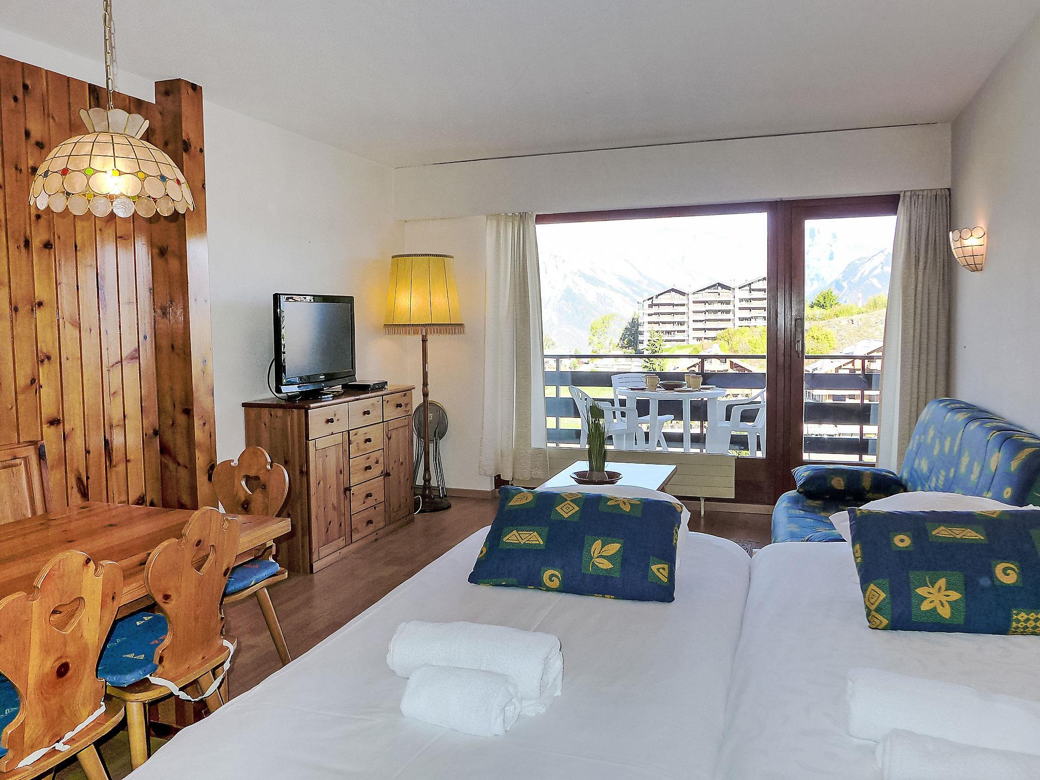 "Christiania 2 Sbel", 1-room apartment 38 m2, on the upper ground floor. Living/dining room with 1 pull-out bed (2 pers. 2 x 90 cm, length 190 cm), cable TV (flat screen). Exit to the balcony. Entrance hall with 1 x 2 bunk beds (80 cm, length 180 cm). Kitchen (3 hot plates, oven, toaster, kettle, microwave, electric coffee machine, Capsules for coffee machine (Delizio) extra, fondue Set (chinoise, cheese)). Bath/WC. Balcony, north facing position. View of the mountains and the resort. Facilities: hair dryer. Internet (WiFi, free). Please note: non-smokers only, no parking. Maximum 1 pet/ dog allowed. Instead of an enclosed bedroom, some sleeping areas are located in an open-plan area (gallery, alcove, etc.).