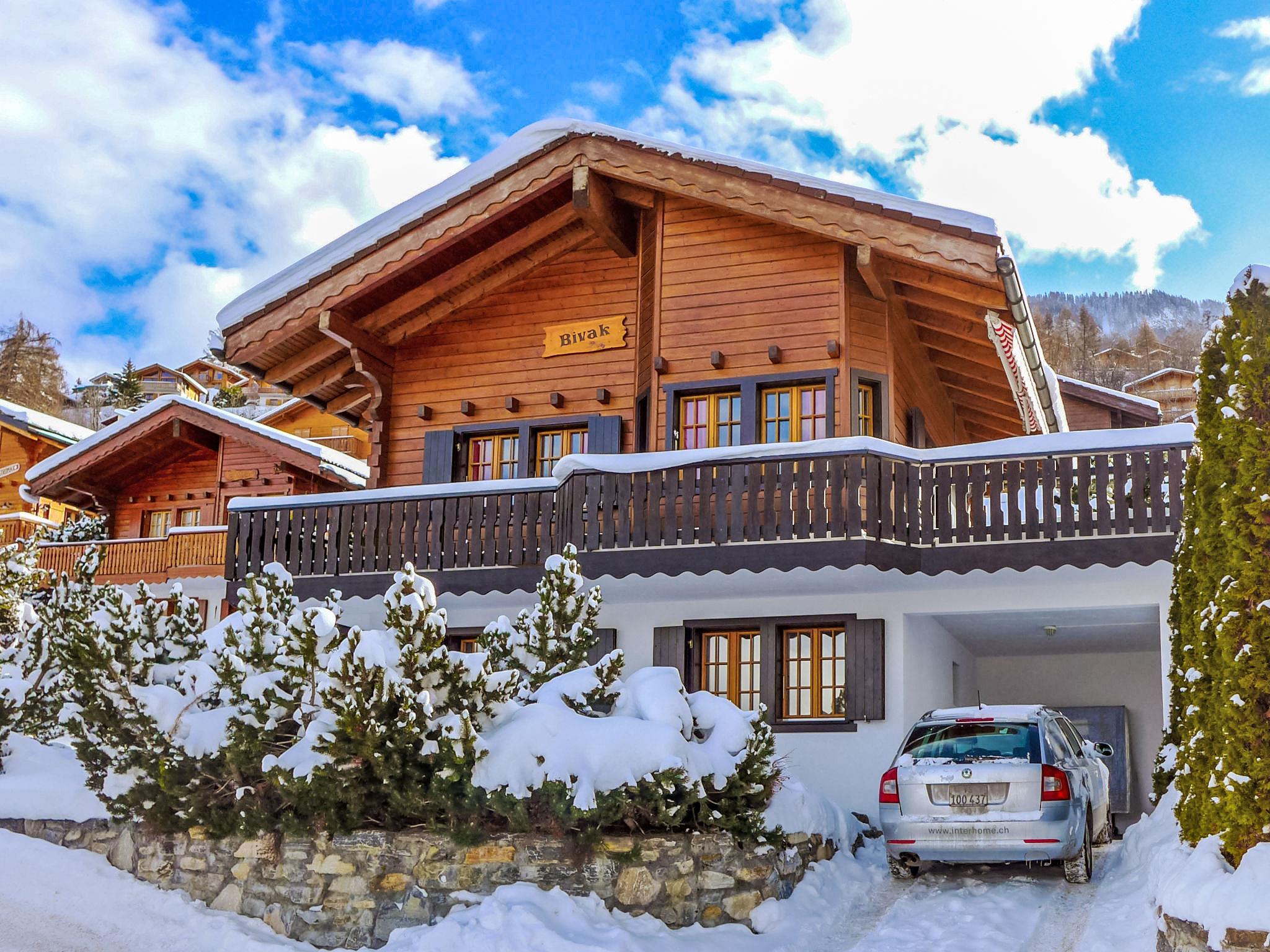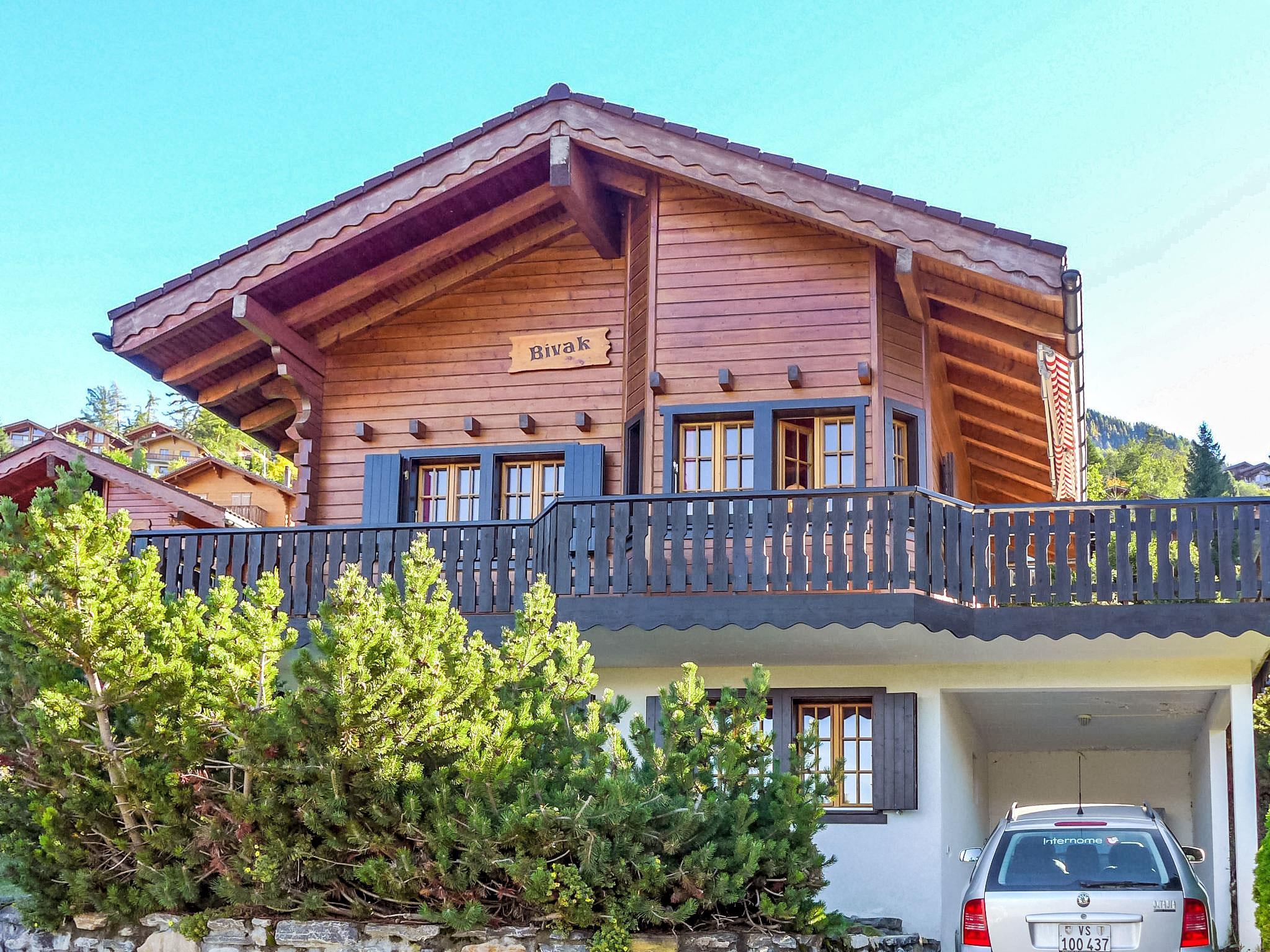 "Bivak", 4-room chalet 100 m2 on 2 levels. Practical furnishings: living/dining room with open-hearth fireplace, separate WC, cable TV and DVD. Exit to the terrace. Open kitchen (4 hot plates, oven, dishwasher, toaster, kettle, electric coffee machine, Capsules for coffee machine (Nespresso) extra, fondue Set (cheese)). Electric heating. On the lower ground floor: 2 double bedrooms, each room with 1 french bed (160 cm, length 200 cm). Exit to the garden, north facing position. Bath/WC. Upper floor: 1 room with sloping ceilings with 2 beds (90 cm, length 200 cm). Terrace, south facing position, garden 600 m2. Terrace furniture. Very beautiful panoramic view. Facilities: washing machine, children's high chair, baby cot, hair dryer. Internet (WiFi, free). Parking (roofed). Please note: non-smoking house.