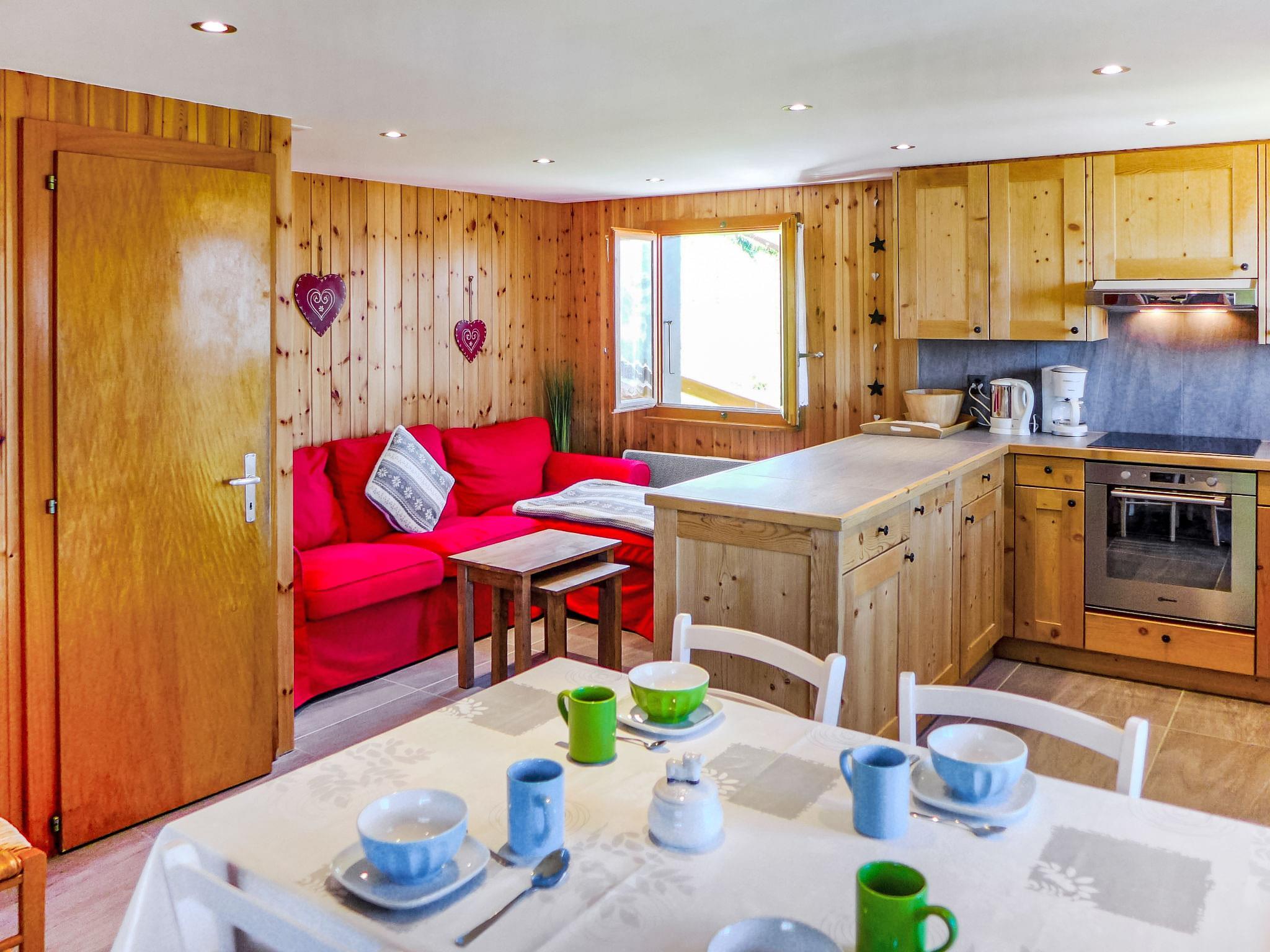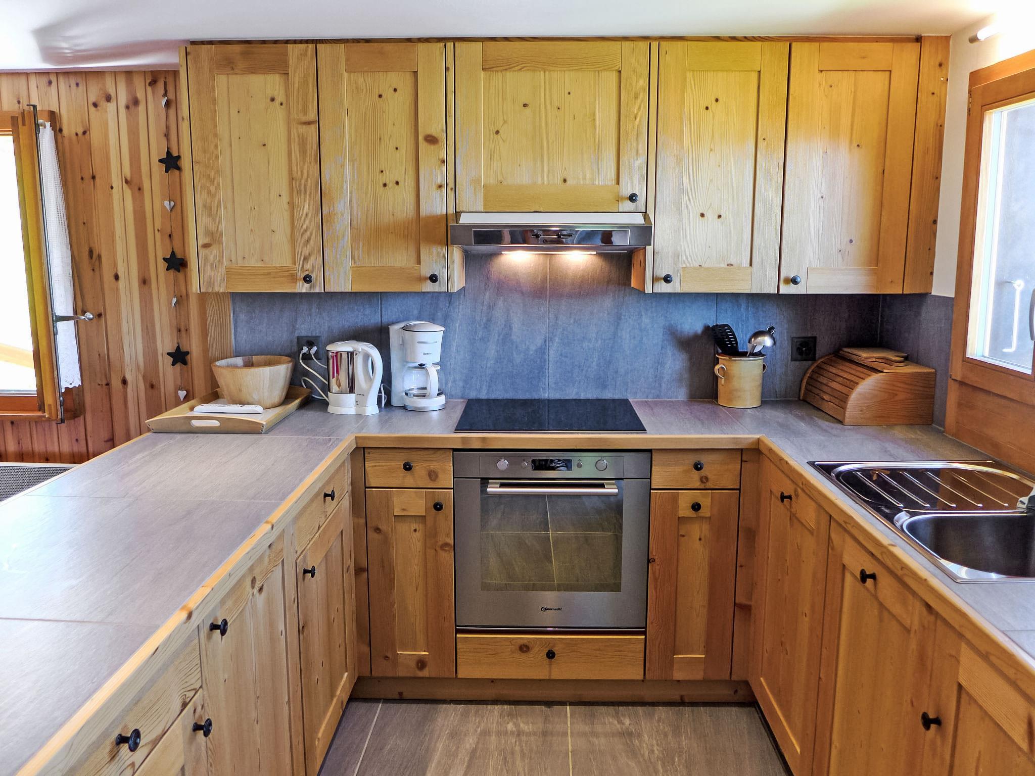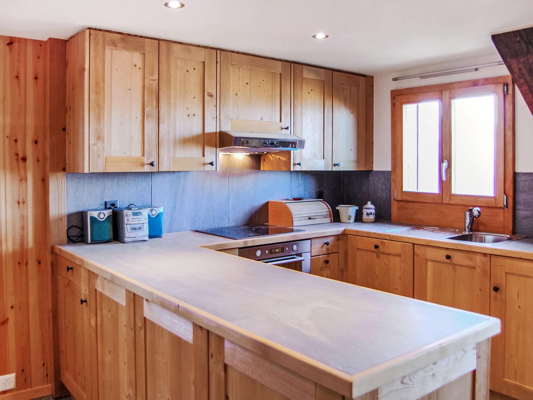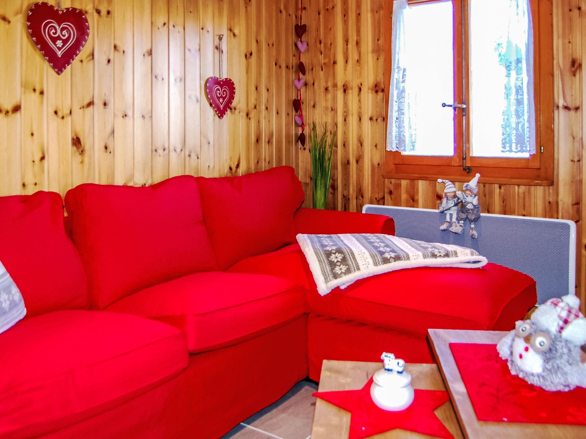 "Le Ruisseau", 3-room chalet 74 m2 on 3 levels. Fully renovated in 2015, beautiful furnishings: small living room with Scandinavian wood stove, dining nook and cable TV. Open kitchen (oven, dishwasher, 4 induction hot plates, toaster, kettle, electric coffee machine, Capsules for coffee machine (Nespresso) extra, raclette grill, fondue Set (cheese)). Shower/WC. Electric heating. On the lower ground floor: 1 room with 2 beds (90 cm, length 200 cm). 1 children's room with 1 x 2 bunk beds (80 cm, length 190 cm). Shower/WC. Top floor: open gallery with sloping ceilings, ceiling height 150 cm with DVD. Small balcony 8 m2, north facing position. Terrace furniture, barbecue, deck chairs (2). Very beautiful view of the mountains and the valley. Facilities: washing machine, dryer, hair dryer. Internet (WiFi, free). Please note: non-smokers only. Instead of an enclosed bedroom, some sleeping areas are located in an open-plan area (gallery, alcove, etc.).