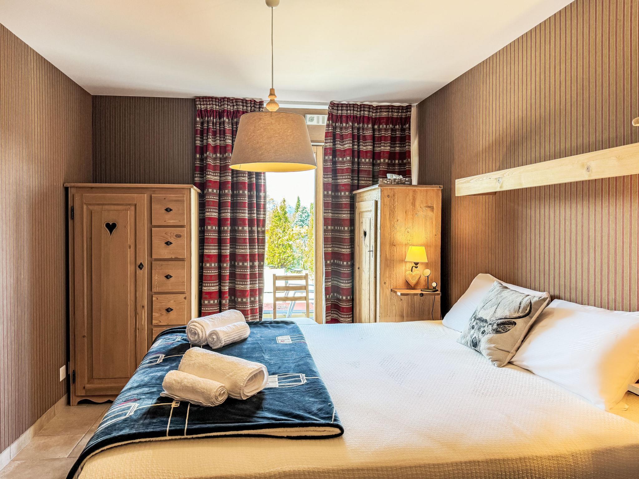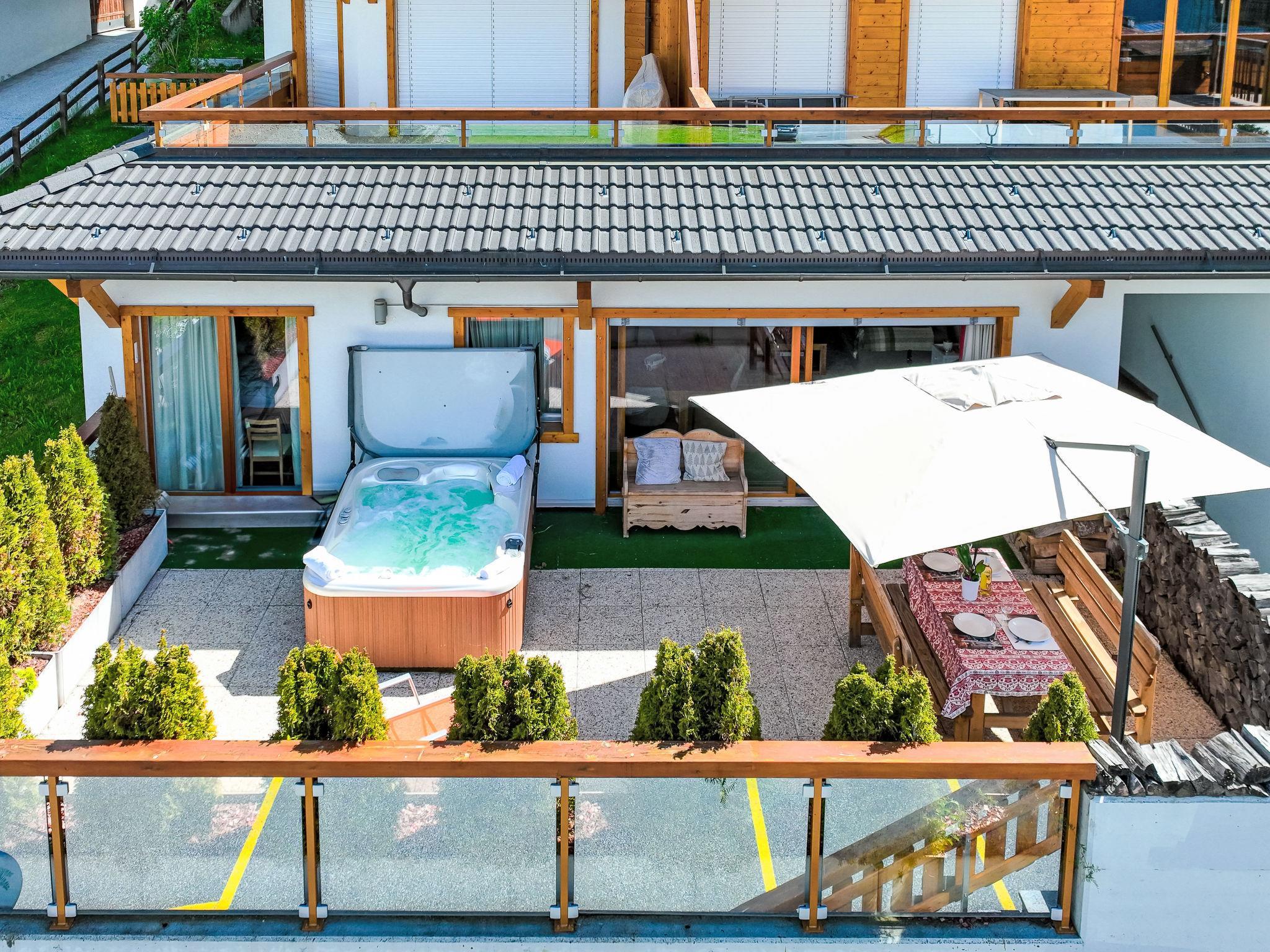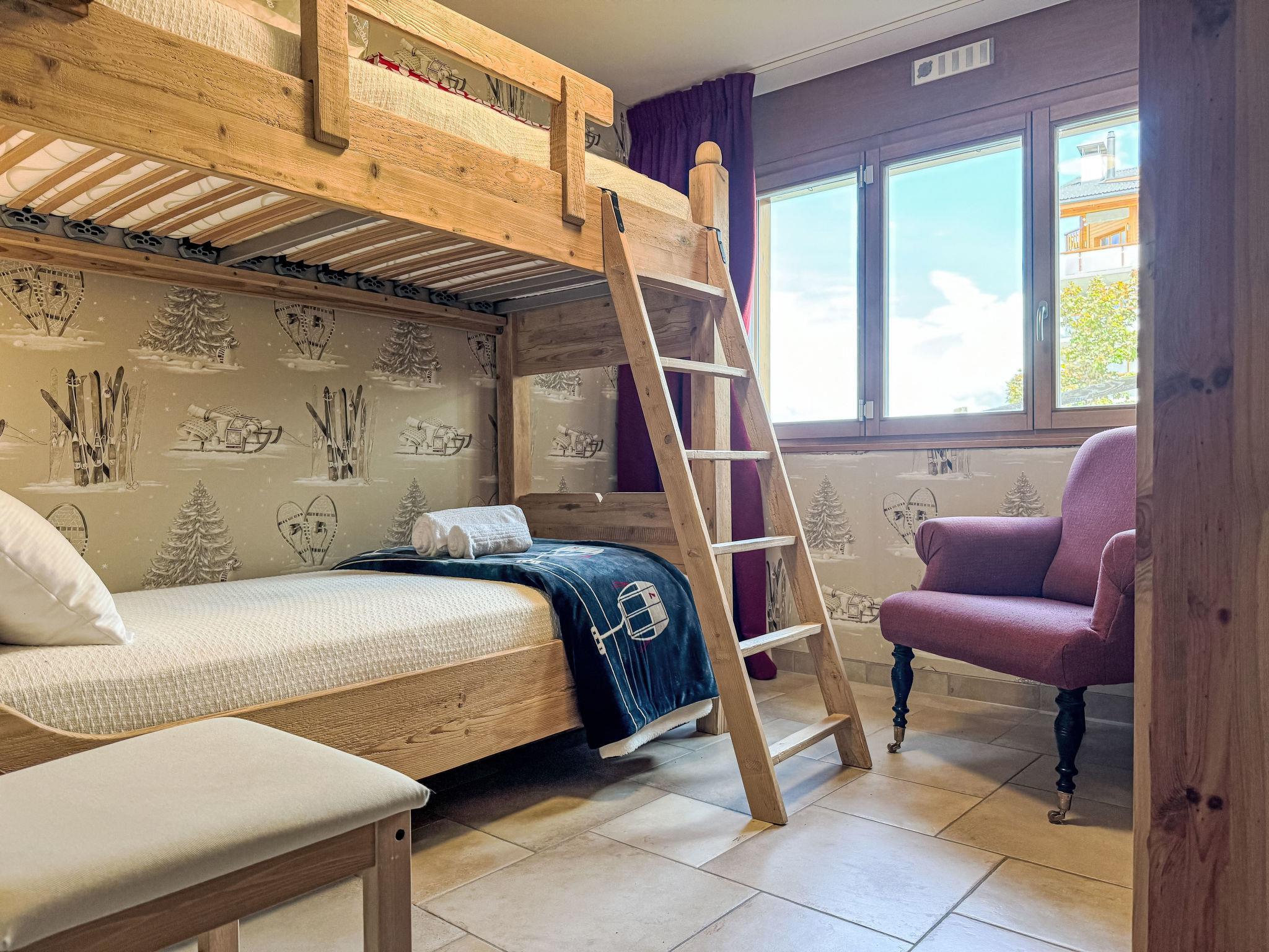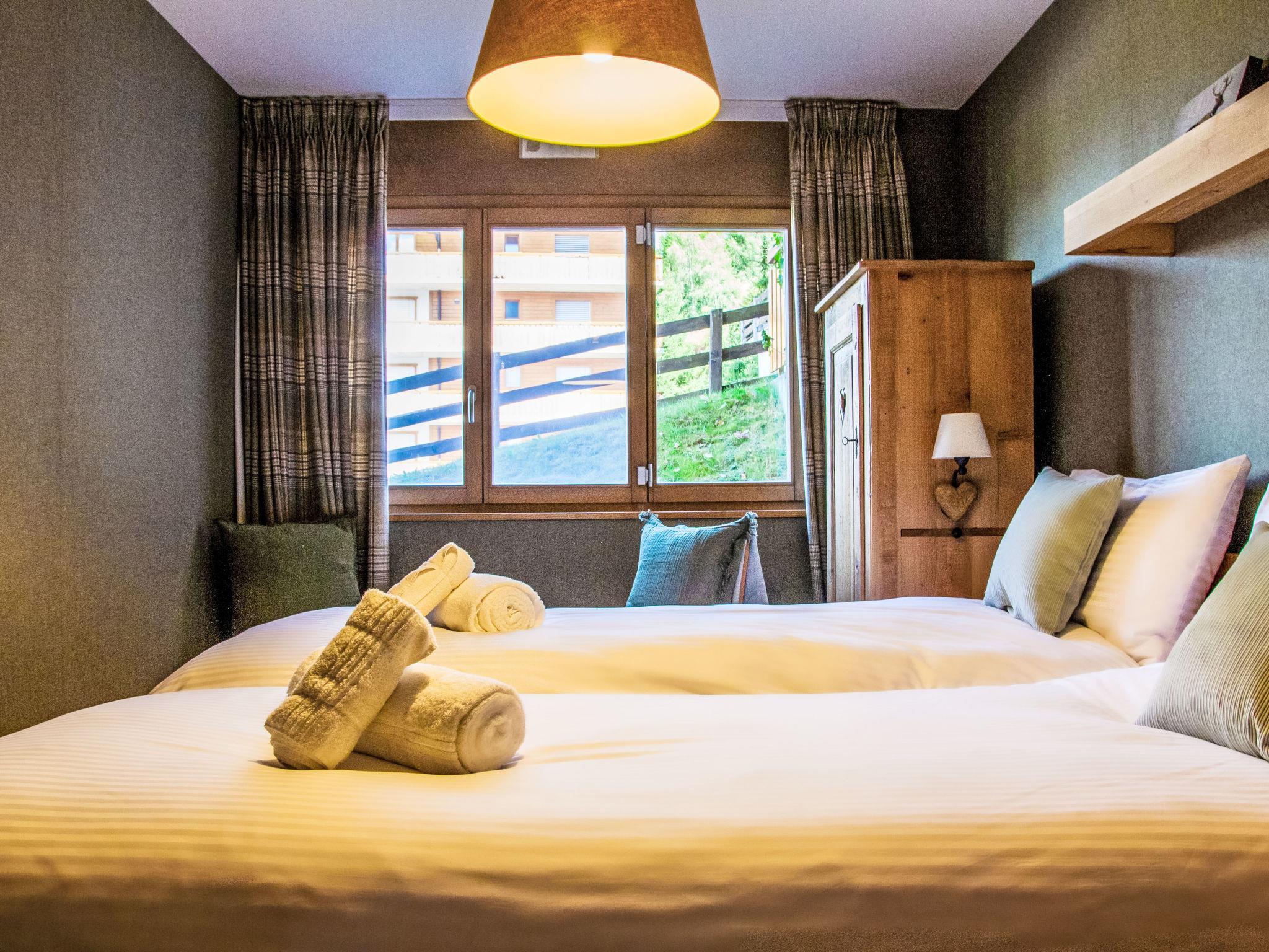 "Cor des Alpes 2", 4-room apartment 100 m2, on the upper ground floor. Comfortable and beautiful furnishings: living/dining room with open-hearth fireplace and cable TV. Exit to the terrace. 1 room with 1 double bed (2 x 90 cm, length 200 cm), bath/WC. 1 room with 1 x 2 bunk beds (90 cm, length 200 cm). 1 room with 2 beds (90 cm, length 200 cm). Open kitchen (dishwasher, 4 induction hot plates, toaster, kettle, microwave, electric coffee machine, Capsules for coffee machine (nespresso) extra, raclette grill, fondue Set (cheese)). Shower/WC. Underfloor heating. Terrace. Terrace furniture. View of the mountains. Facilities: hair dryer. Internet (WiFi, free). Parking. Free use of the pool in the Domaine des Reines building 100m away. Private hot tub on the terrace.