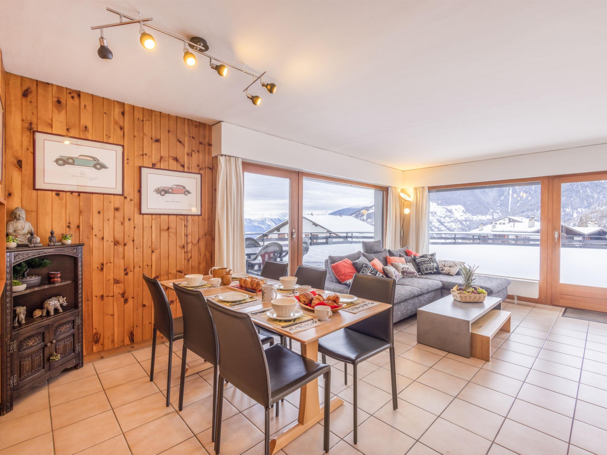"Cerisiers Hrez", 3-room apartment 70 m2, on the ground floor. Living/dining room with open-hearth fireplace (only for decoration), cable TV (flat screen). 1 room with 2 beds (90 cm, length 190 cm). 1 small room with 1 x 2 bunk beds (90 cm, length 180 cm), 1 pull-out bed (2 pers. 2 x 90 cm, length 190 cm). Kitchen (3 hot plates, oven, microwave, electric coffee machine, Capsules for coffee machine (Nespresso), raclette grill, fondue Set (cheese)). Bath/WC, sep. WC. Large terrace, south-east facing position. Terrace furniture. View of the mountains. Facilities: Internet (WiFi, free). Please note: non-smokers only, no parking.