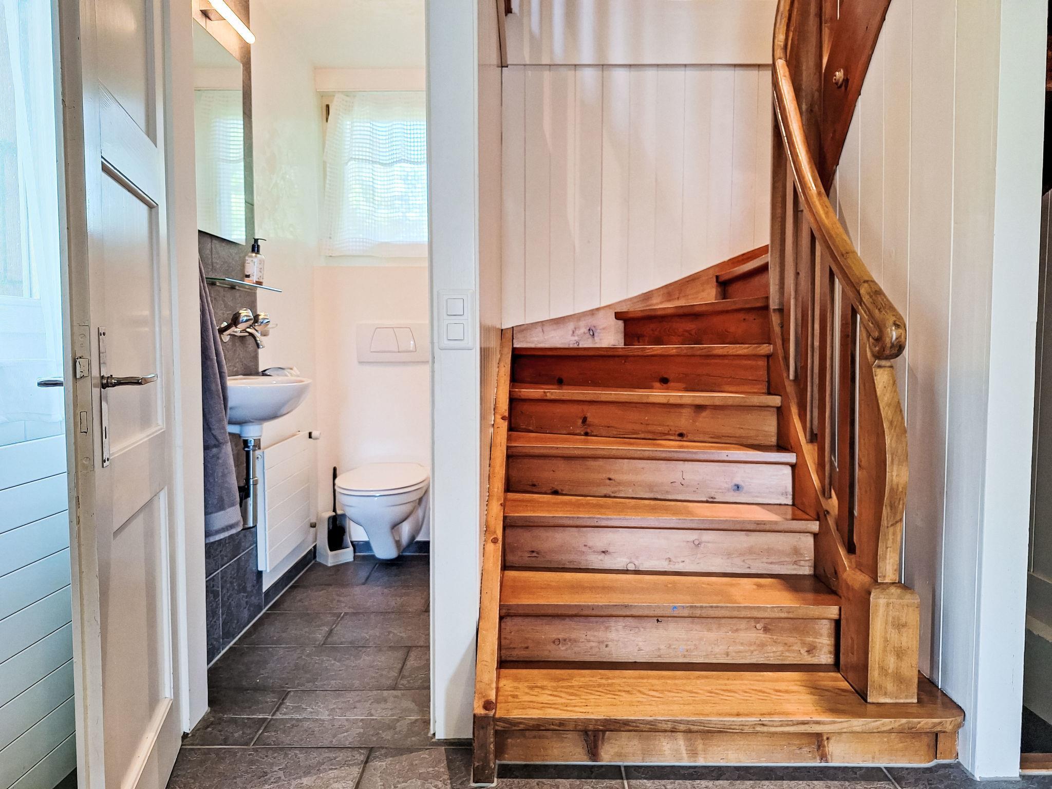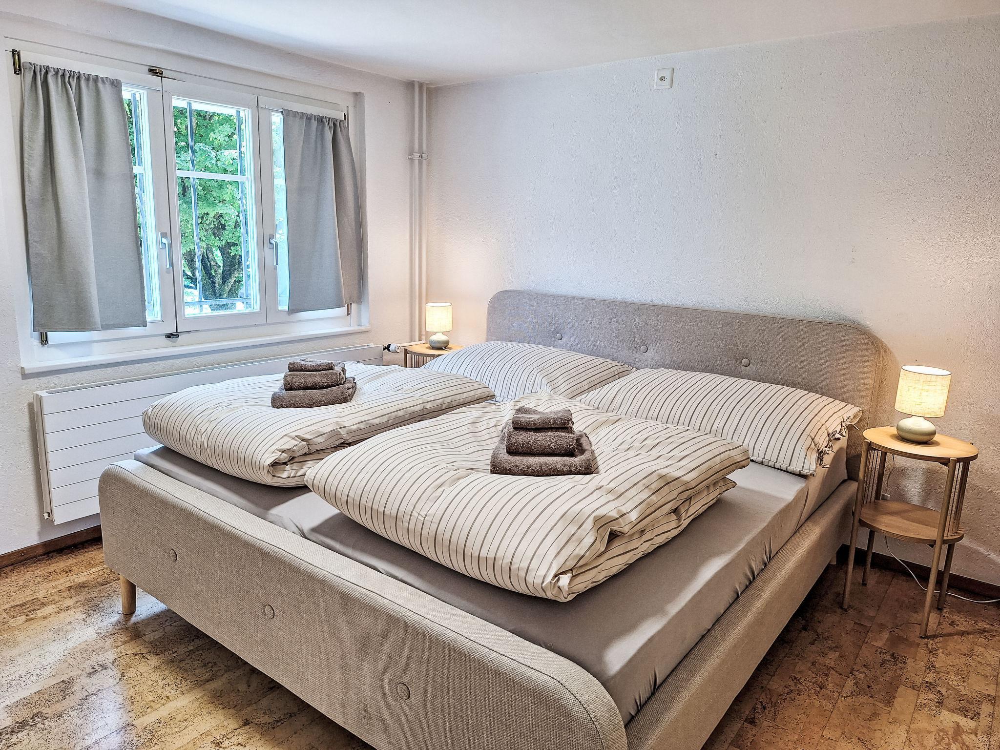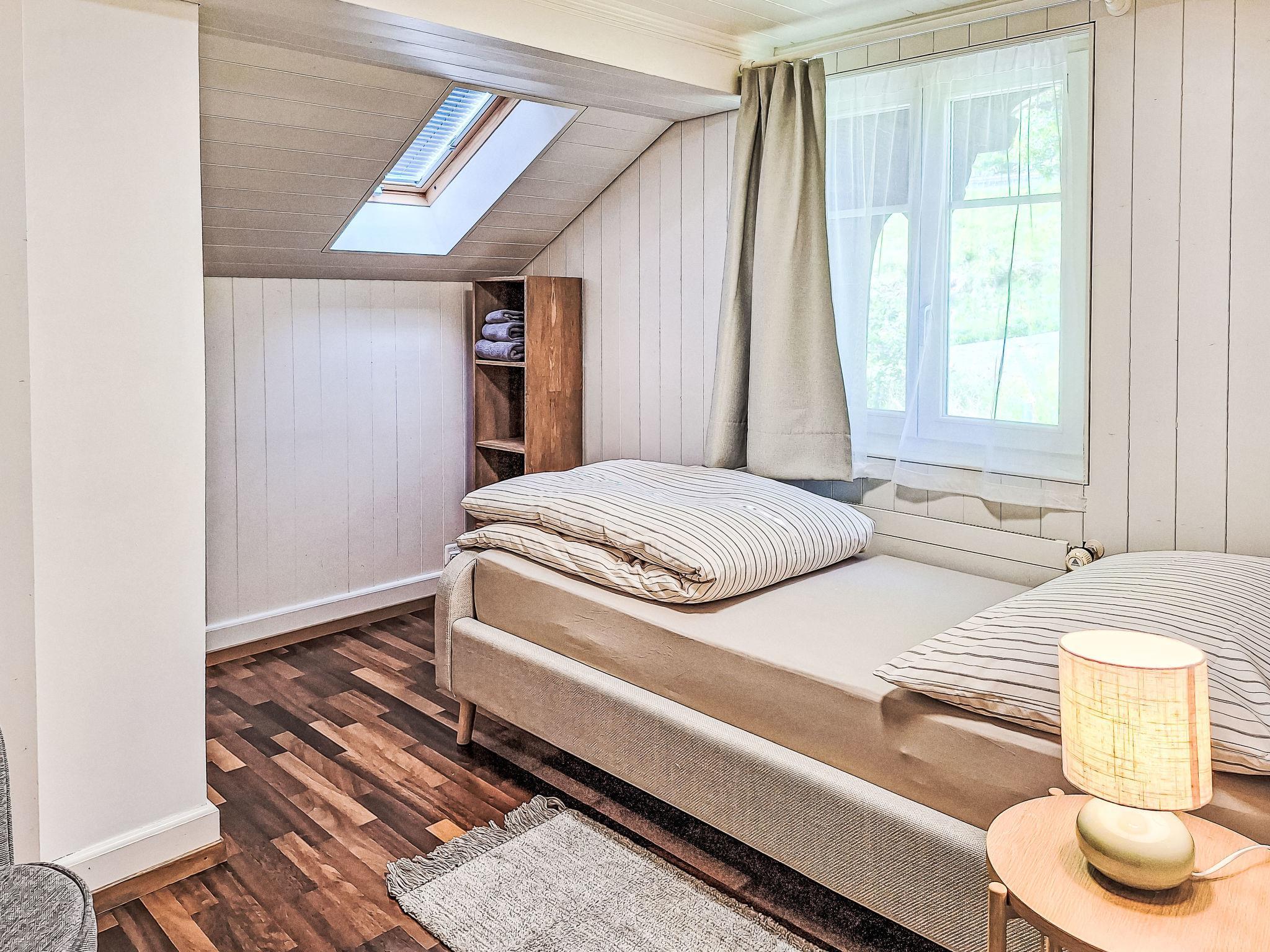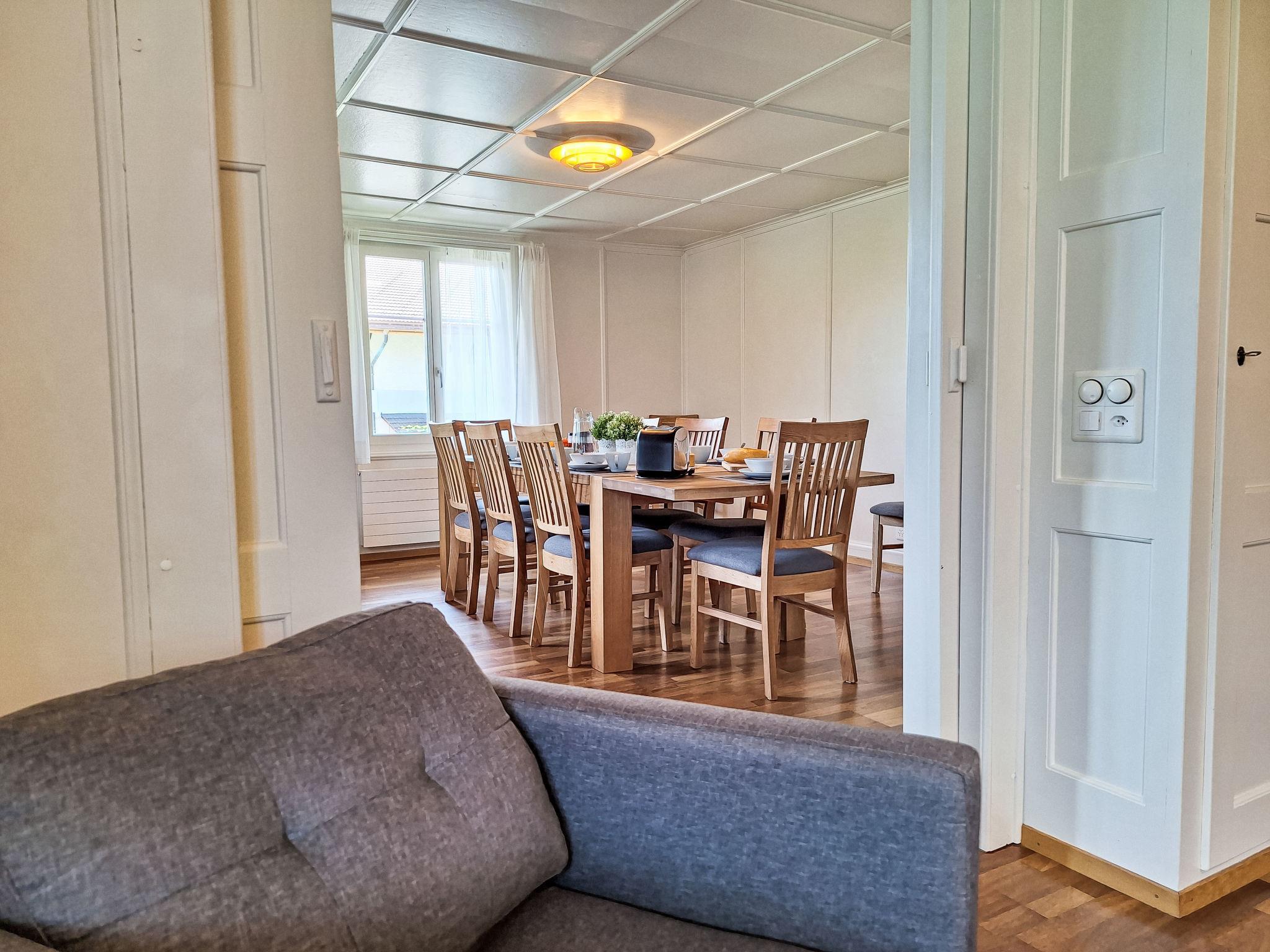 7-room chalet on 3 levels. Spacious and bright, comfortable and cosy furnishings: living room with Scandinavian wood stove and cable TV. Open dining room with sliding door. Exit to the balcony. Kitchen (oven, dishwasher, 4 ceramic glass hob hotplates, toaster, kettle, microwave, electric coffee machine, Capsules for coffee machine (Nespresso) extra, raclette grill). Exit to the balcony. Sep. WC. On the lower ground floor: 2 rooms, each room with 1 double bed (180 cm, length 200 cm). Shower/WC. Upper floor: 2 rooms, each room with 1 bed (90 cm, length 200 cm). 1 large double bedroom with 1 double bed (180 cm, length 200 cm). Exit to the balcony. Bath/shower/WC, double hand-basin. 2 balconies, south facing position, small balcony, west facing position. Marvellous view of the lake, the mountains and the countryside. Facilities: hair dryer. Internet (WiFi). Please note: non-smoking house. Smoke alarm, fire extinguisher. Property is located directly on the lake, not fenced.